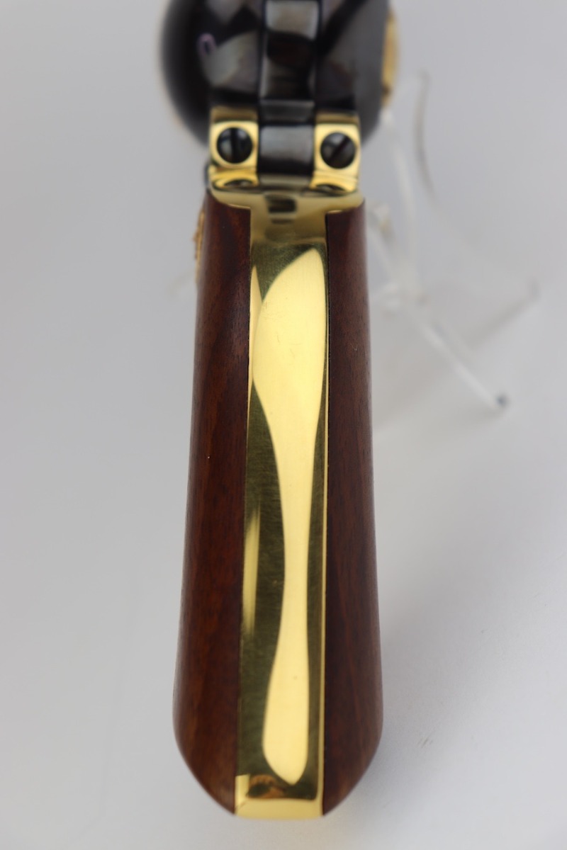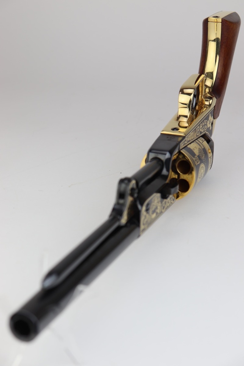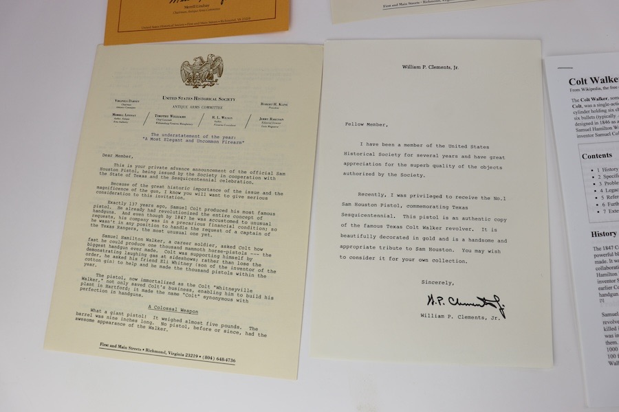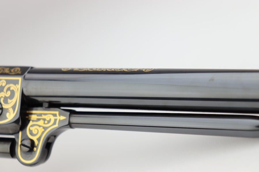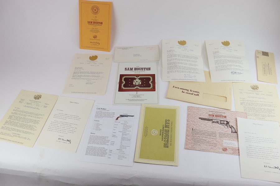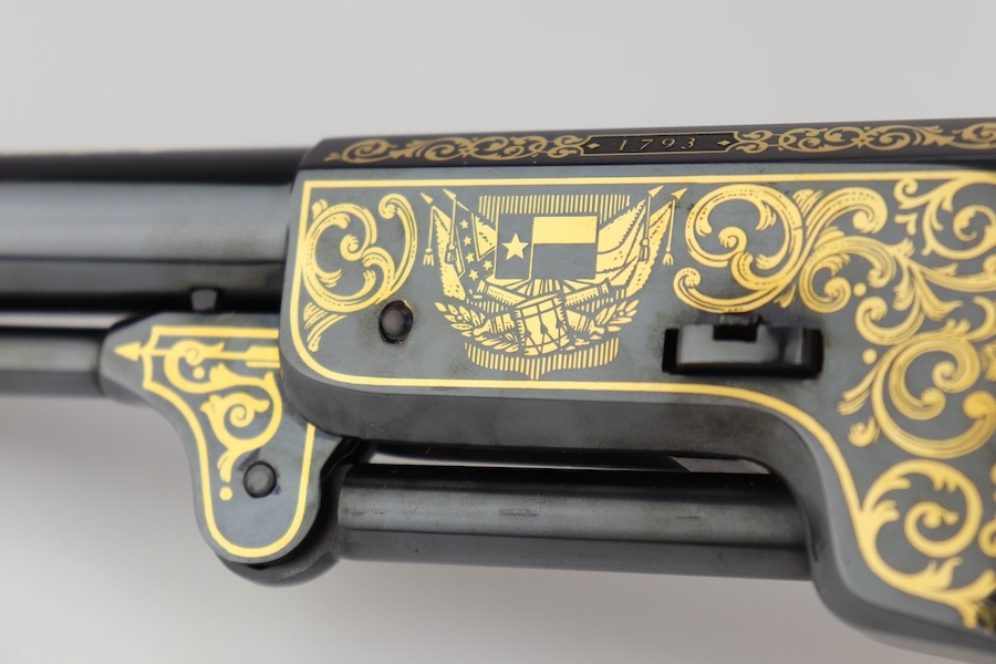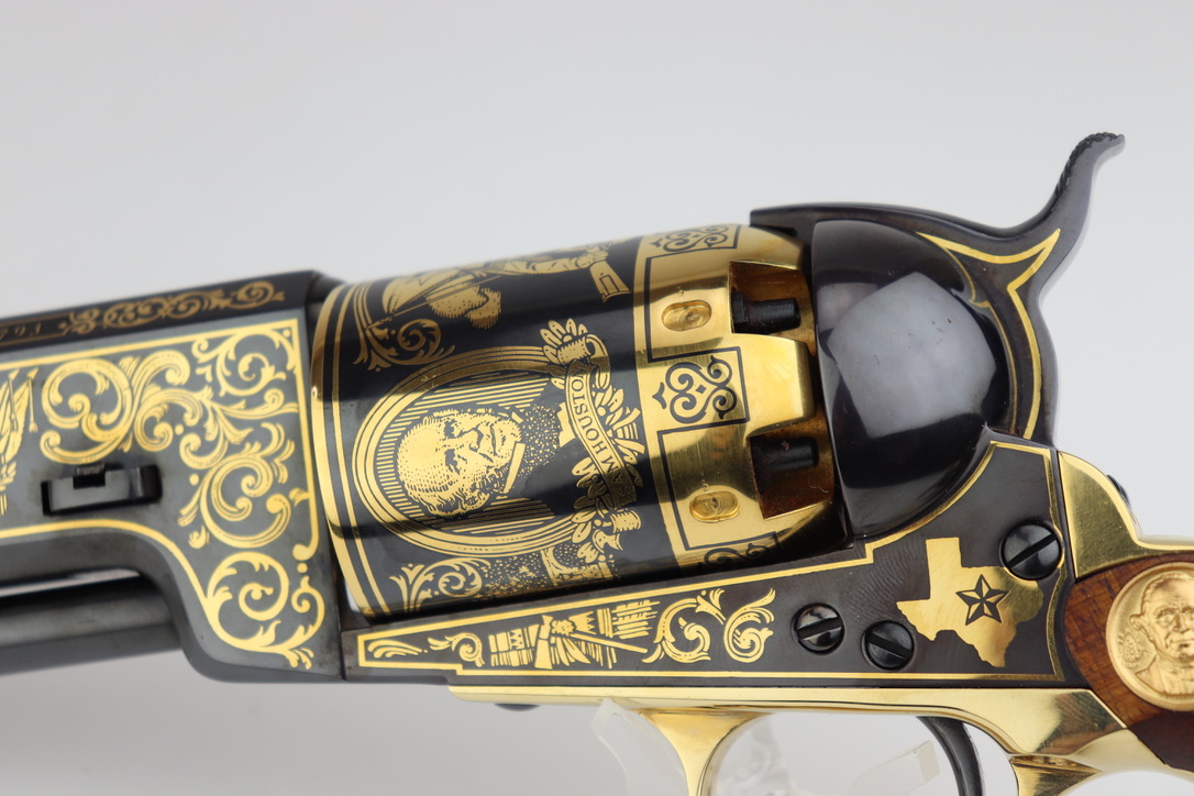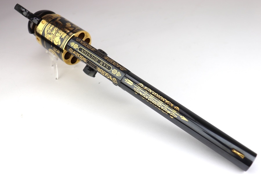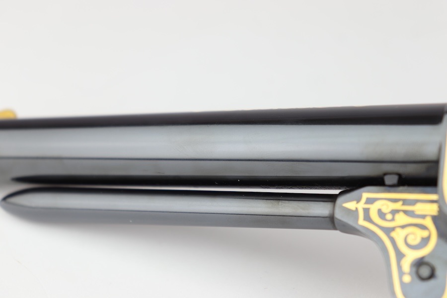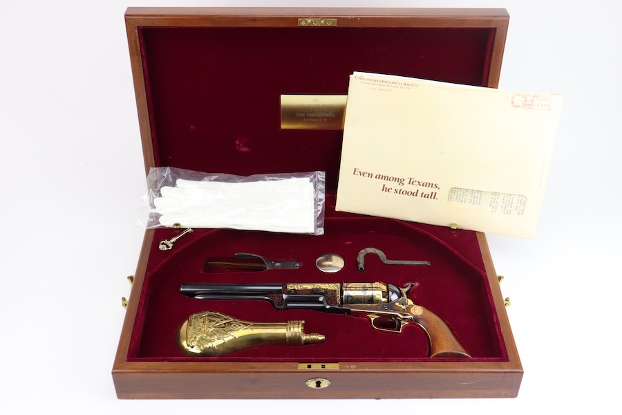 1/5/24 – This is a stunning example of the commemorative series of revolvers made by the United States’ historical society. This is a replica of the Colt model 1847 Walker revolver, famously carried by the Texas Rangers. This revolver retains 99% of its original bluing finish with only a few tiny dots of patina on the top of the revolver under the name Sam. 10/10 mint bore. A gorgeous gold inlay pattern appears throughout the barrel and cylinder. Functionality is top tier with a custom fit and finish with all moving parts. The revolver includes the original display box, bullet mold, percussion cap storage tin, takedown tool, a brass embossed powder flask, and an array of original letters and documents.