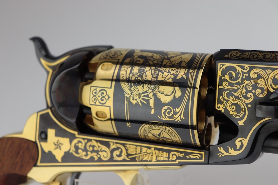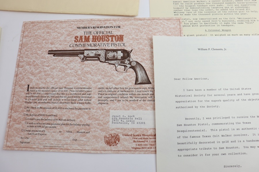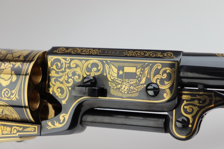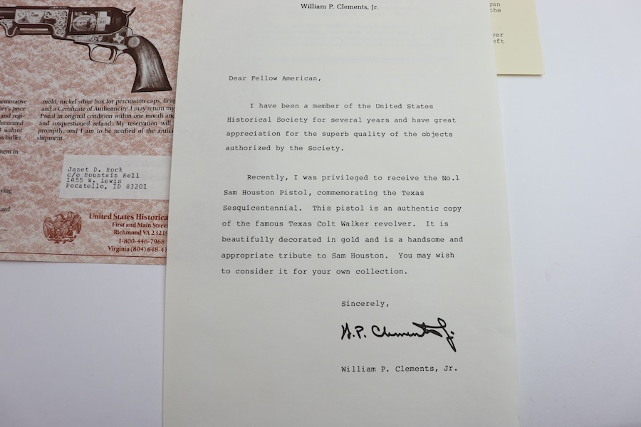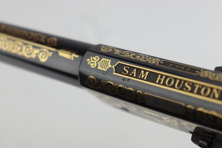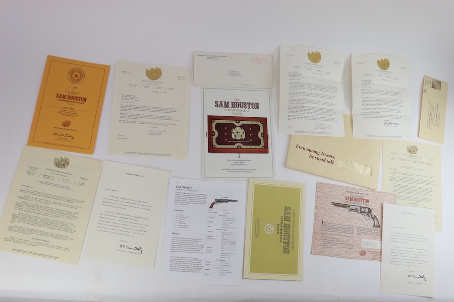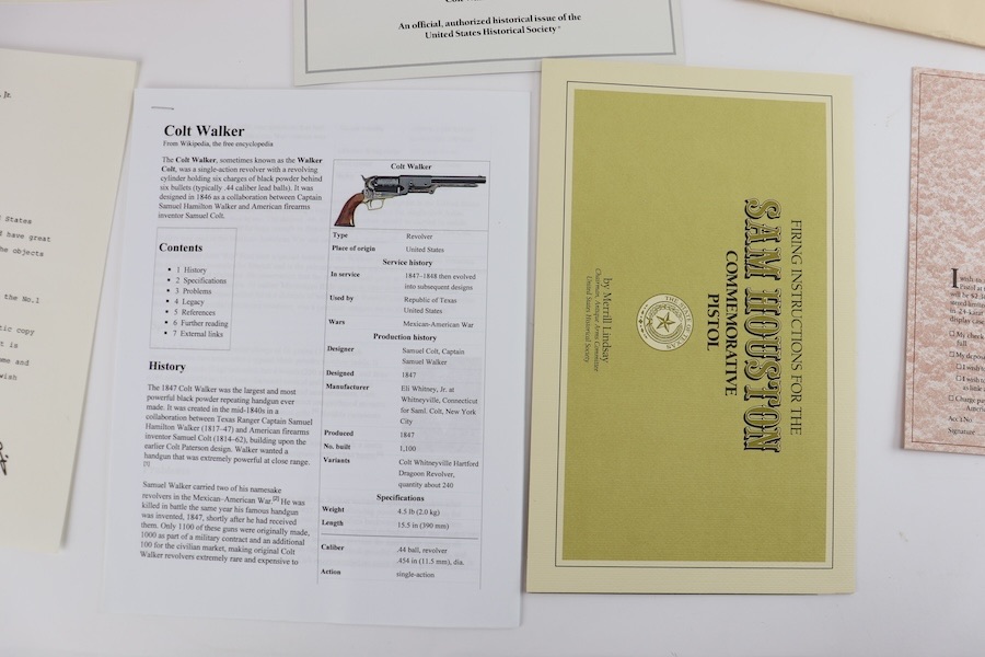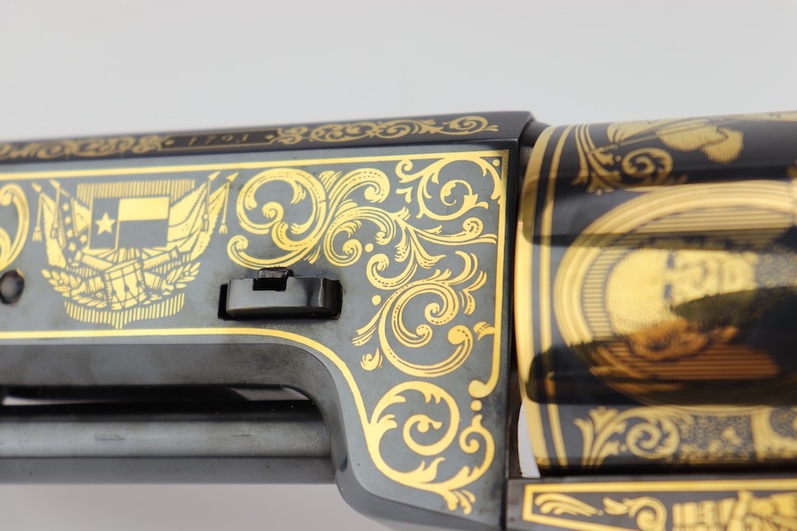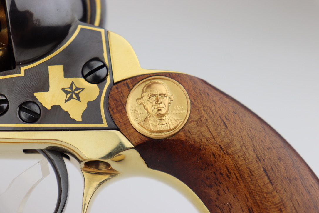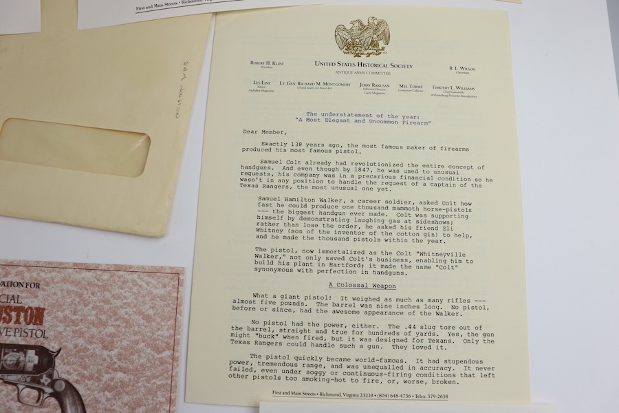 1/5/24 – This is a stunning example of the commemorative series of revolvers made by the United States’ historical society. This is a replica of the Colt model 1847 Walker revolver, famously carried by the Texas Rangers. This revolver retains 99% of its original bluing finish with only a few tiny dots of patina on the top of the revolver under the name Sam. 10/10 mint bore. A gorgeous gold inlay pattern appears throughout the barrel and cylinder. Functionality is top tier with a custom fit and finish with all moving parts. The revolver includes the original display box, bullet mold, percussion cap storage tin, takedown tool, a brass embossed powder flask, and an array of original letters and documents.