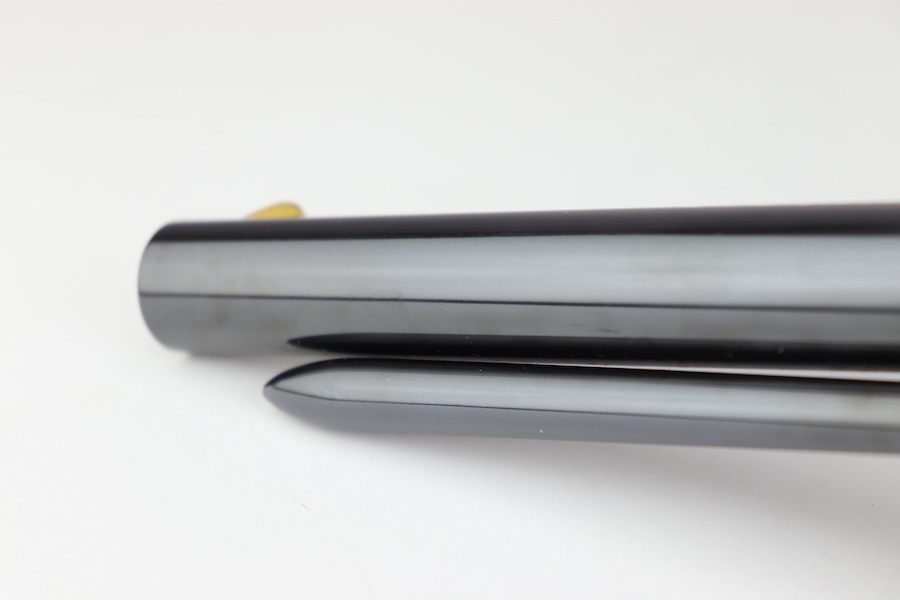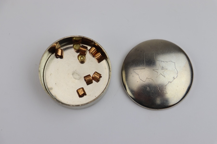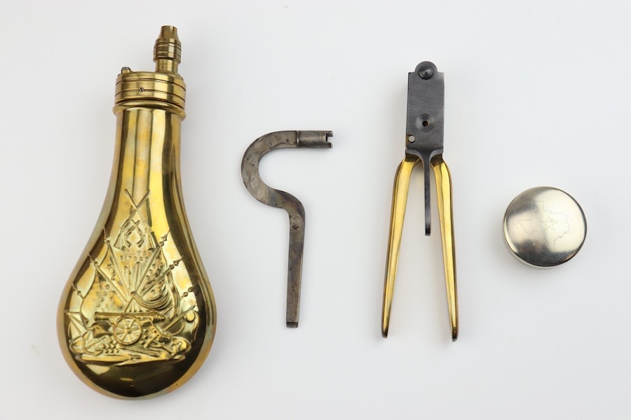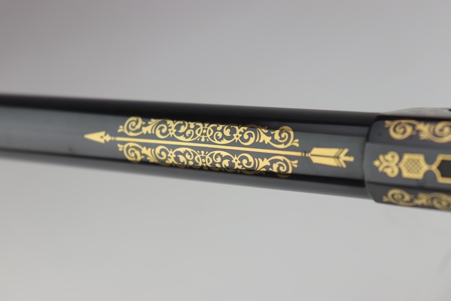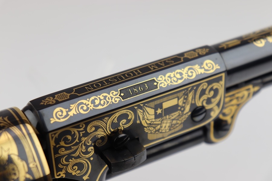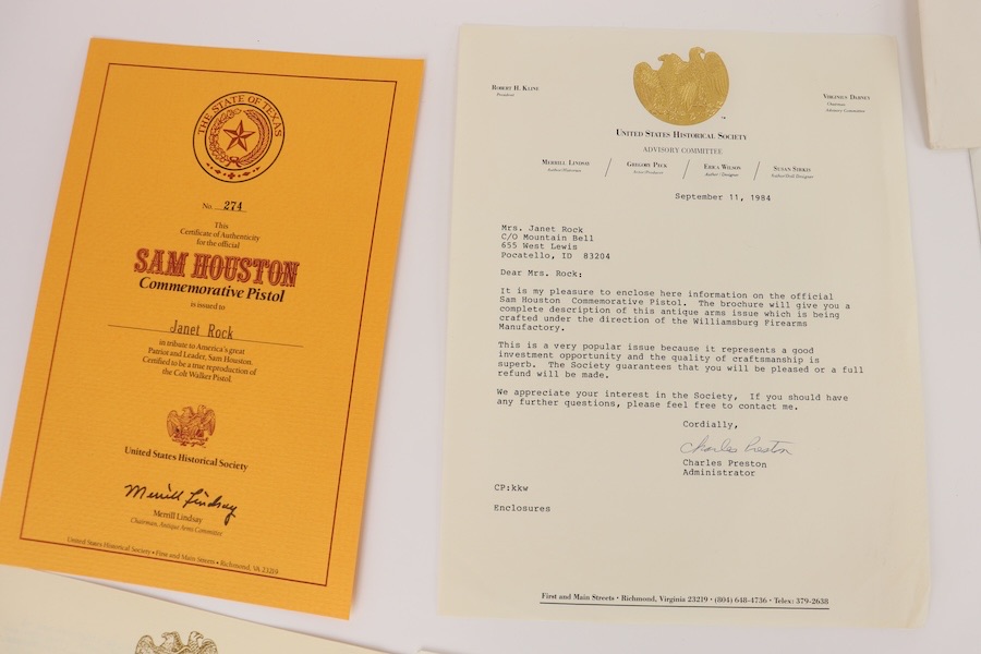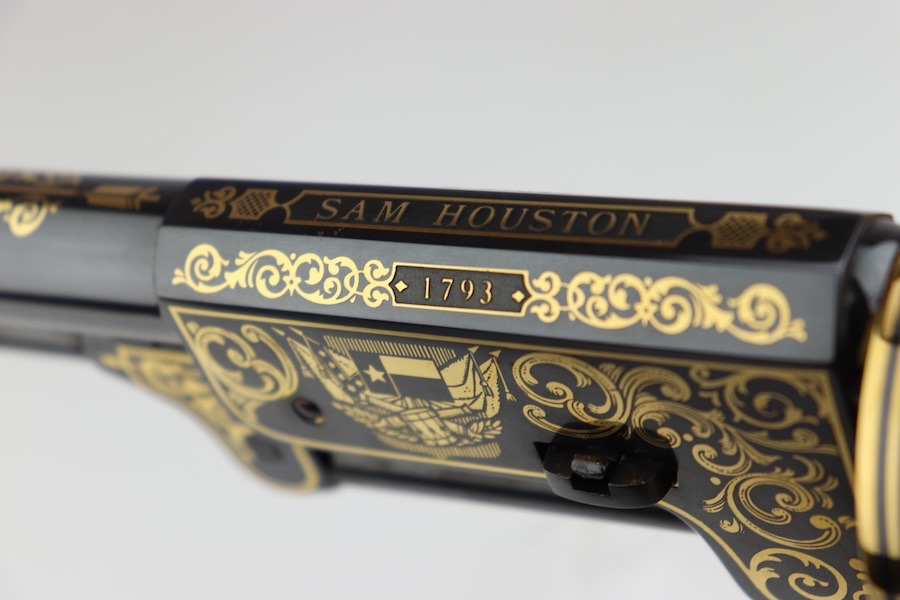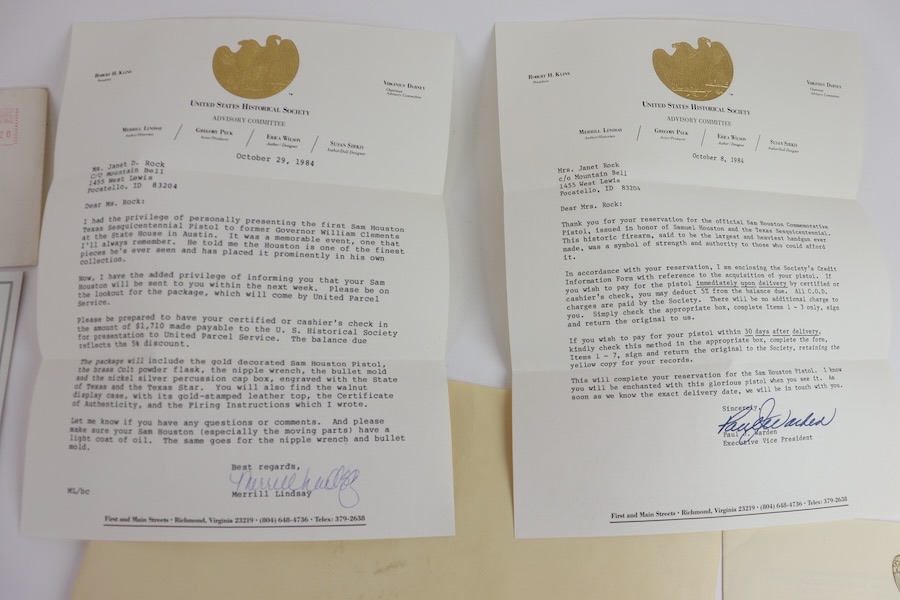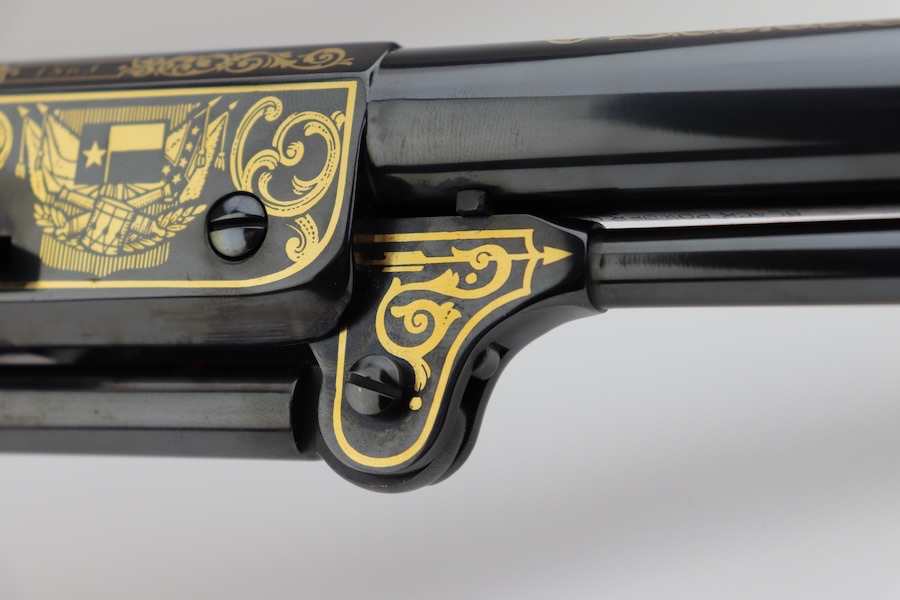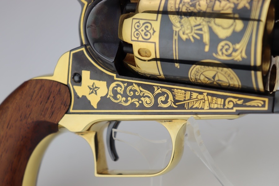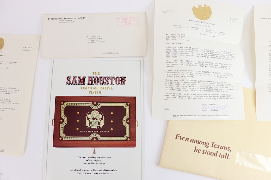 1/5/24 – This is a stunning example of the commemorative series of revolvers made by the United States’ historical society. This is a replica of the Colt model 1847 Walker revolver, famously carried by the Texas Rangers. This revolver retains 99% of its original bluing finish with only a few tiny dots of patina on the top of the revolver under the name Sam. 10/10 mint bore. A gorgeous gold inlay pattern appears throughout the barrel and cylinder. Functionality is top tier with a custom fit and finish with all moving parts. The revolver includes the original display box, bullet mold, percussion cap storage tin, takedown tool, a brass embossed powder flask, and an array of original letters and documents.