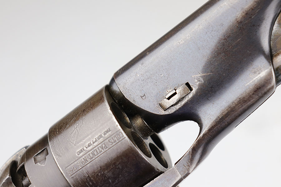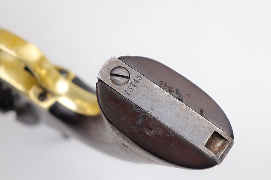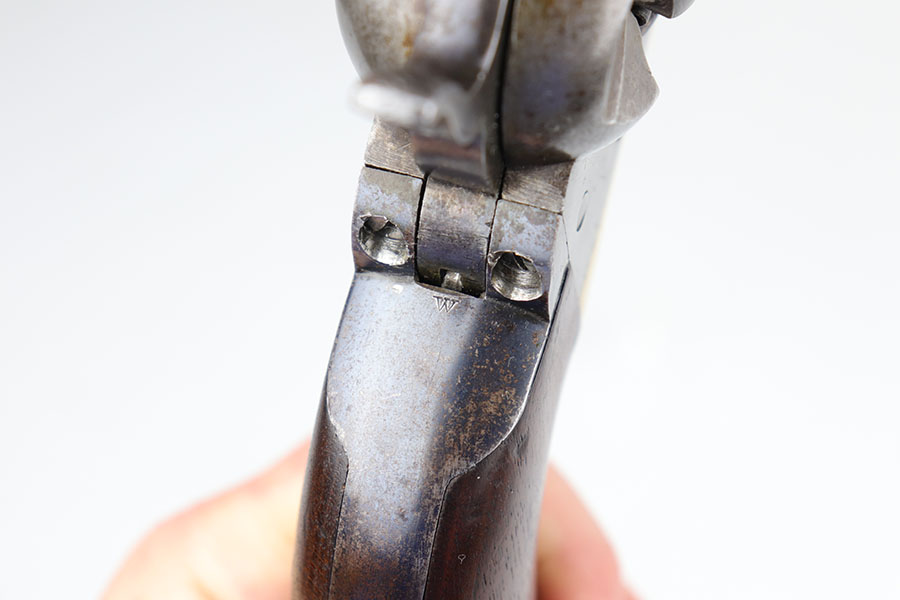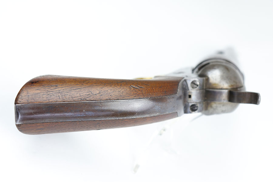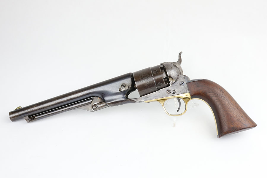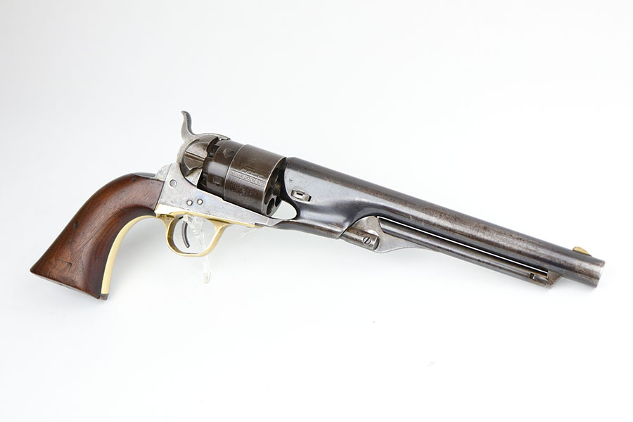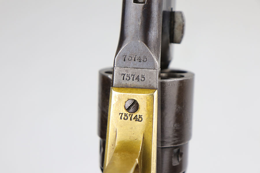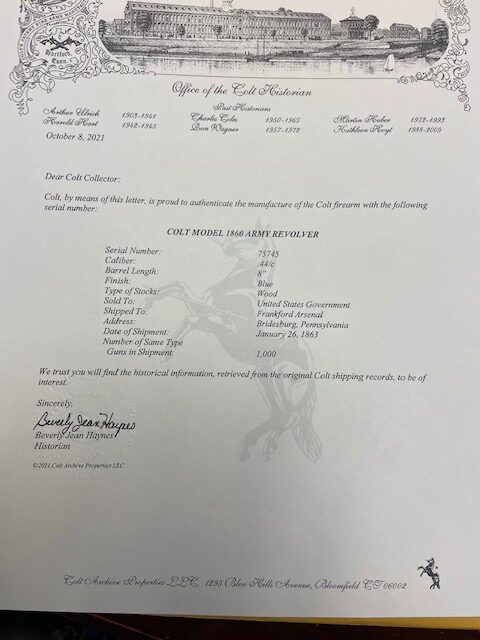 4/20/22 – This is an original Colt 1860 Army revolver, manufactured in 1862. The finish shows some obvious thinning in most areas but is in pretty good condition given the age. The bore is near-mint and about as nice as you’ll see for this model. Inspector markings visible on frame and barrel, as well as cartouches on grip panels. Parts are all matching, including the wedge. Couple of minor dings on the trigger guard. The listing includes the Colt archive letter stating it was shipped to Frankford Arsenal in 1863, so this one served for the Union Army. A copy of Pate’s book on the Colt Model 1860 Army Revolver is also included with this listing. Antique so no license required.