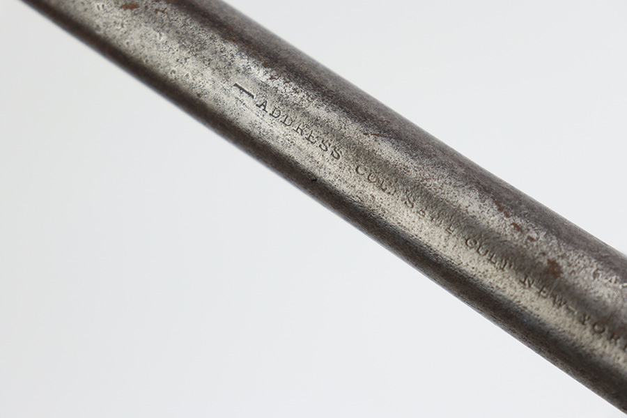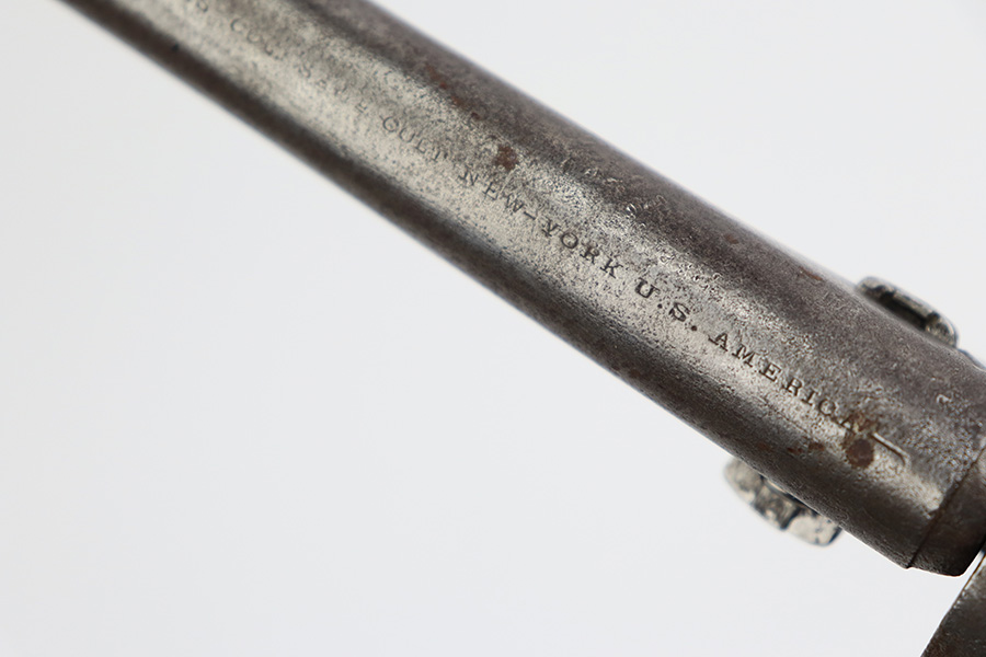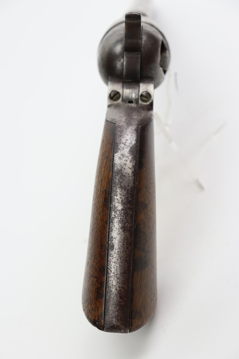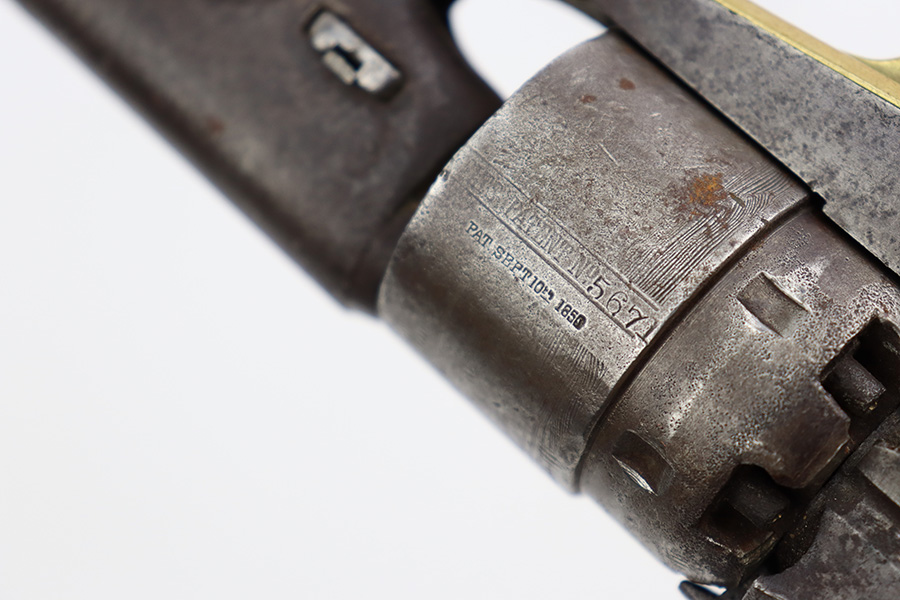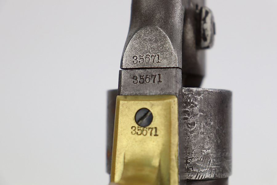 7/10/23 – This is a nice example of a Colt Model 1860 Army Revolver, manufactured in 1862 and chambered in .44 Caliber. All matching with the proper Naval engagement scene on the cylinder. The gun has no finish. There are areas of minor pitting and spotty oxidation throughout. The oxidation is most noticeable along the barrel. A series of small dings on the cylinder. Fitted with period-correct wood grips – there is some minor chipping and bruising on the bottom edges. The bore has good rifling, but there is light surface oxidation throughout.