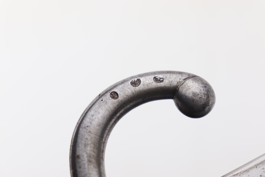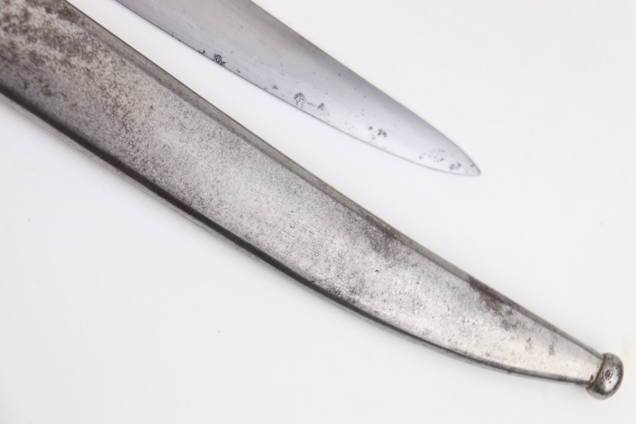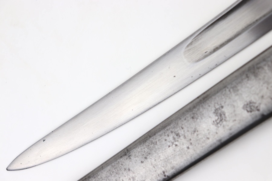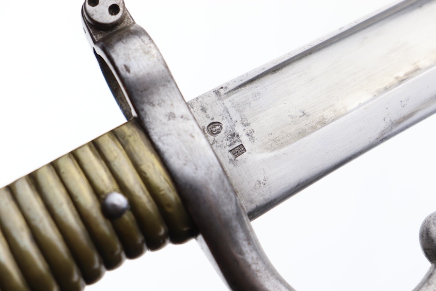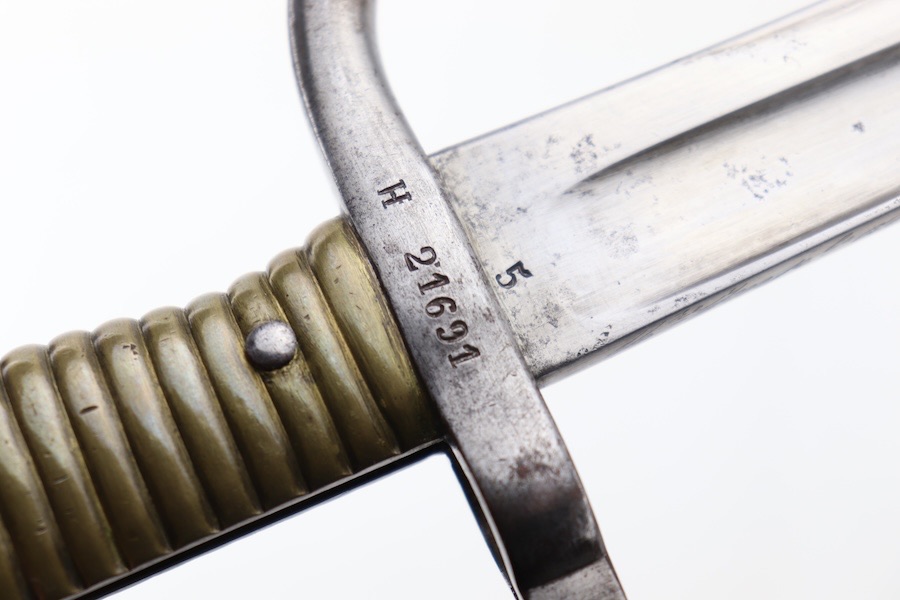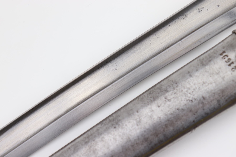 3/22/24 – This an original and good condition model 1868 French Chassepot bayonet. This example was produced in 1868 at the St. Etienne state arsenal and comes with the original matching scabbard. That scabbard is missing nearly all of its original blued finish but is free from dents, rust, or pitting. The blade itself has a few small pin-pricking spots and a few very light spots of pitting near the tip on the right side with no active surface rust. The crossguard does not retain any of its finish, but all the markings are crisp and clear. The solid brass handle has a dull look and a few tiny knicks here and there. Overall a relatively nice and matching example.