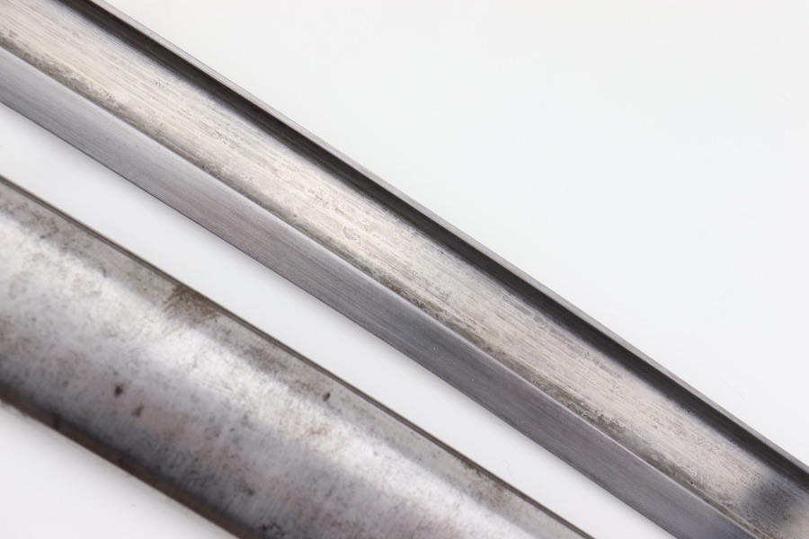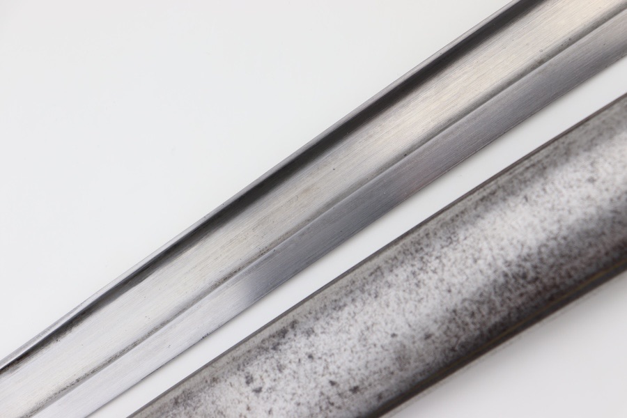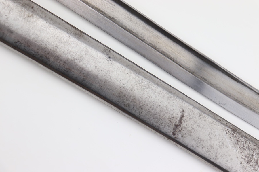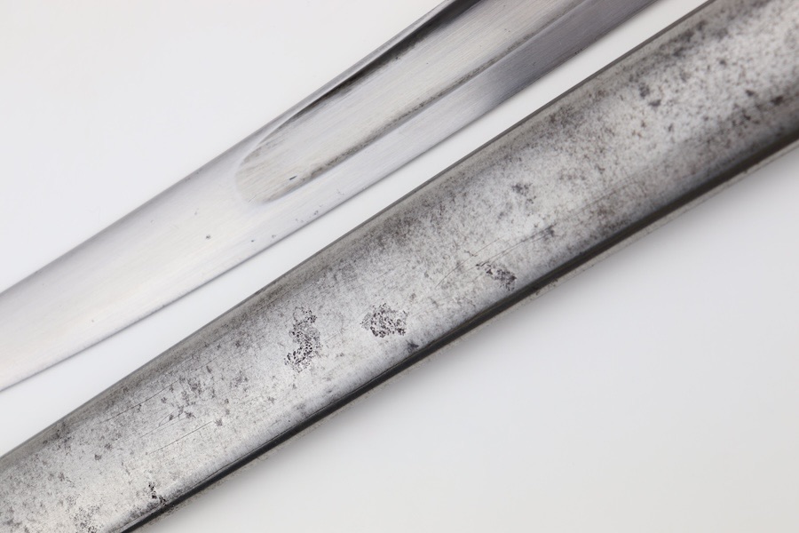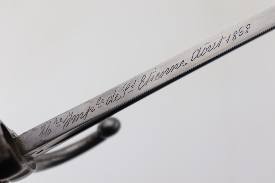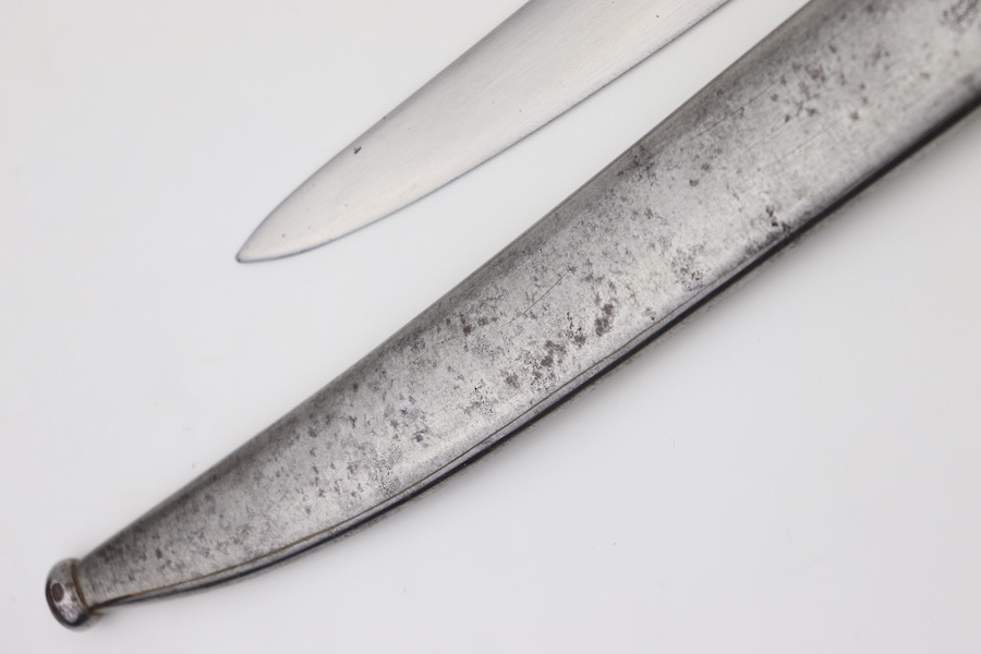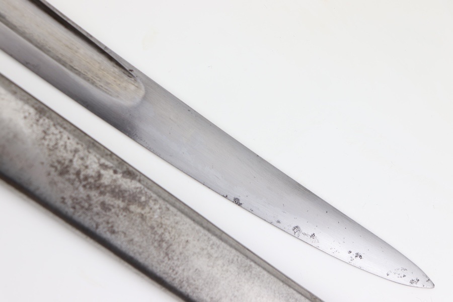 3/22/24 – This an original and good condition model 1868 French Chassepot bayonet. This example was produced in 1868 at the St. Etienne state arsenal and comes with the original matching scabbard. That scabbard is missing nearly all of its original blued finish but is free from dents, rust, or pitting. The blade itself has a few small pin-pricking spots and a few very light spots of pitting near the tip on the right side with no active surface rust. The crossguard does not retain any of its finish, but all the markings are crisp and clear. The solid brass handle has a dull look and a few tiny knicks here and there. Overall a relatively nice and matching example.
