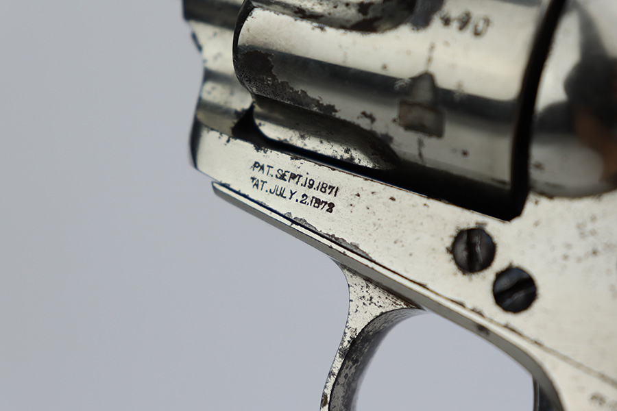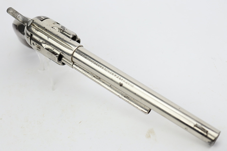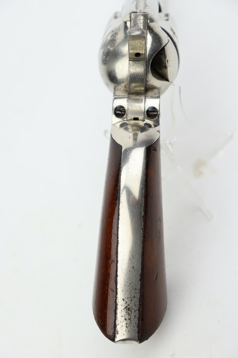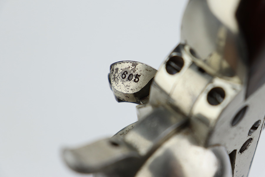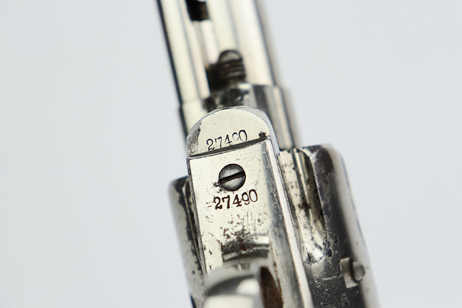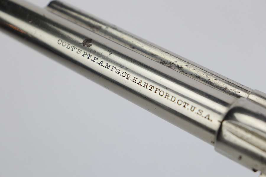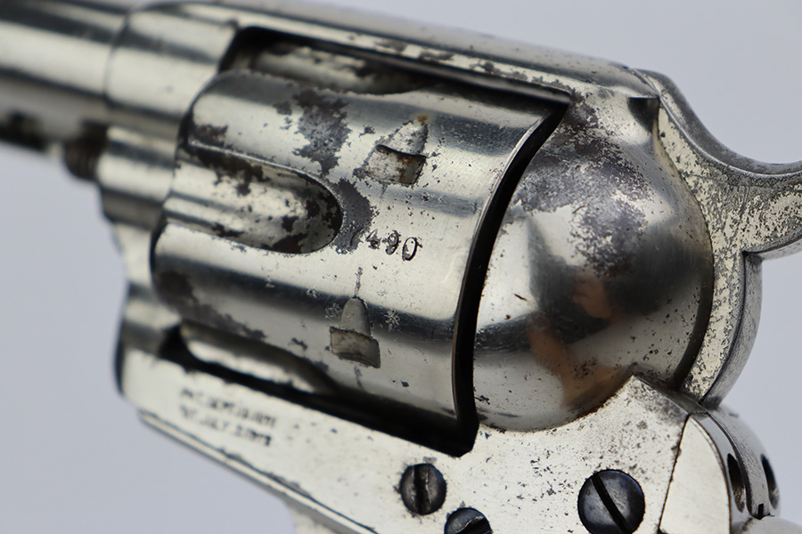8/14/23 – This is a nice example of a Colt Single Action Army, manufactured in 1876. All matching with a 7.5″ barrel. This one has retained roughly 85% of its nickel-plated finish. There is chipping in the finish and spotty oxidation mostly on and around the cylinder. Fitted with nice period-correct wood grips – there are some bruises and scratches on both sides. The bore is shiny for the most part with strong rifling, but there is some light spotty surface oxidation here and there. The cylinder is tight, the timing is good, and the action is smooth.