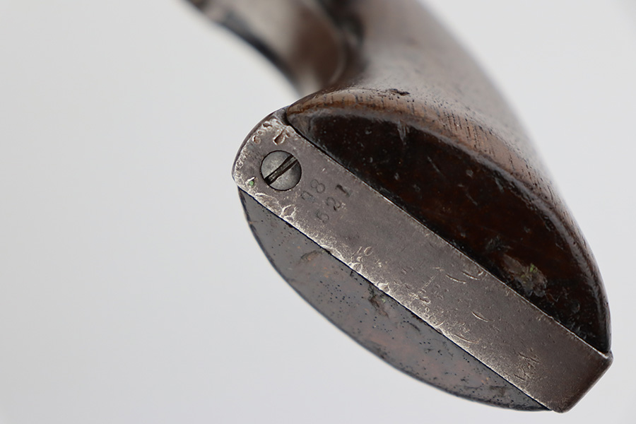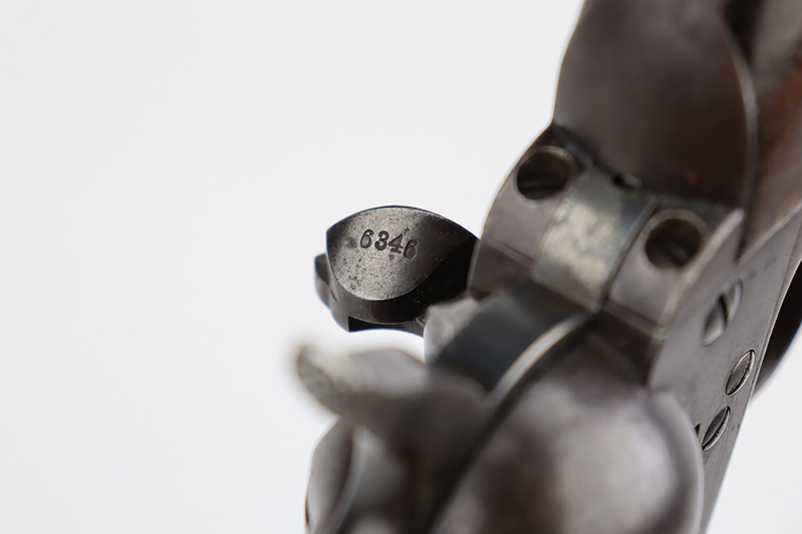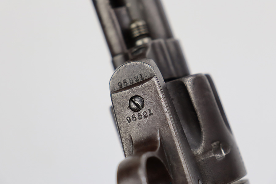 8/14/23 – This is a nice example of a Colt Single Action Army, manufactured in 1883. All matching with a 7.5″ barrel. There is heavy “attic patina” covering all of the metal parts with areas of minor pin-pricking throughout. A series of small dings on the butt of the frame. Fitted with nice period-correct wood grips. The bore has decent rifling, but there is obvious pitting throughout. The cylinder is tight, the timing is good, and the action is smooth.
