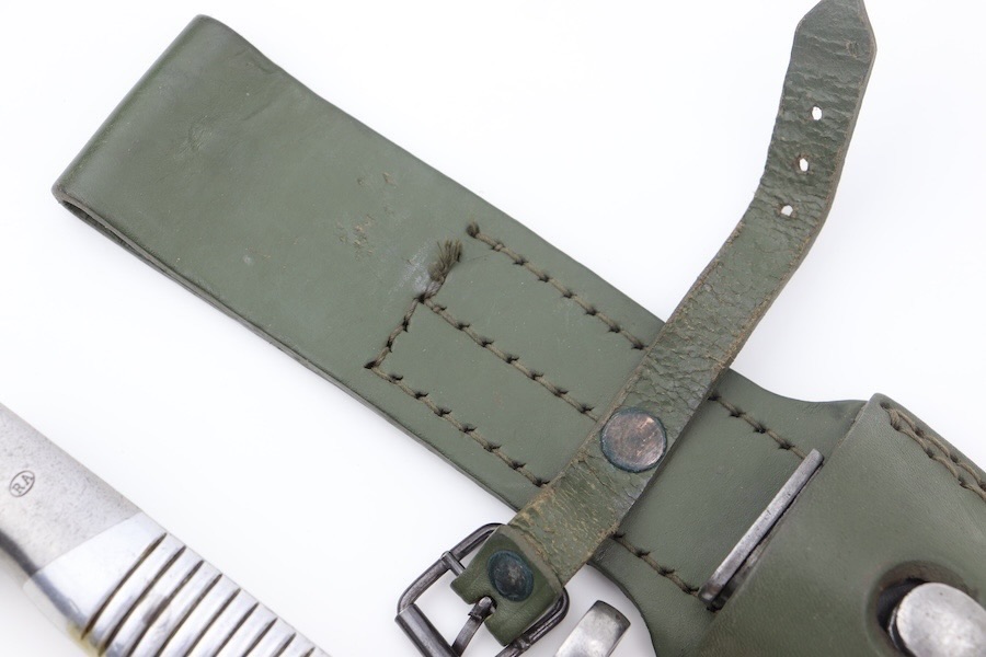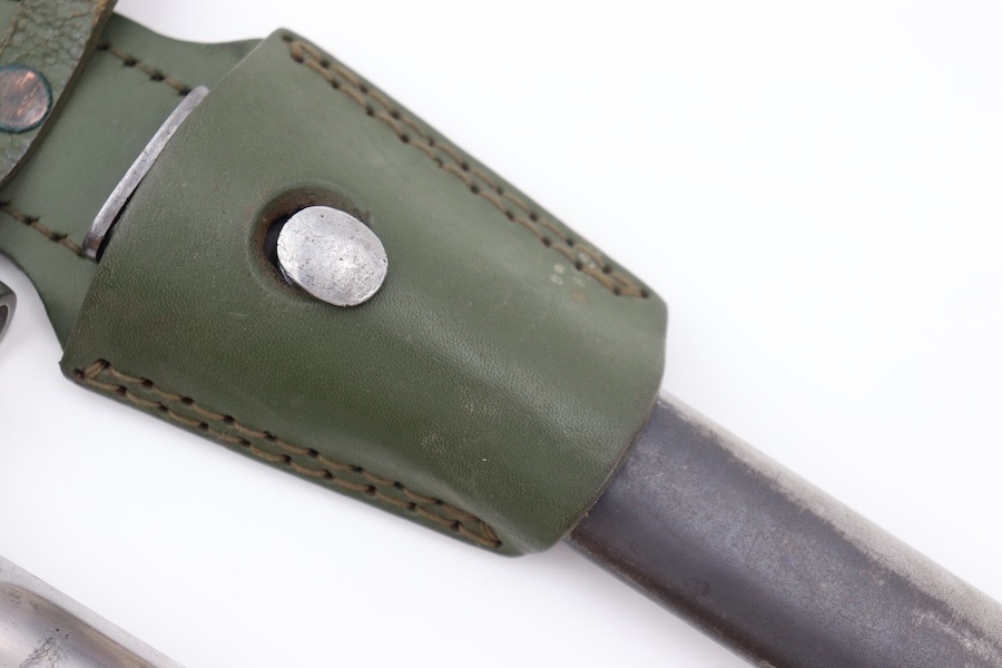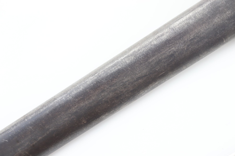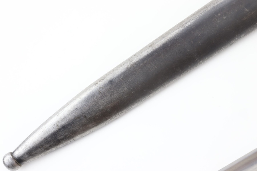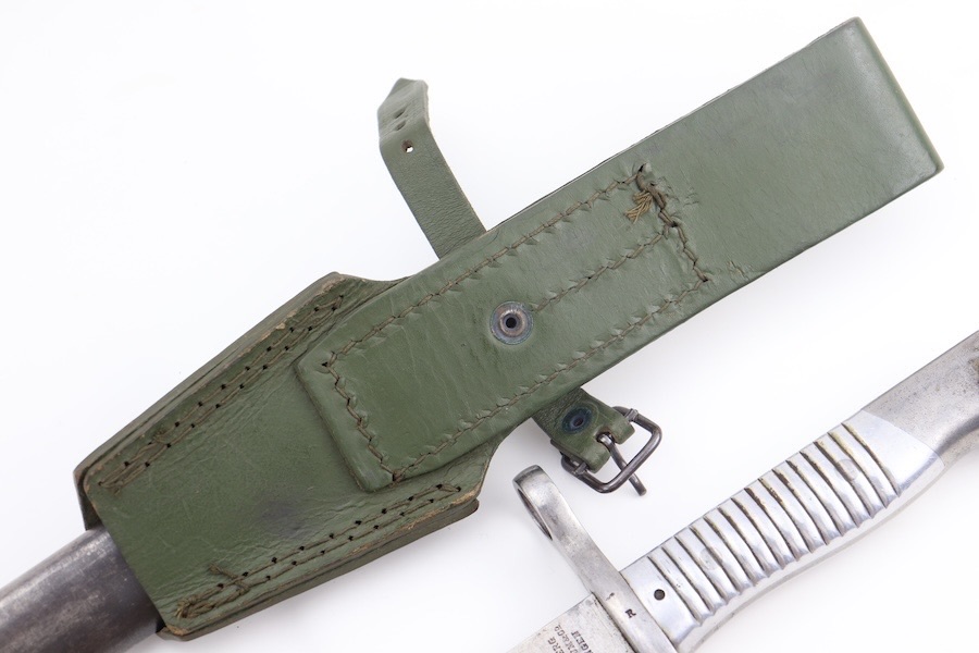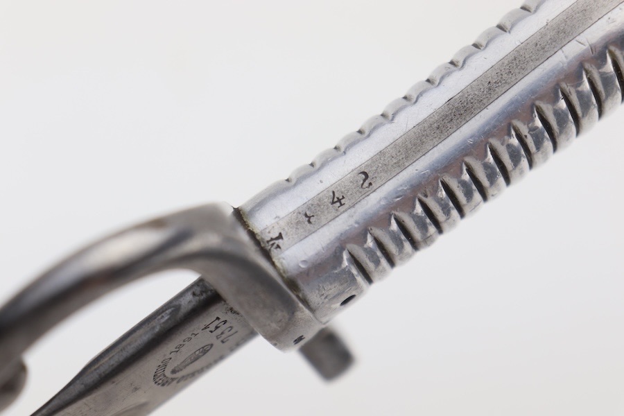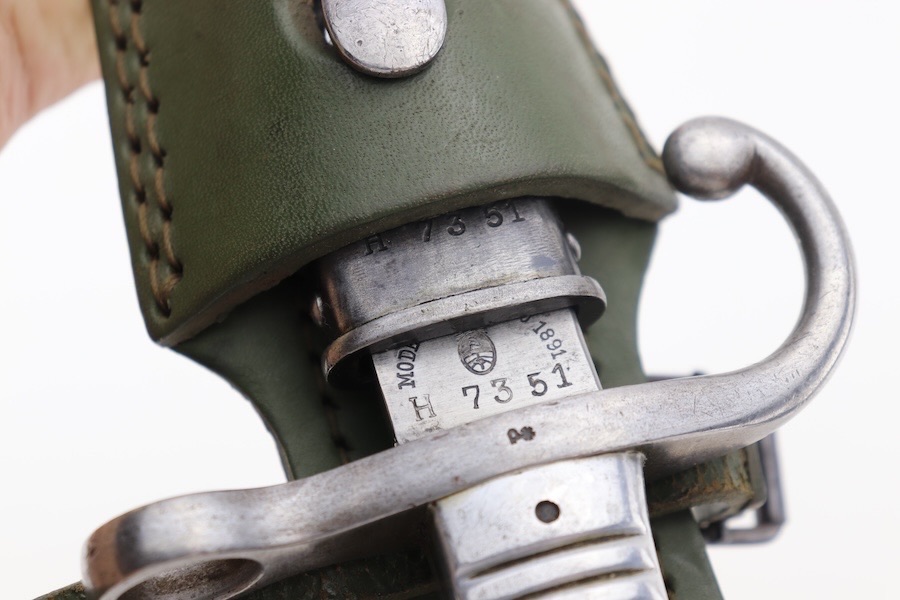 3/12/24 – This is a rare example of an 1891 Argentine Mauser bayonet with the original matching scabbard and intact crest. The green leather frog included is correct, all original, and has tight and complete stitching. The blade is pretty clean but has a few spots of light pitting but no surface rust. The edge has not been sharpened. The ricasso displays a maker stamp, a serial number matching the scabbard (H351), and a fully intact national crest. The aluminum grips show typical surface wear and light scratches, no major issues there. Crossguard and pommel show an honest wear patina. The scabbard retains about 50% of its original bluing finish and is free from dents or cracks.