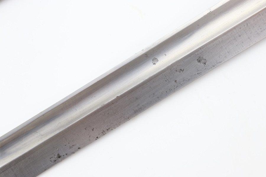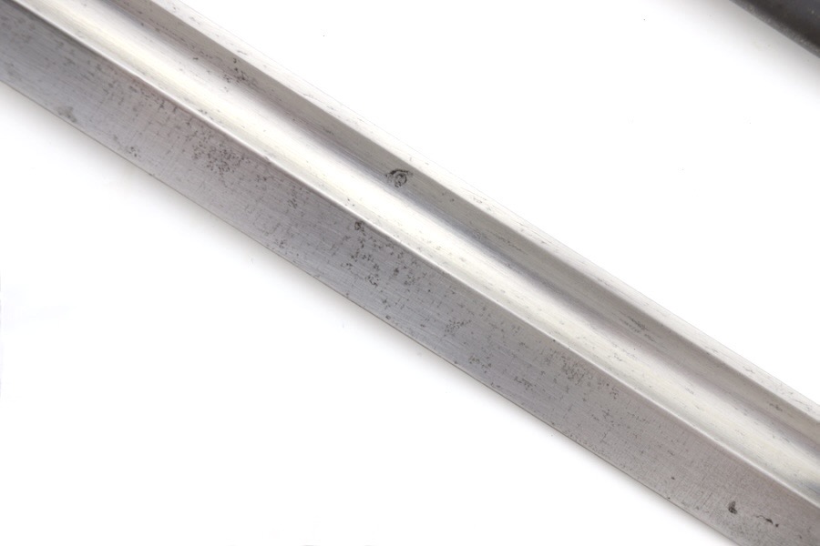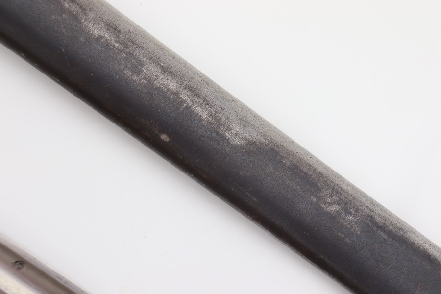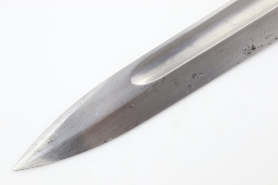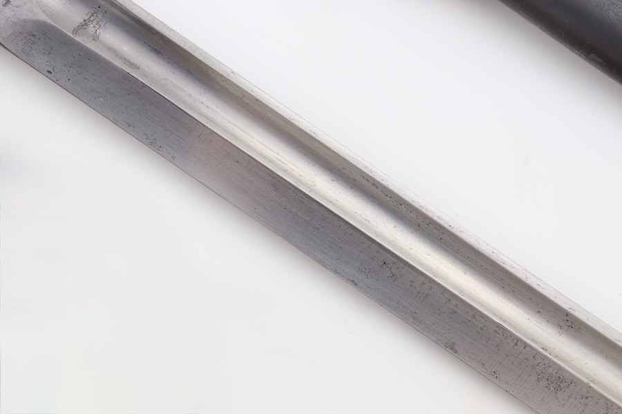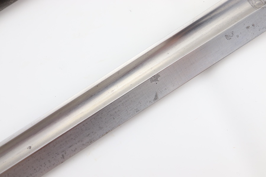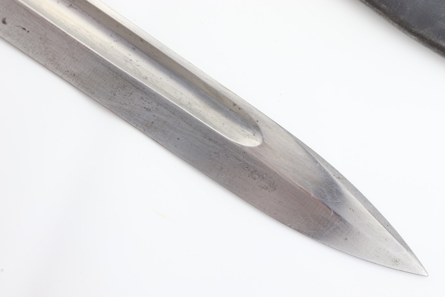 3/12/24 – This is a rare example of an 1891 Argentine Mauser bayonet with the original matching scabbard and intact crest. The green leather frog included is correct, all original, and has tight and complete stitching. The blade is pretty clean but has a few spots of light pitting but no surface rust. The edge has not been sharpened. The ricasso displays a maker stamp, a serial number matching the scabbard (H351), and a fully intact national crest. The aluminum grips show typical surface wear and light scratches, no major issues there. Crossguard and pommel show an honest wear patina. The scabbard retains about 50% of its original bluing finish and is free from dents or cracks.