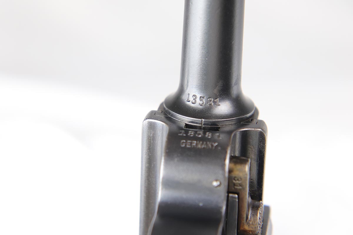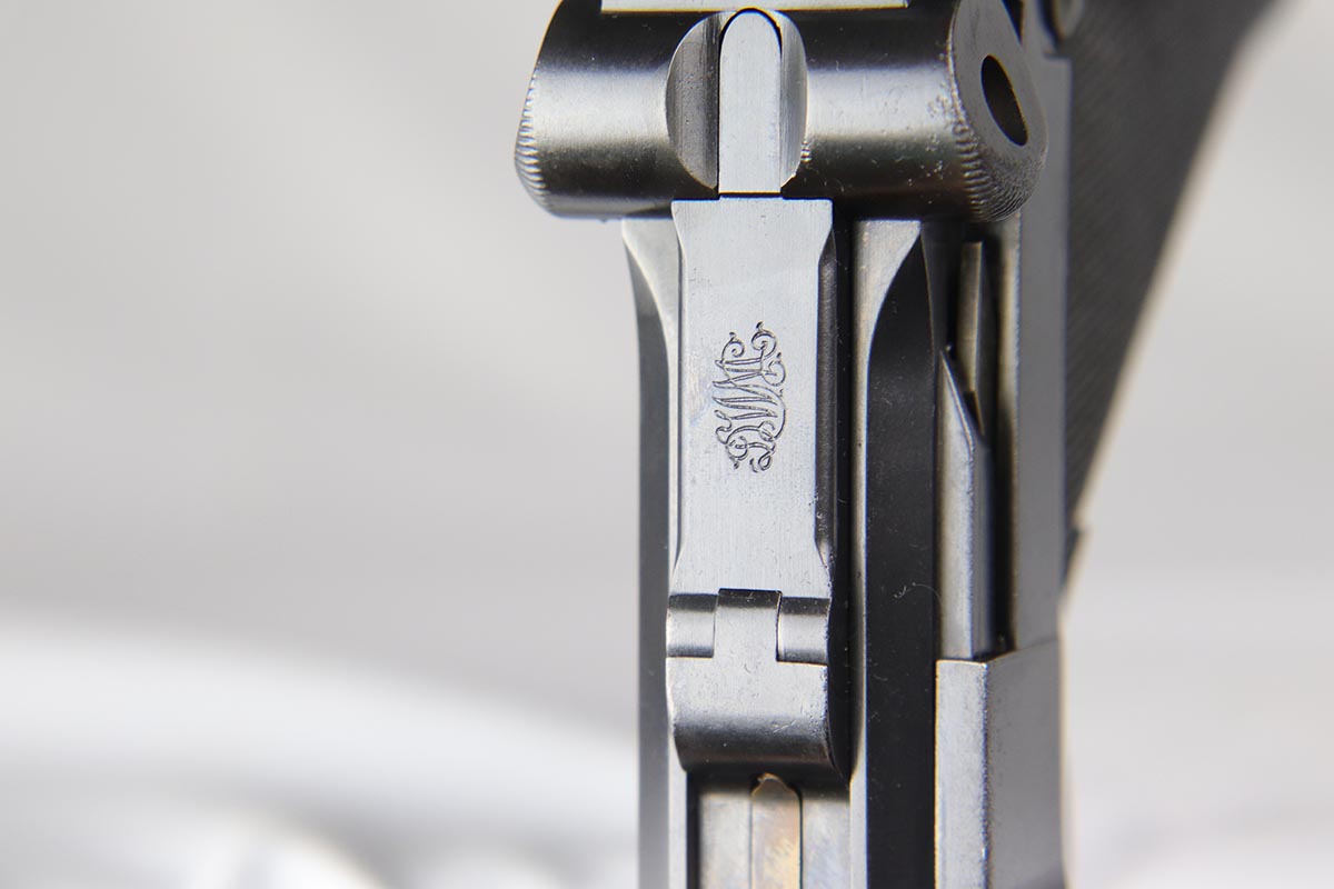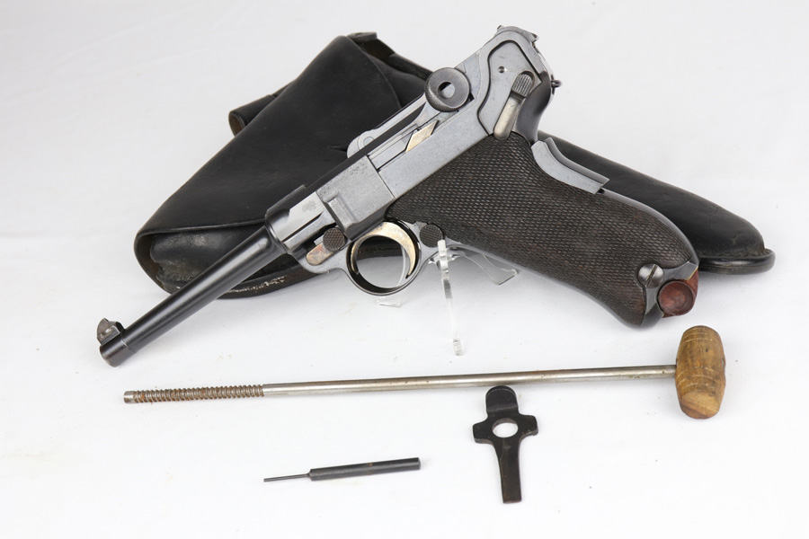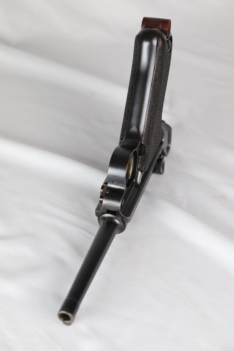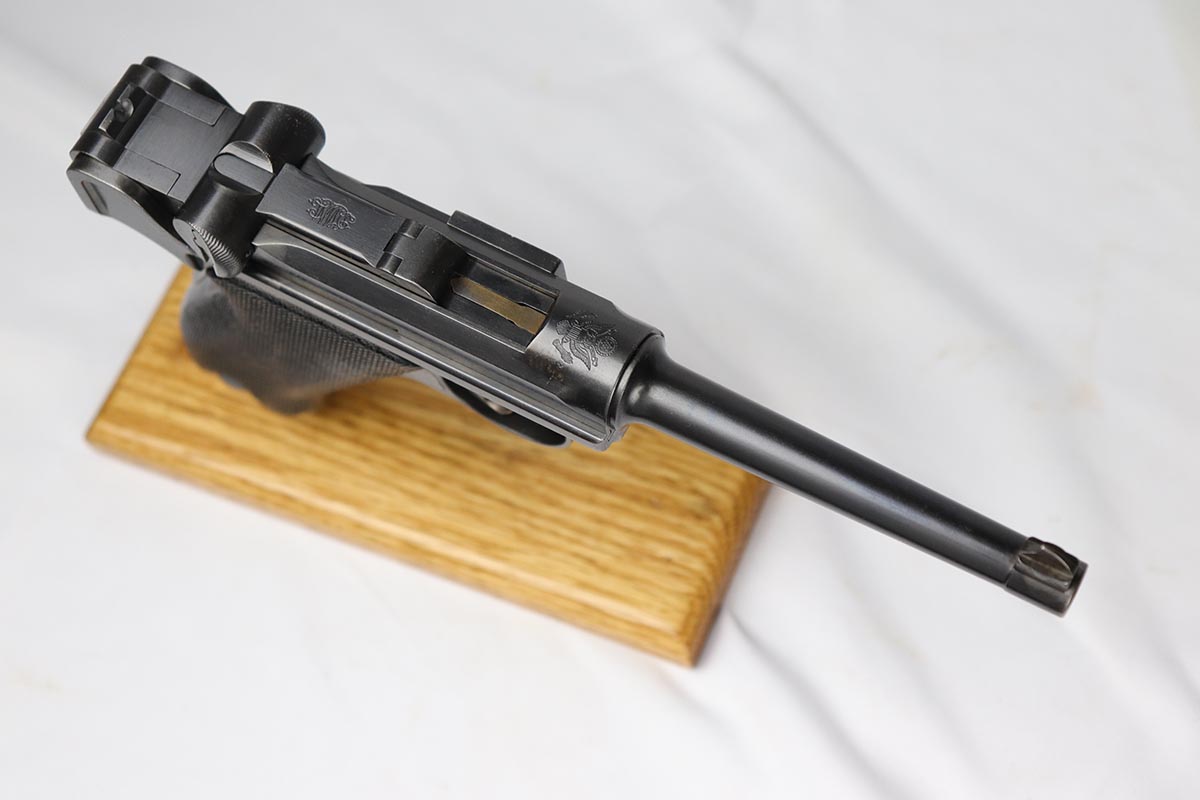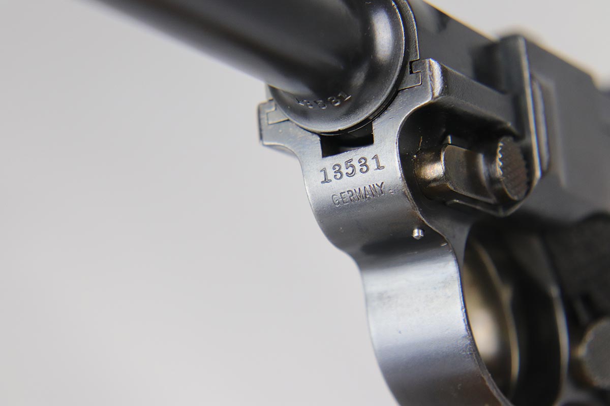 12/4/18 – This is a rare DWM model 1900 luger with American Eagle crest on the chamber. This is the first production model of this variation, made in or around 1900 with early dish toggle. These pistols went to the US retail market and the manufacturers at DWM realized that nation-based crests increased sales of these lugers, so that is why you find the American Eagle over the chamber. This is also why you see GERMANY marked on the frame, denoting these were exported for commercial sale. This pistol is in very good condition, but may be an old re-blue or may have been touched up, as there appears to bluing in some of the pinpricking on the left side. All matching numbers on the pistol with correct blank-bottom wood magazine. Bore has some corrosion throughout. Wood grips are numbered to each other but not the pistol. Comes with an original holster, pin and cleaning rod. Also comes with a waffen proofed luger tool but I don’t believe that proof to be original. Comes with a free certificate of authenticity.