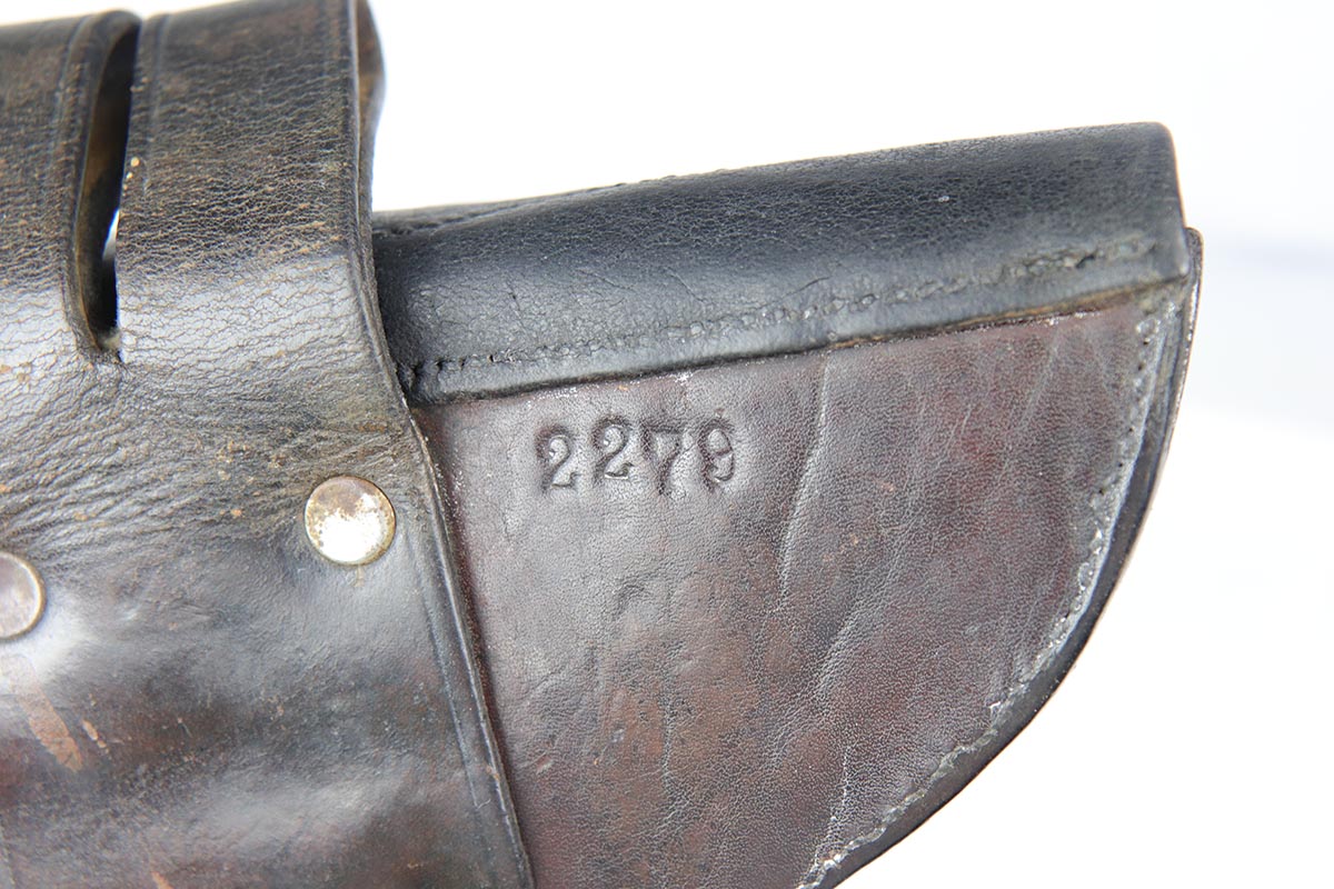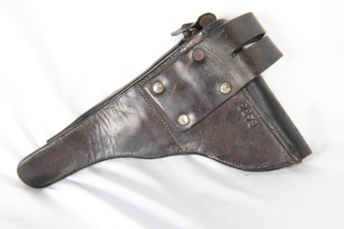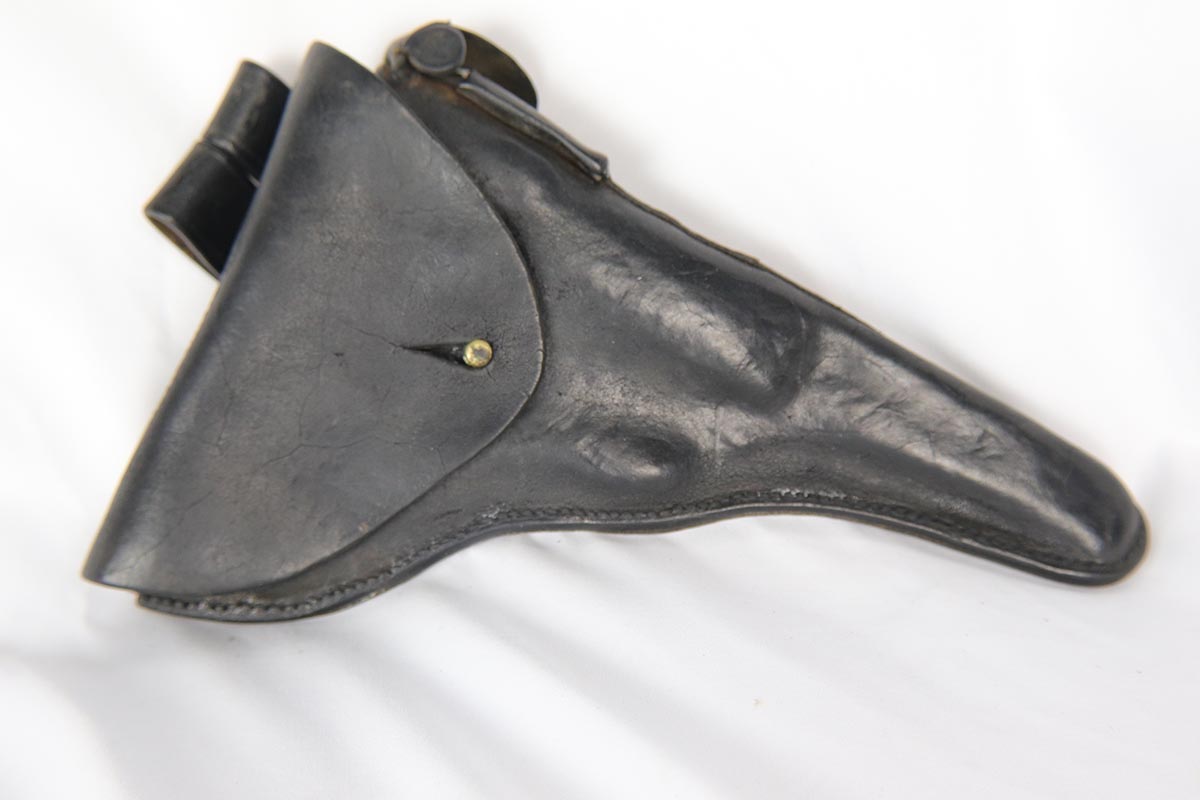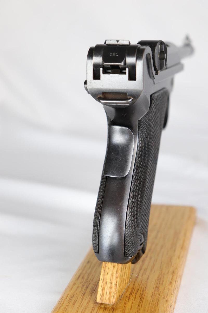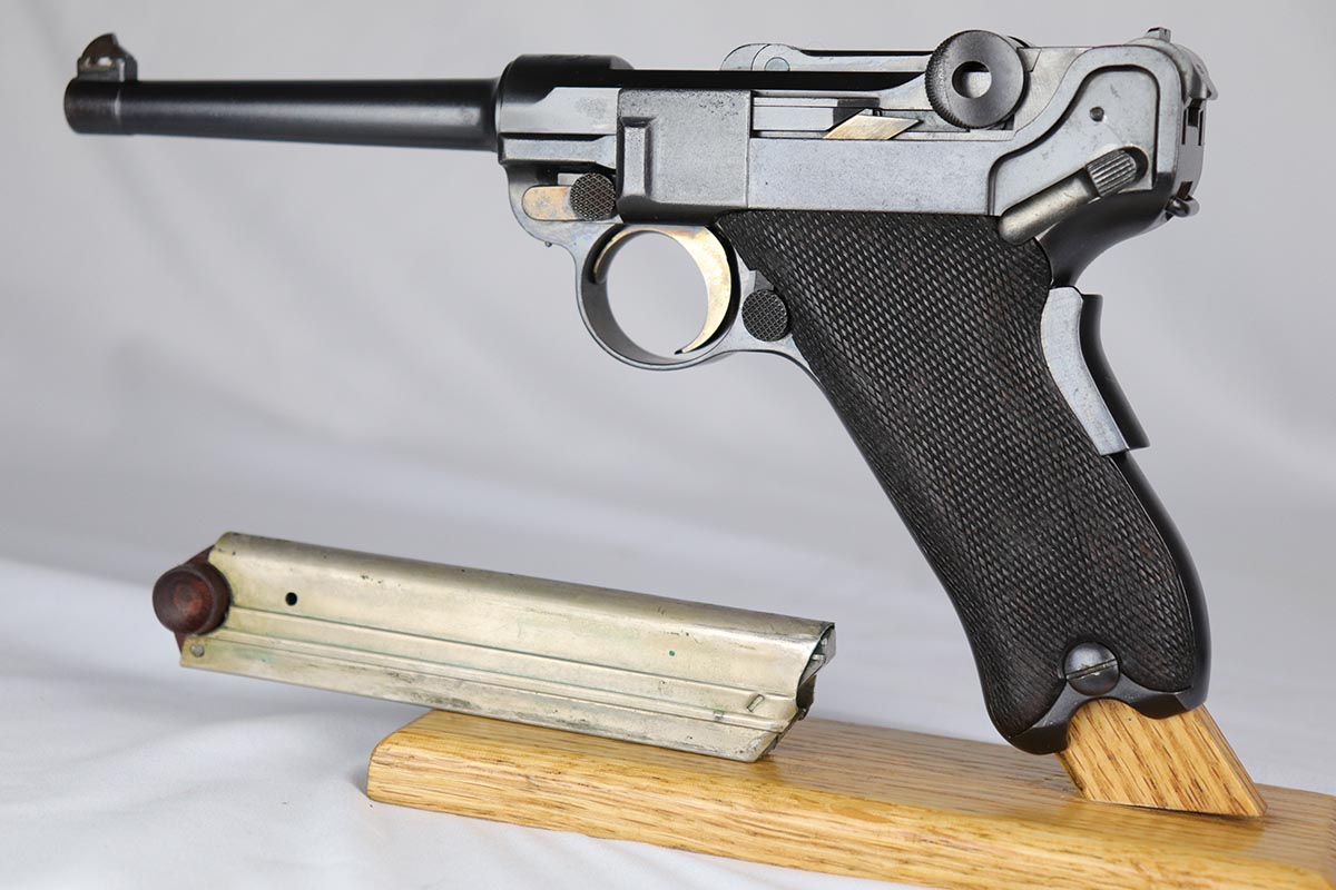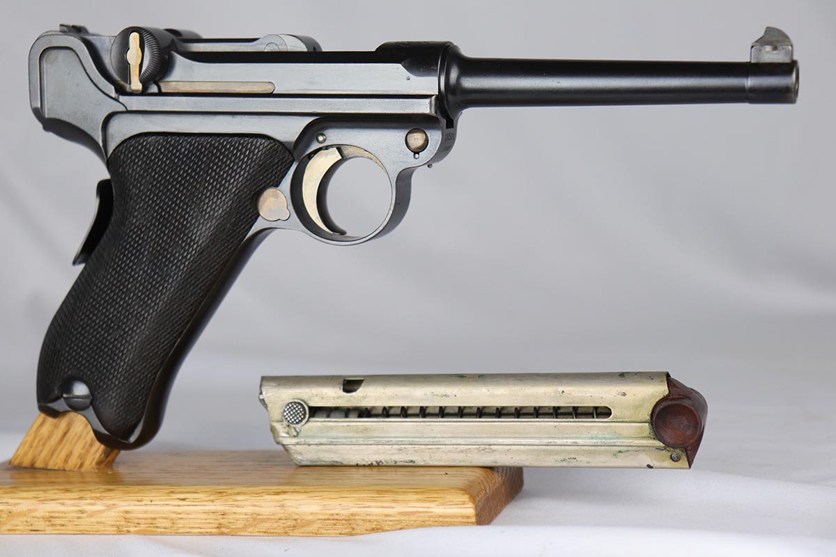 12/4/18 – This is a rare DWM model 1900 luger with American Eagle crest on the chamber. This is the first production model of this variation, made in or around 1900 with early dish toggle. These pistols went to the US retail market and the manufacturers at DWM realized that nation-based crests increased sales of these lugers, so that is why you find the American Eagle over the chamber. This is also why you see GERMANY marked on the frame, denoting these were exported for commercial sale. This pistol is in very good condition, but may be an old re-blue or may have been touched up, as there appears to bluing in some of the pinpricking on the left side. All matching numbers on the pistol with correct blank-bottom wood magazine. Bore has some corrosion throughout. Wood grips are numbered to each other but not the pistol. Comes with an original holster, pin and cleaning rod. Also comes with a waffen proofed luger tool but I don’t believe that proof to be original. Comes with a free certificate of authenticity.