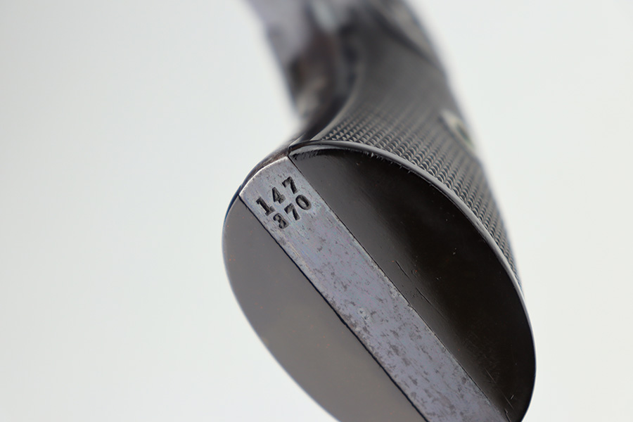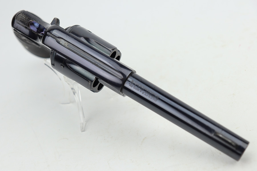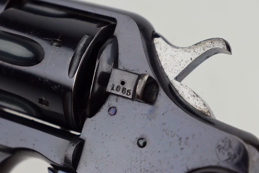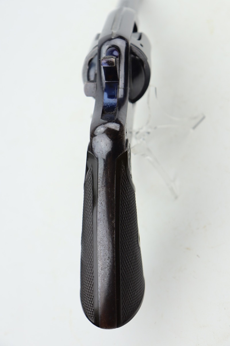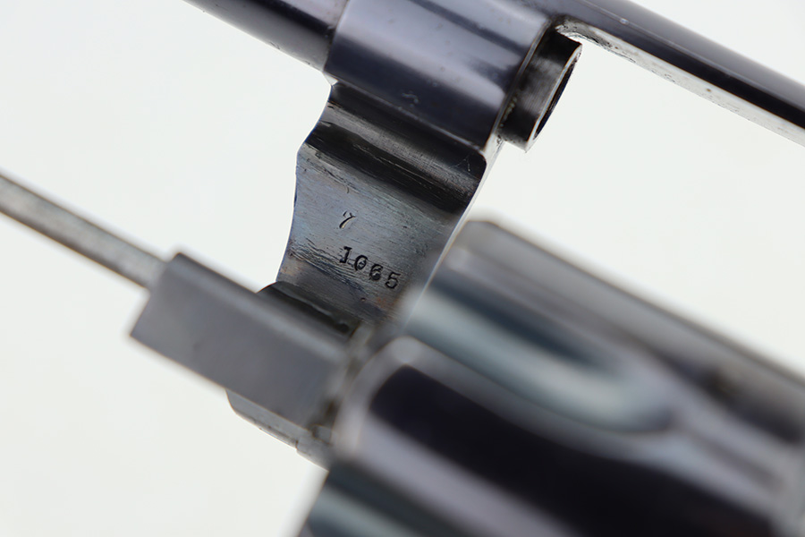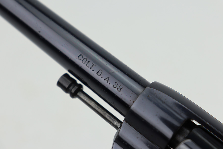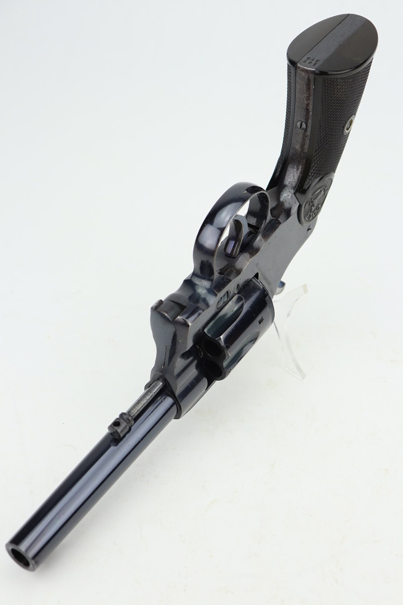 12/27/23 – This is an excellent example of a Colt New Army Revolver, manufactured in 1900 and chambered in .38 Caliber. It is all matching and has retained about 94-95% of its original high polish finish. While there is very little actual finish loss, there is light spotty oxidation on the grip straps and some freckling on both sides of the frame. Fitted with hard rubber grips. Mint bore. Smooth action.