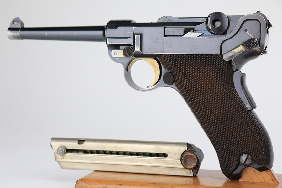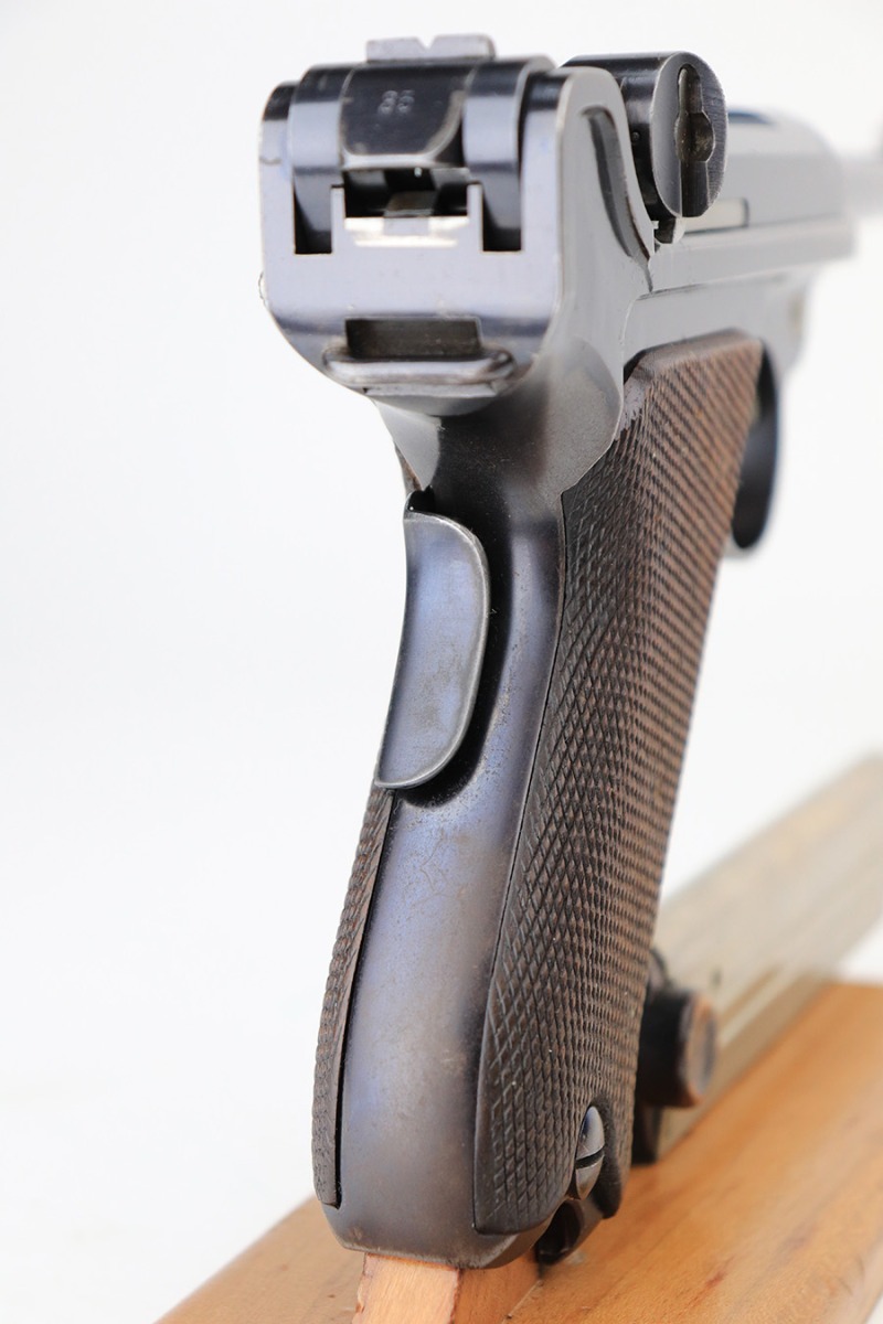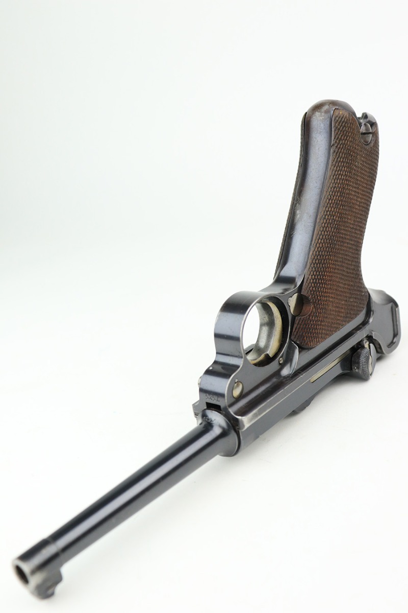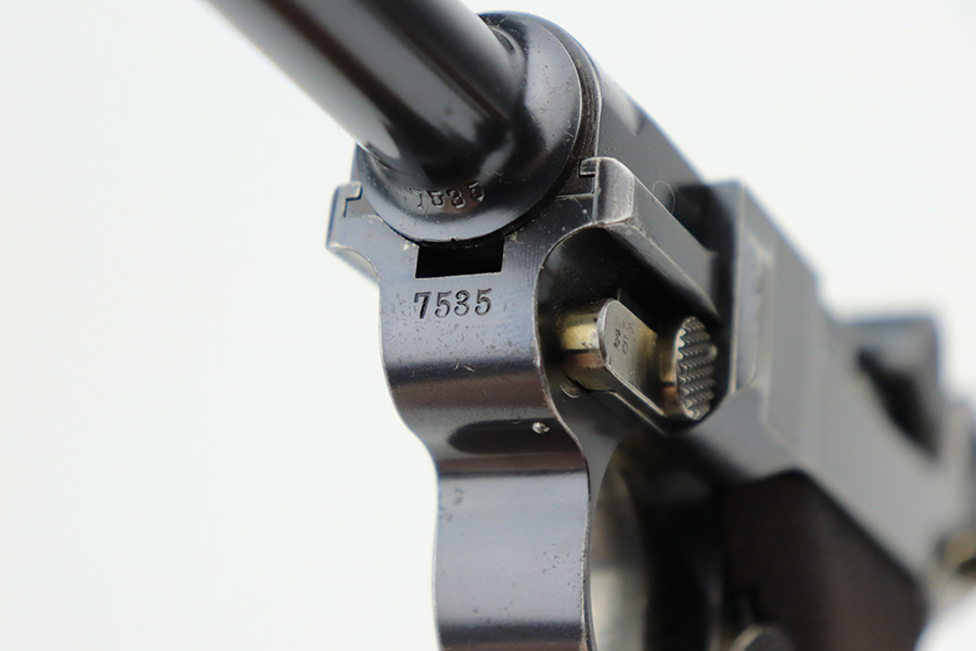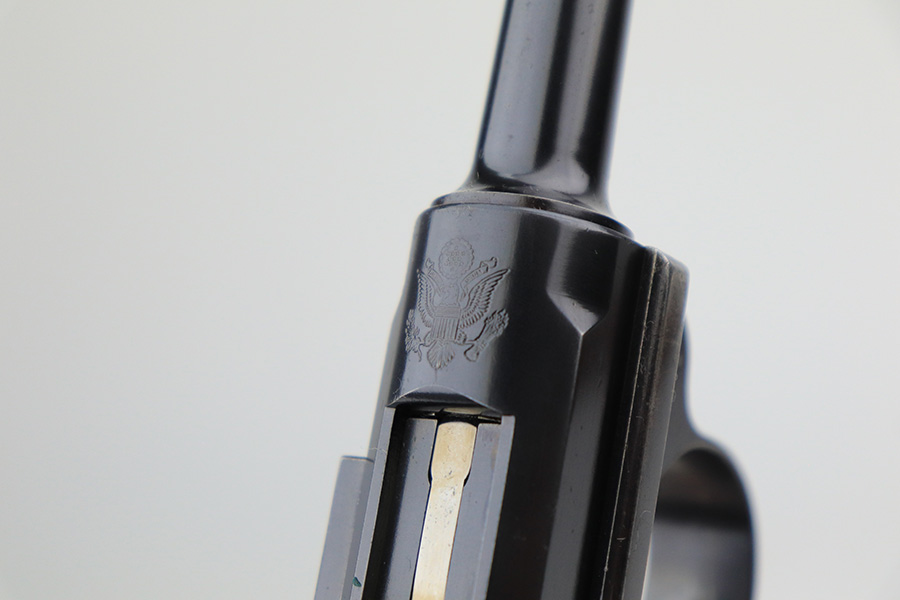 5/16/22 – This is a rare American Eagle Army Test luger, produced by DWM. In April of 1901, the United States Board of Ordnance and Fortifications put in an order for 1,000 of these lugers following test trials in which the model was fired 2,000 times under the harshest conditions possible.  These lugers feature the Great Seal over the chamber, which was not included upon request, but rather was found to be a great sales tool for the Swiss market by DWM following their initial sales of the same model but featuring the Swiss sunburst.  The characteristics that separate these American Test Eagle lugers from the other Model 1900 lugers are the lack of proofs, the lack of a ‘GERMANY’ import stamp, and the last two digits of the serial number on the right end of the takedown lever.  This particular pistol does not have the last two digits on the takedown lever, but rather on the left side of the takedown lever, and is considered an “out of range” Army Test luger.  The finish on this pistol rates somewhere around 92%, with the most noticeable wear found on the high edges and the left side of the barrel.  The grips are numbered to the gun, but the left panel does show a small chip under the safety.  Magazine is correct for this pistol.  Bore shows minor frosting but has strong rifling and no pits.