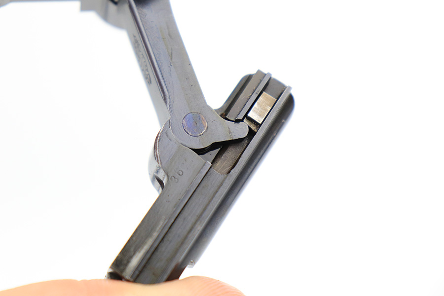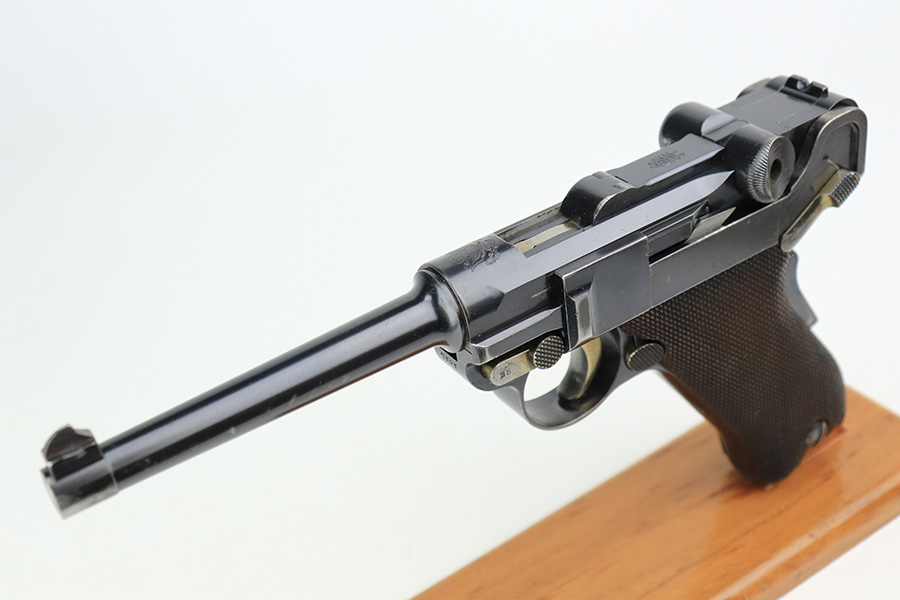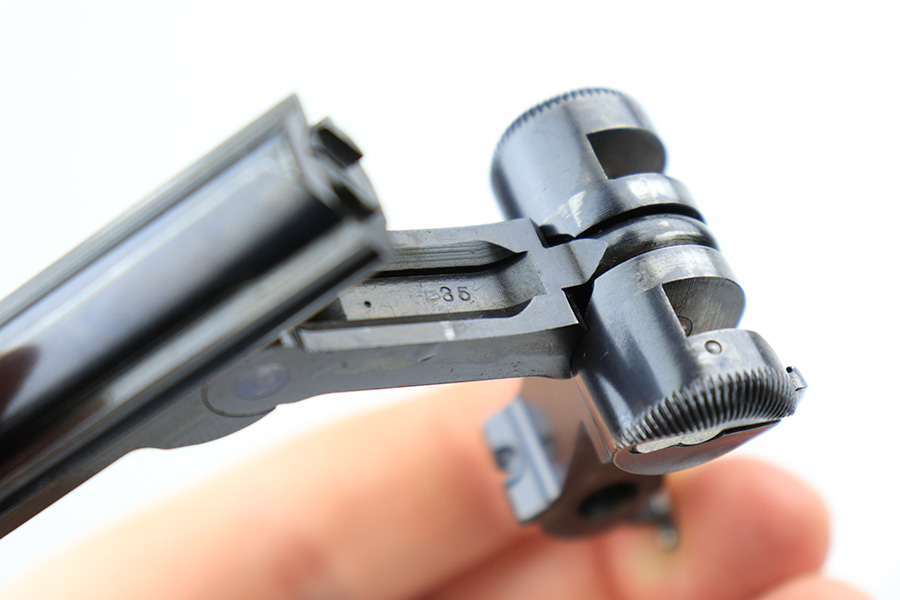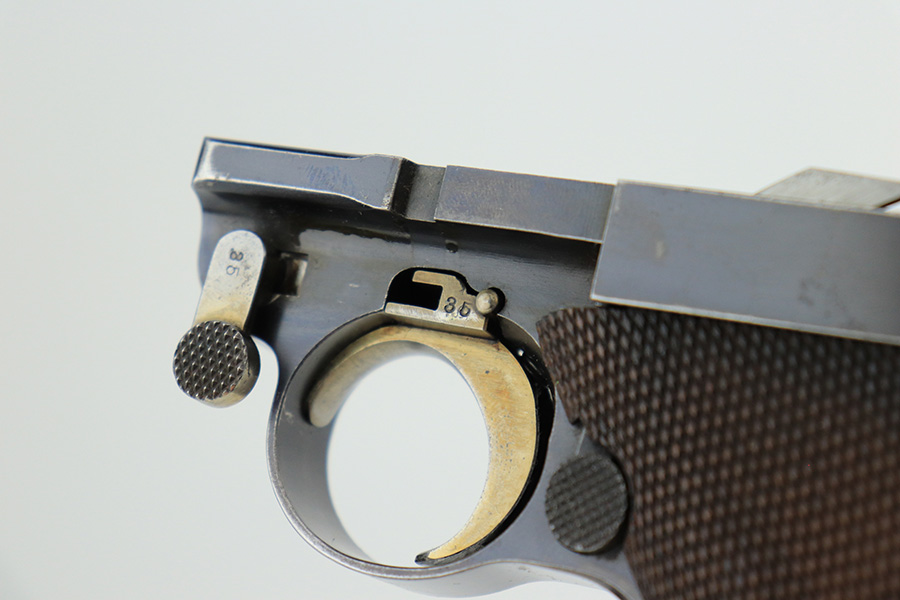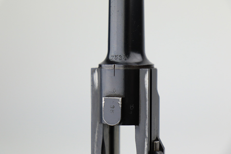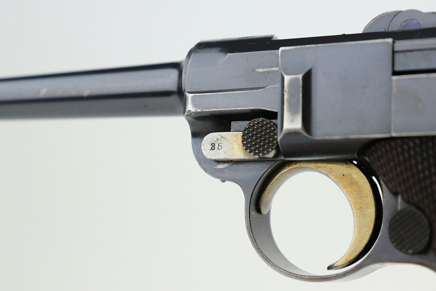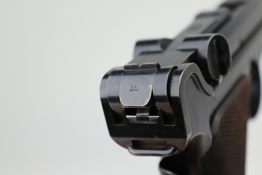5/16/22 – This is a rare American Eagle Army Test luger, produced by DWM. In April of 1901, the United States Board of Ordnance and Fortifications put in an order for 1,000 of these lugers following test trials in which the model was fired 2,000 times under the harshest conditions possible.  These lugers feature the Great Seal over the chamber, which was not included upon request, but rather was found to be a great sales tool for the Swiss market by DWM following their initial sales of the same model but featuring the Swiss sunburst.  The characteristics that separate these American Test Eagle lugers from the other Model 1900 lugers are the lack of proofs, the lack of a ‘GERMANY’ import stamp, and the last two digits of the serial number on the right end of the takedown lever.  This particular pistol does not have the last two digits on the takedown lever, but rather on the left side of the takedown lever, and is considered an “out of range” Army Test luger.  The finish on this pistol rates somewhere around 92%, with the most noticeable wear found on the high edges and the left side of the barrel.  The grips are numbered to the gun, but the left panel does show a small chip under the safety.  Magazine is correct for this pistol.  Bore shows minor frosting but has strong rifling and no pits.