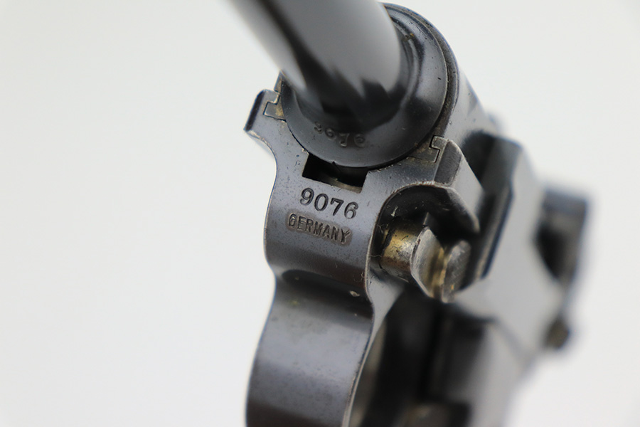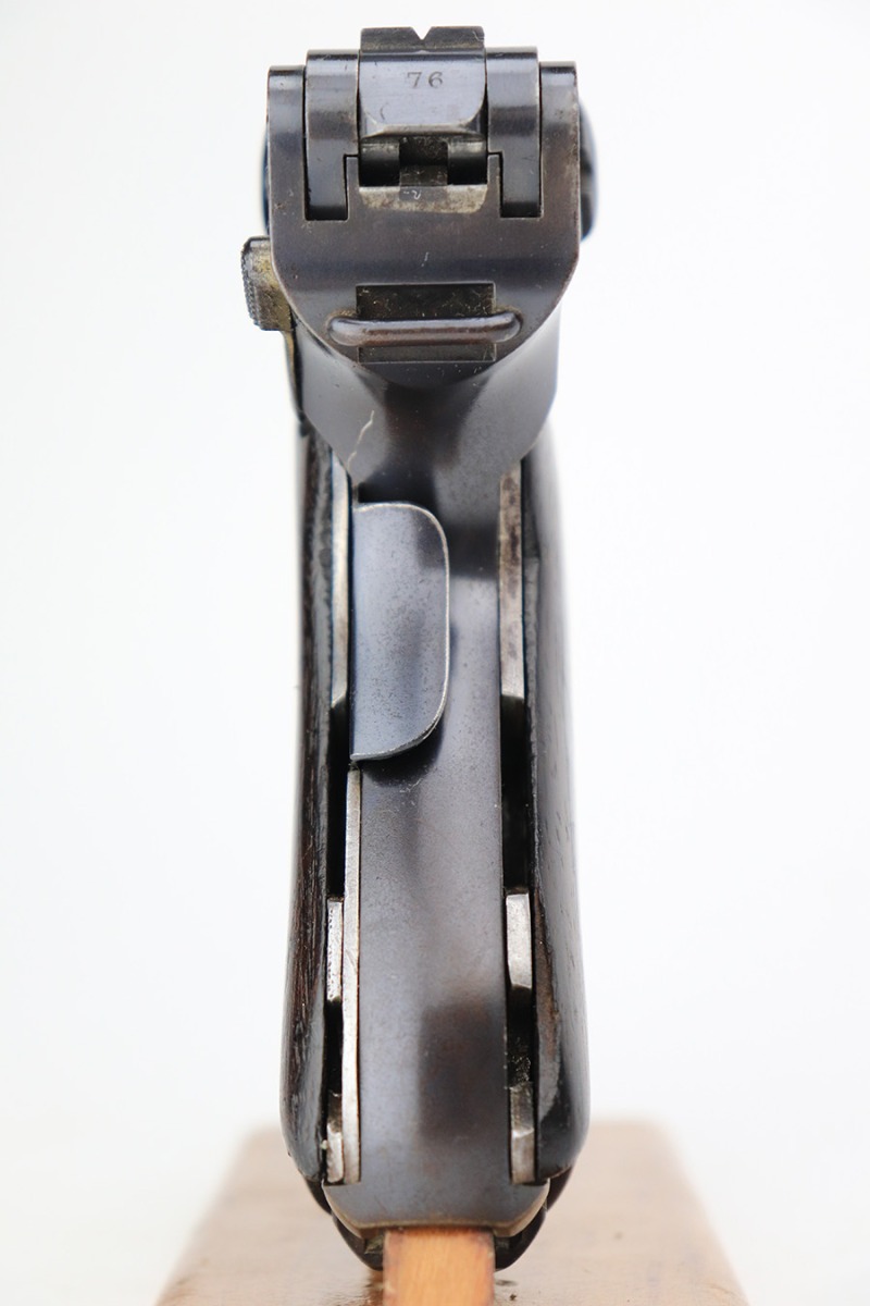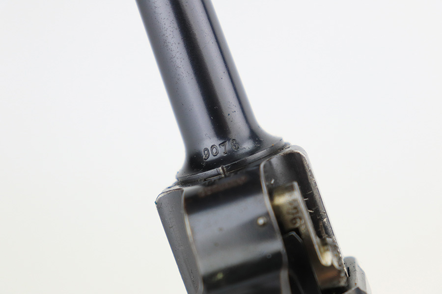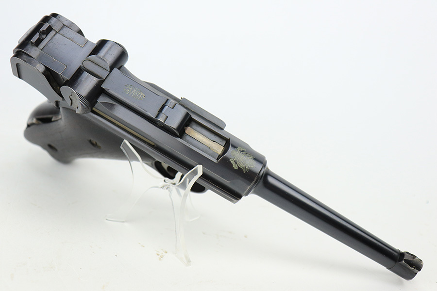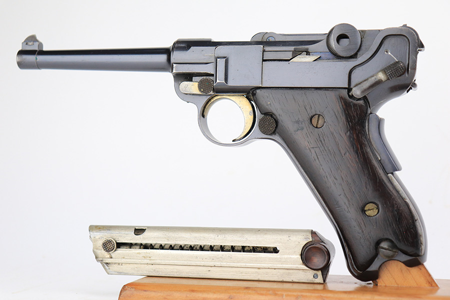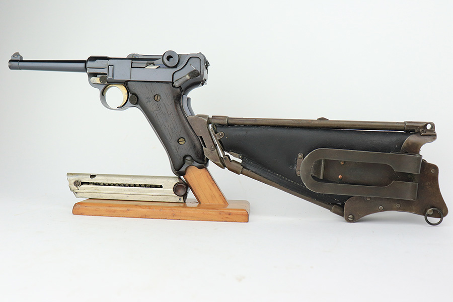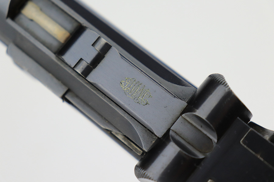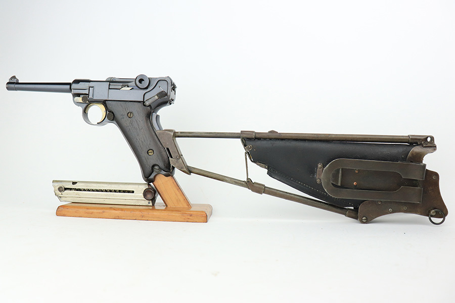 5/31/23 – This is an original Model 1900 Model DWM American Eagle Luger rig with original Ideal grips and stock/holster combo. The Ideal Holster Company applied for the patent on their grip and stock/holster in 1901, and the design uses a set of special grip panels with metal locking surfaces in them in conjunction with some very clever angular geometry to allow the stock to be easily attached and detached when in the short position, but lock tight and secure when the stock is extended to shooting length. The grips are rare, but the stocks are even more difficult to find. There are in good shape overall, though obviously show wear/age. The metal of the stock is covered in brown patina and spotty oxidation. The pistol is all matching except for the side plate. American Eagle seal on the chamber. There was originally no hold-open but one has been added. The gun has retained about 97% of its bluing with just hints of wear around the muzzle and on some of the high edges. There is some minor dulling and light brown patina on the grip straps. The wood grips are in good condition, but there is a hairline crack on the right side – only visible from the inside. Comes with a military test flaming bomb-proofed wood magazine. The bore has good rifling with minor pin-pricking throughout.