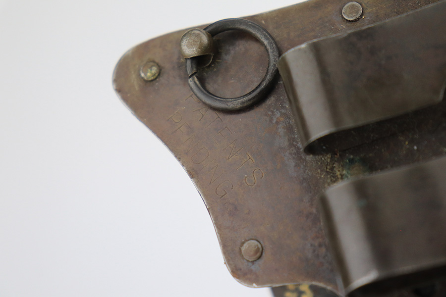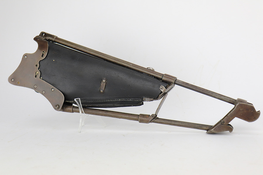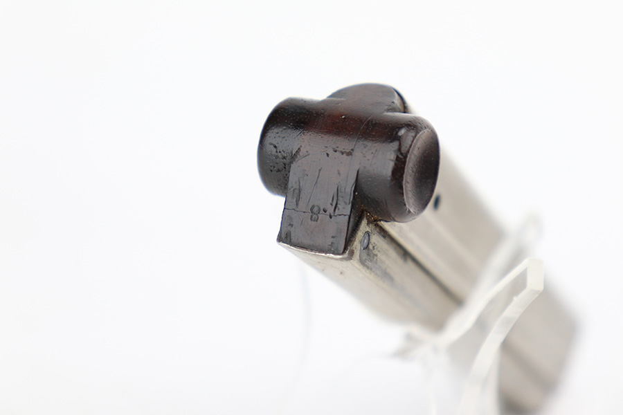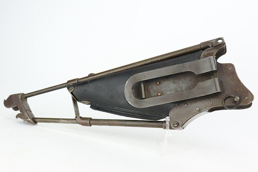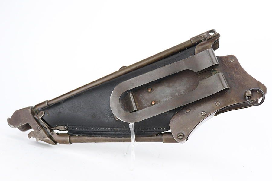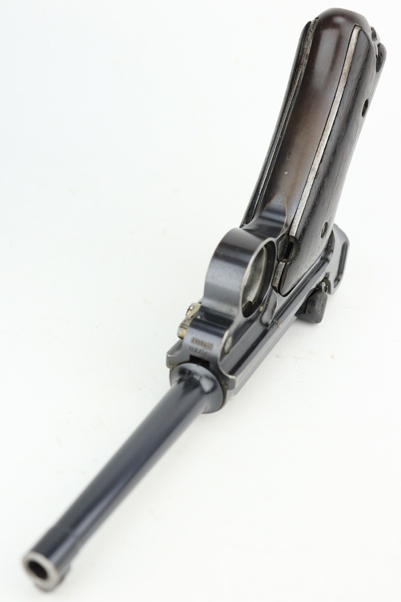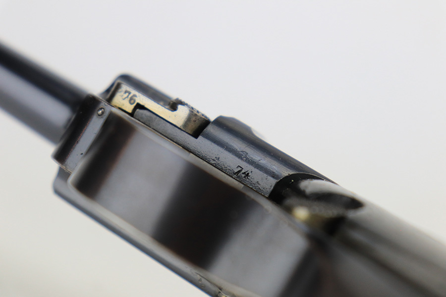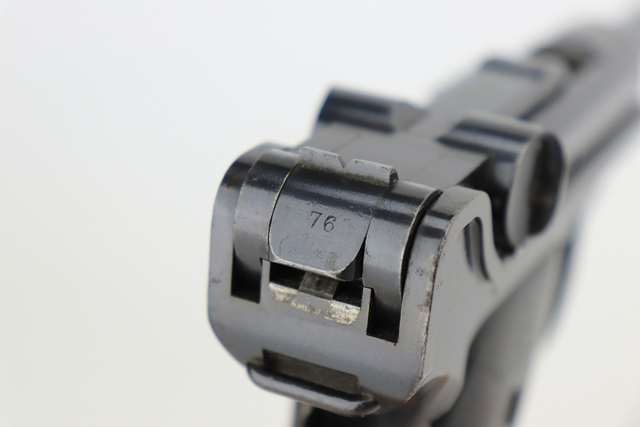 5/31/23 – This is an original Model 1900 Model DWM American Eagle Luger rig with original Ideal grips and stock/holster combo. The Ideal Holster Company applied for the patent on their grip and stock/holster in 1901, and the design uses a set of special grip panels with metal locking surfaces in them in conjunction with some very clever angular geometry to allow the stock to be easily attached and detached when in the short position, but lock tight and secure when the stock is extended to shooting length. The grips are rare, but the stocks are even more difficult to find. There are in good shape overall, though obviously show wear/age. The metal of the stock is covered in brown patina and spotty oxidation. The pistol is all matching except for the side plate. American Eagle seal on the chamber. There was originally no hold-open but one has been added. The gun has retained about 97% of its bluing with just hints of wear around the muzzle and on some of the high edges. There is some minor dulling and light brown patina on the grip straps. The wood grips are in good condition, but there is a hairline crack on the right side – only visible from the inside. Comes with a military test flaming bomb-proofed wood magazine. The bore has good rifling with minor pin-pricking throughout.