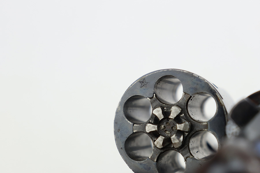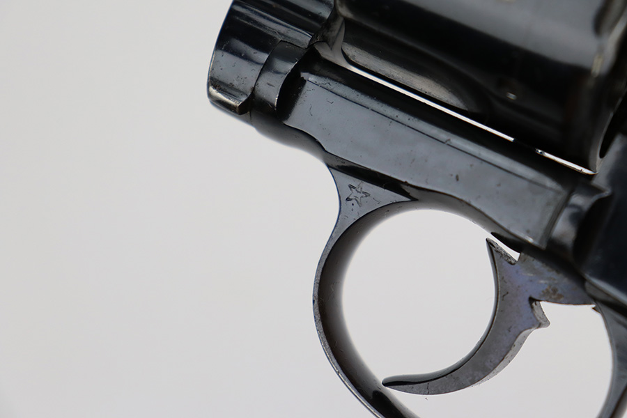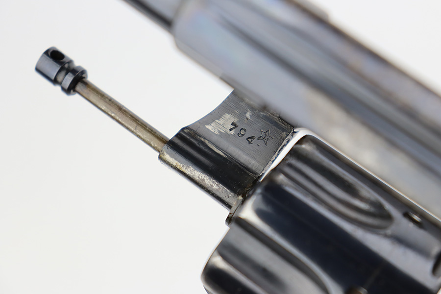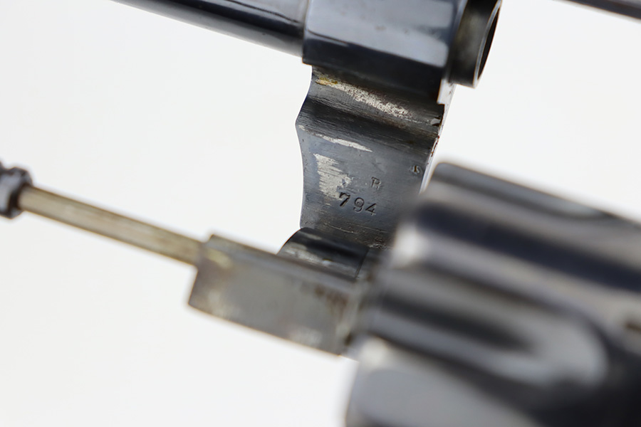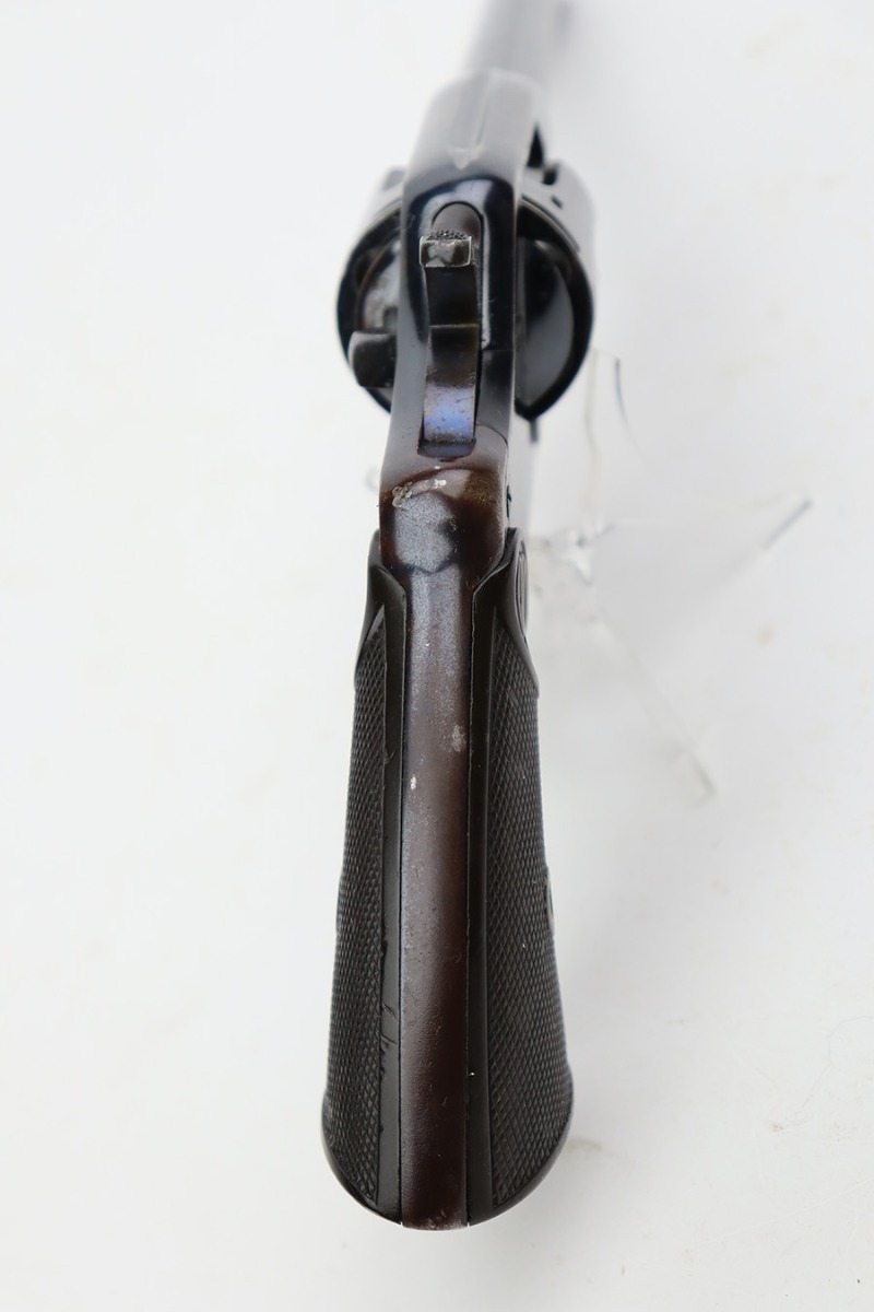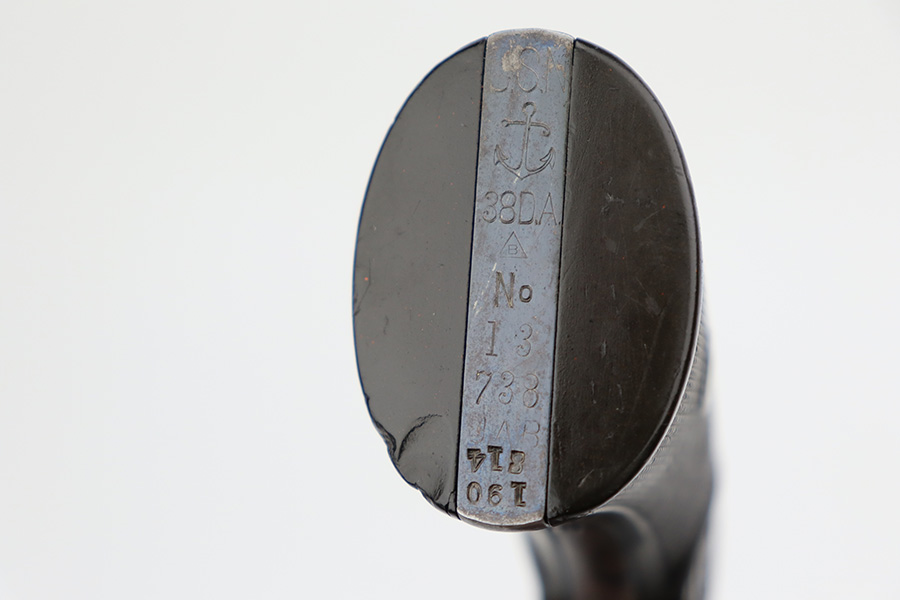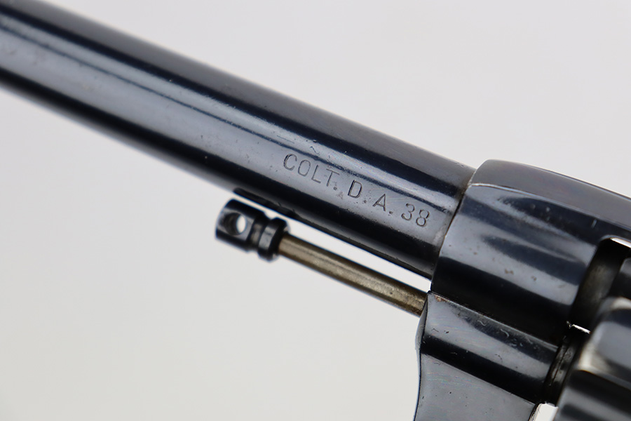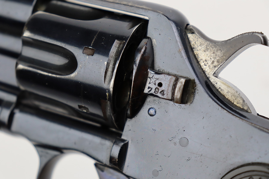 11/7/23 – This is a nice example of a Colt Model 1895 double action revolver issued to the US Navy in 1902. The butt is marked U.S.N. over the Navy Anchor. Beneath this is the caliber designation “.38 D.A.” and the “Triangle-B” civilian inspection marking and the initials “J.A.B.” (both belonging to John A. Bell). “Star” acceptance markings throughout. We believe this gun has an old re-blued finish. There is minor muzzle wear, high edge wear in general, noticeable brown patina on the grip straps, and spotty discoloration on the top strap. Some minor pin-pricking here and there. Fitted with hard rubber grips – a couple of small chips on the bottom edge of the left panel. The bore is shiny with strong rifling, but there is very light freckling throughout. The cylinder release lever is a little stiff and tends to “stick”.