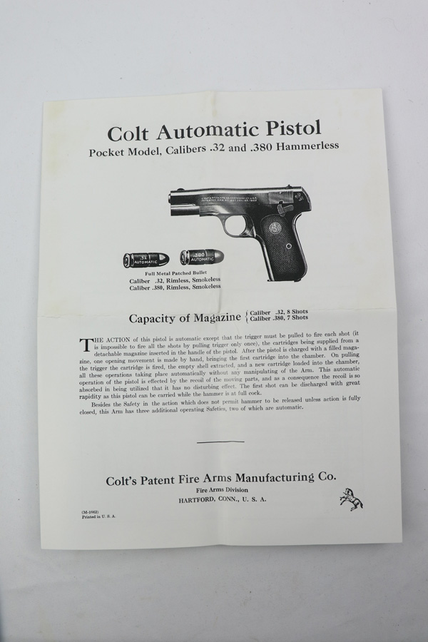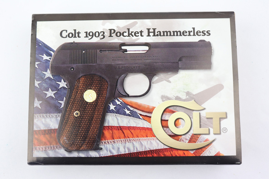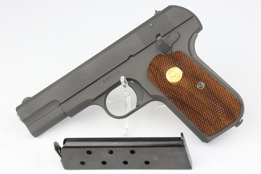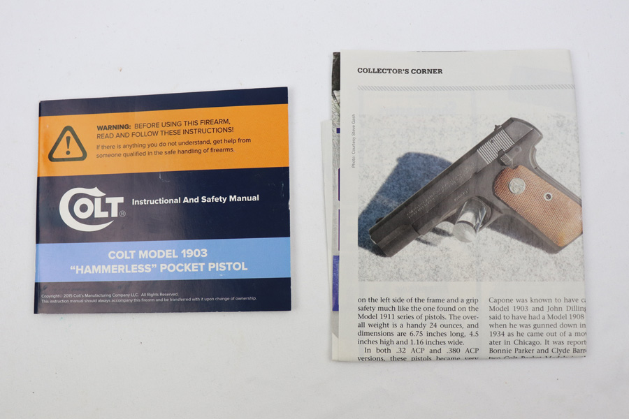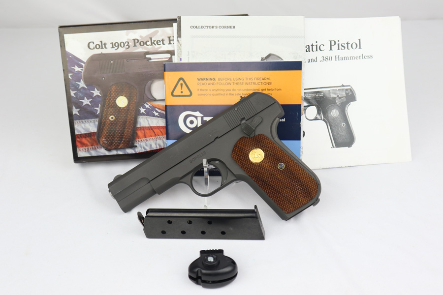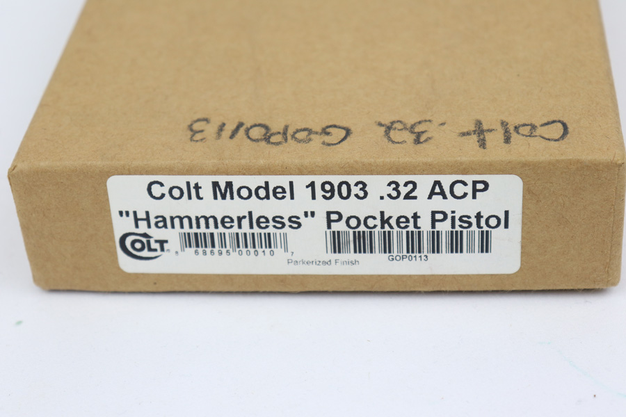 12/3/18 – This is a post war production Colt model 1903 “Hammerless” Pocket pistol. These were produced in limited quantity (only 2,000 with “GOP” serial numbers) by U.S. Armament Corporation under a contract with Colt. These were produced to commemorate and recreate the pistol in pristine fashion. The parkerized finish is excellent and minty on this piece – only a few very small surface “smudge” marks. Like new condition overall with the original documents, wax paper, gun lock, and box (hand numbered to the gun). This was bought years ago for the same price as we have today. One magazine is included.