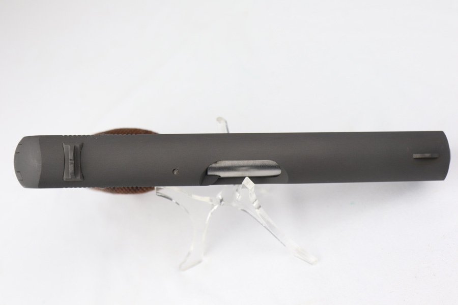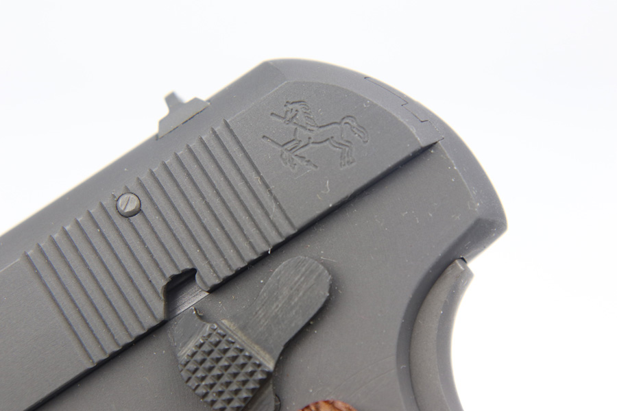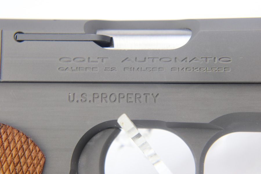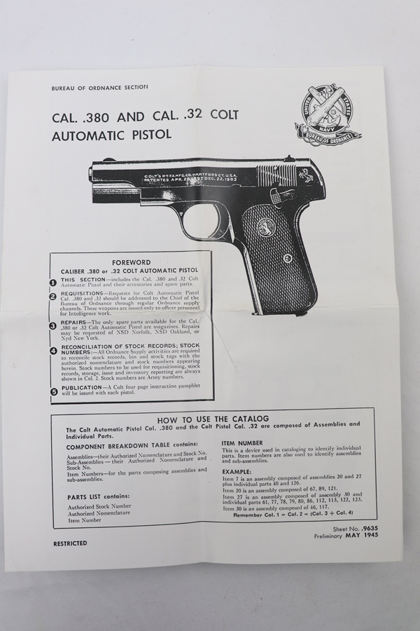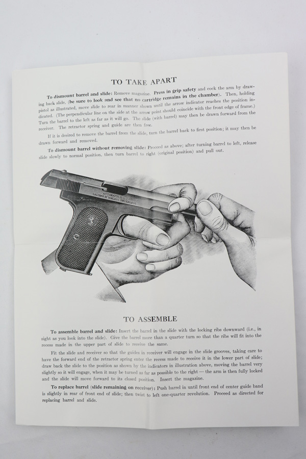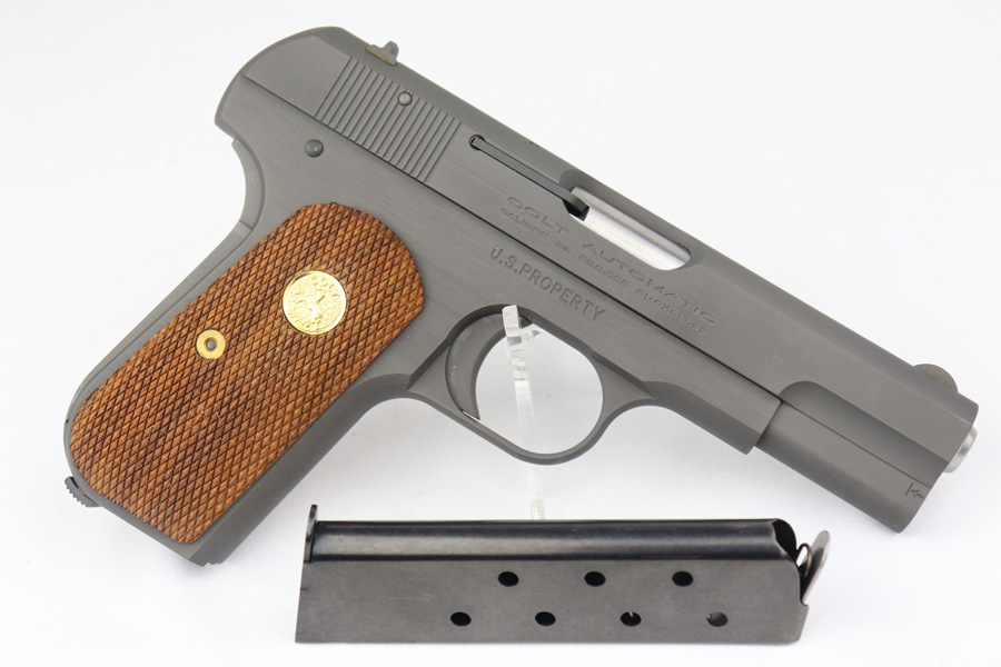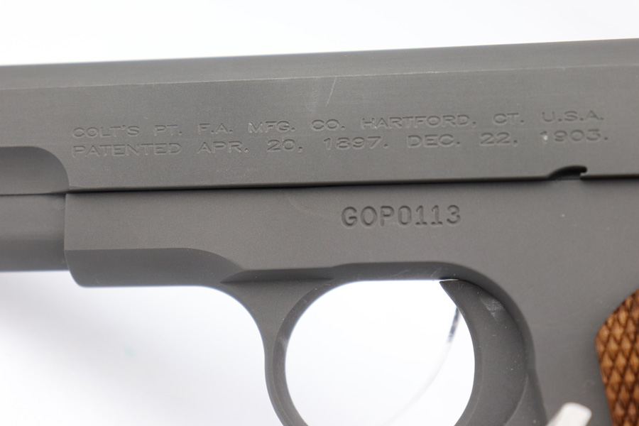 12/3/18 – This is a post war production Colt model 1903 “Hammerless” Pocket pistol. These were produced in limited quantity (only 2,000 with “GOP” serial numbers) by U.S. Armament Corporation under a contract with Colt. These were produced to commemorate and recreate the pistol in pristine fashion. The parkerized finish is excellent and minty on this piece – only a few very small surface “smudge” marks. Like new condition overall with the original documents, wax paper, gun lock, and box (hand numbered to the gun). This was bought years ago for the same price as we have today. One magazine is included.