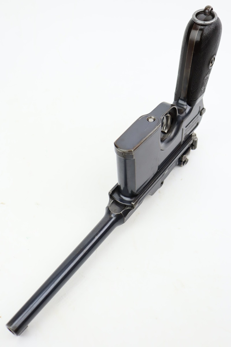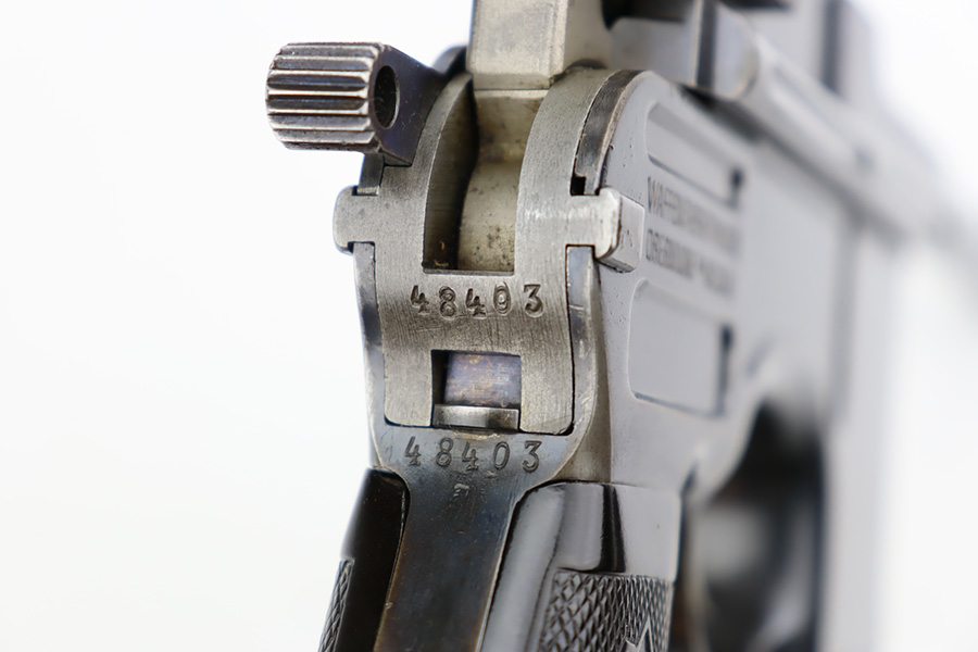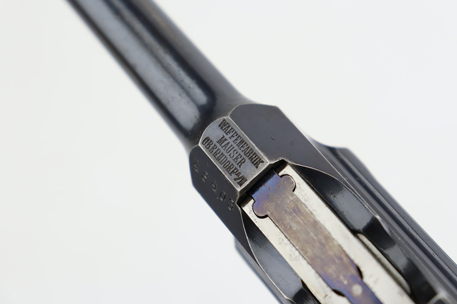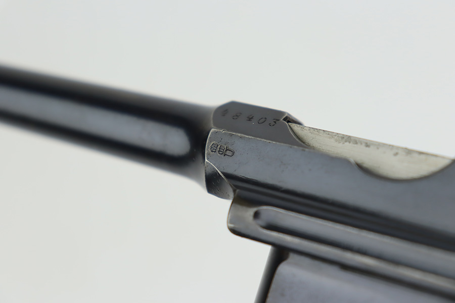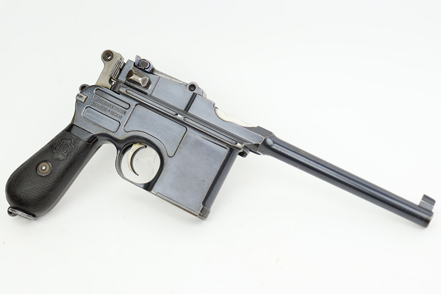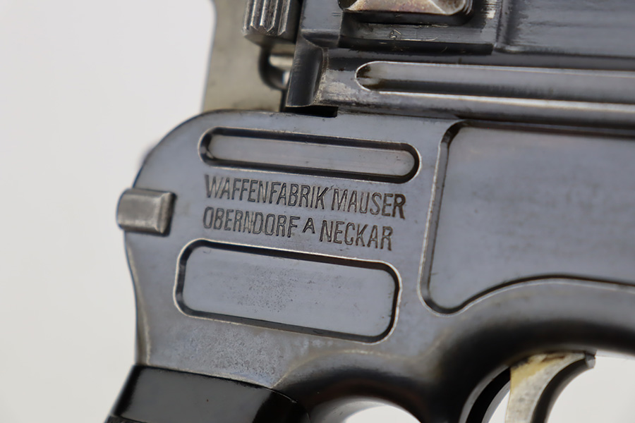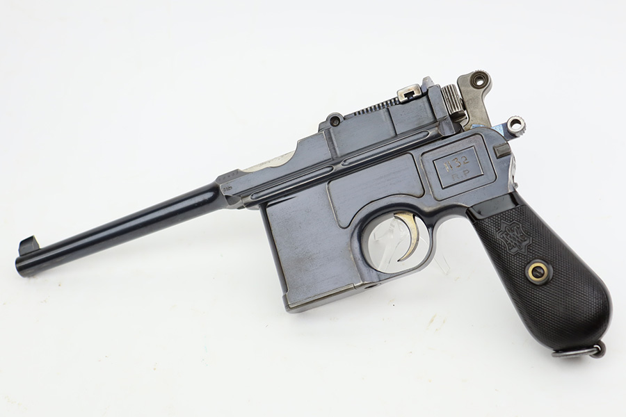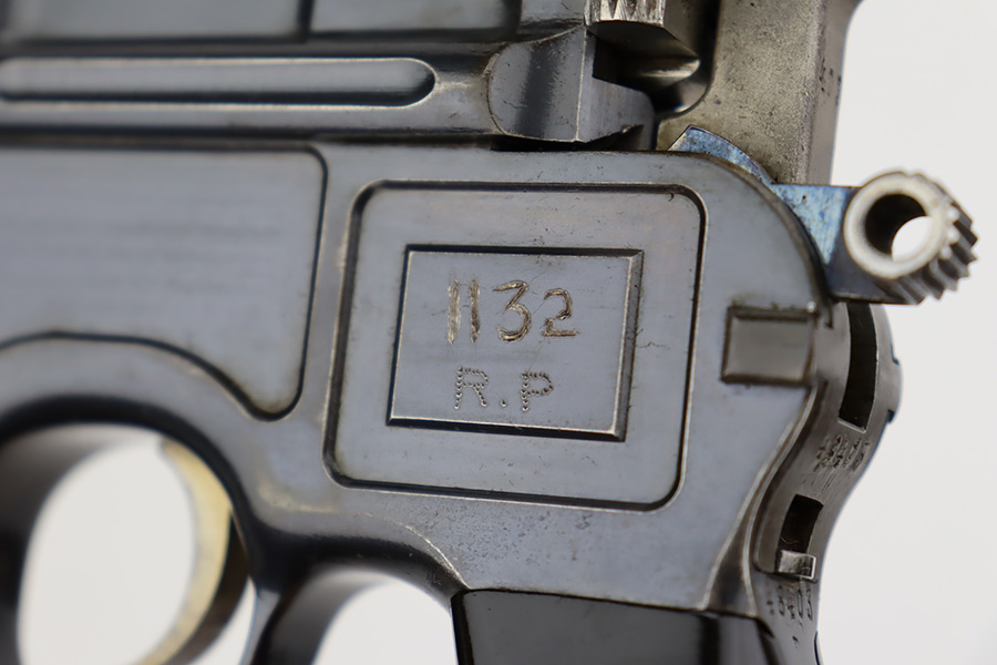 9/19/23 – This is an excellent example of a Mauser C96 Broomhandle, manufactured in 1905 and chambered in 7.63mm. It is all matching, fitted with an excellent set of black bakelite grips. The gun itself has retained about 96% of its original finish with just very minor general high edge wear. Unfortunately, the writing “1132 R.P” was scratched into the left side of the frame. The bore has great rifling with just a hint of pin-pricking throughout.