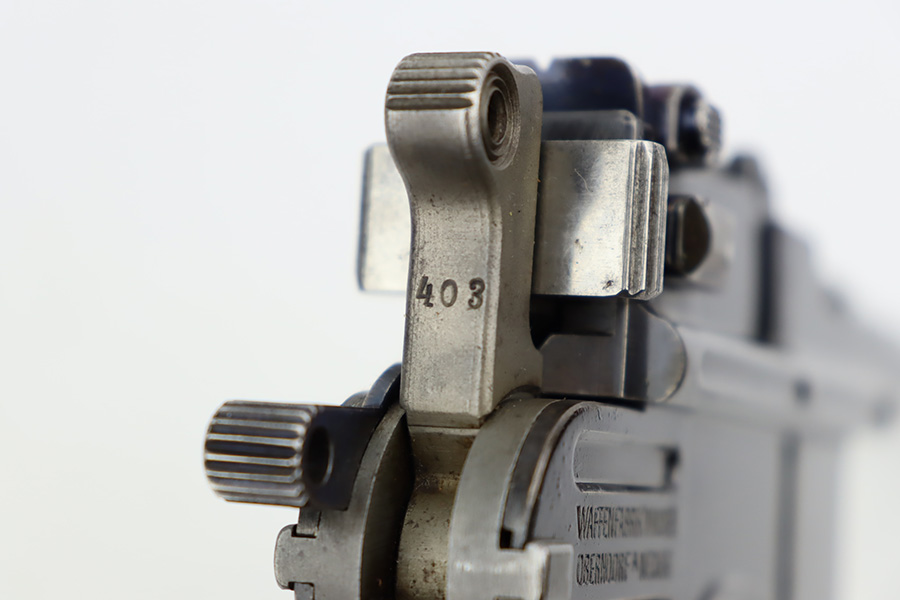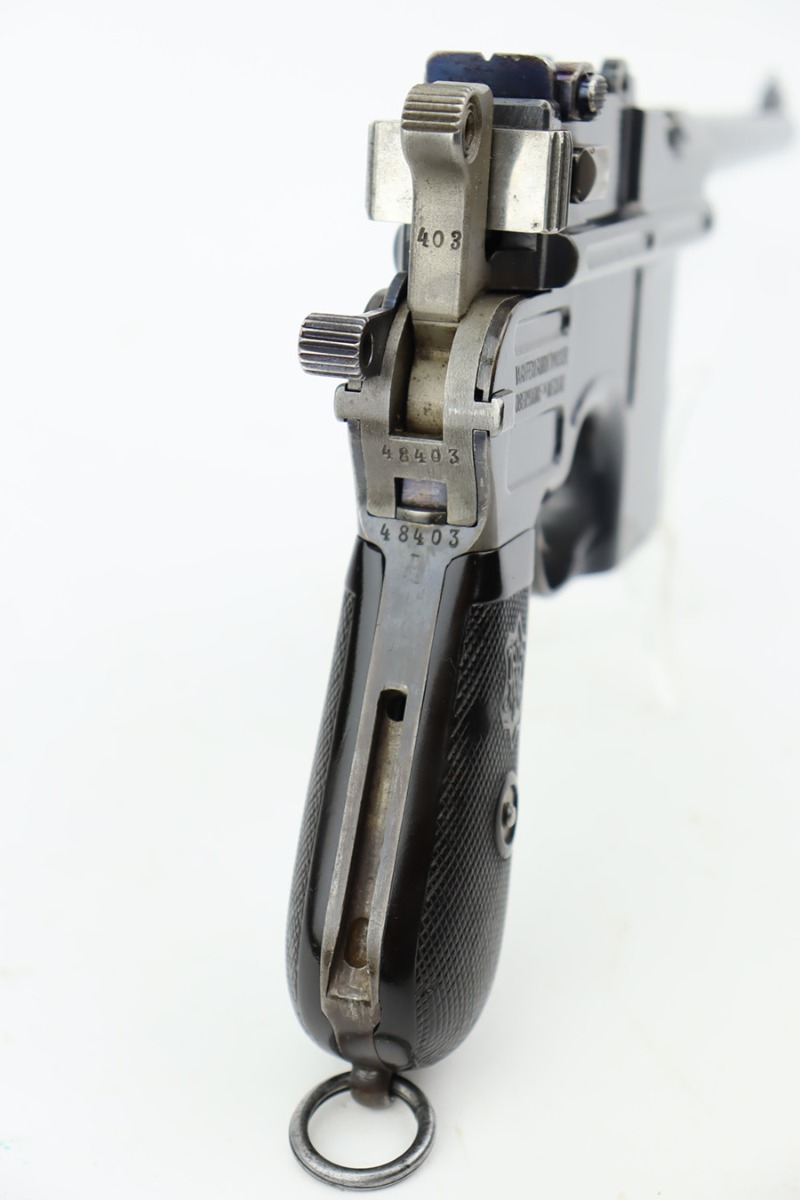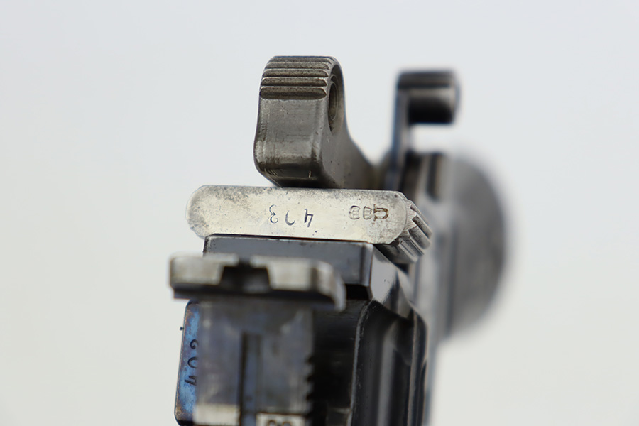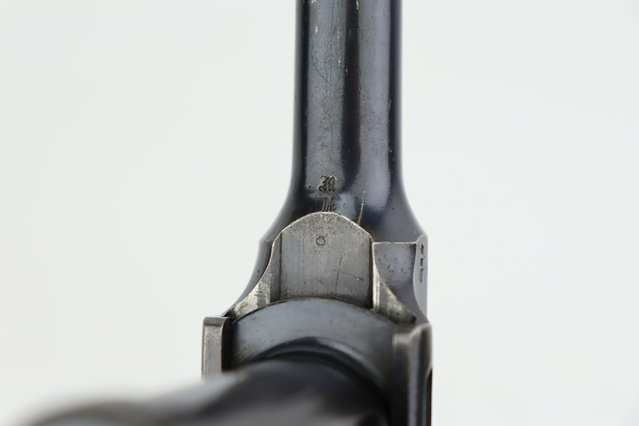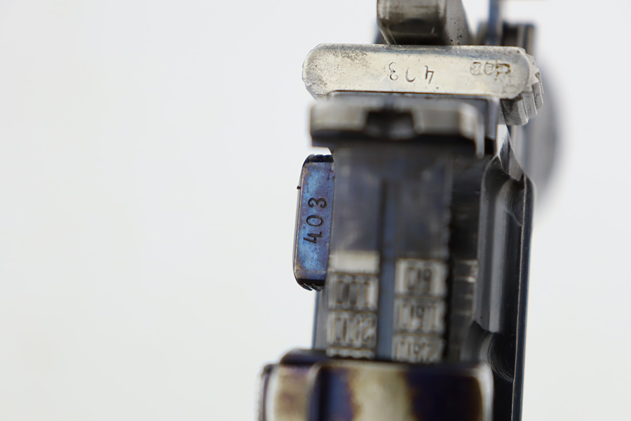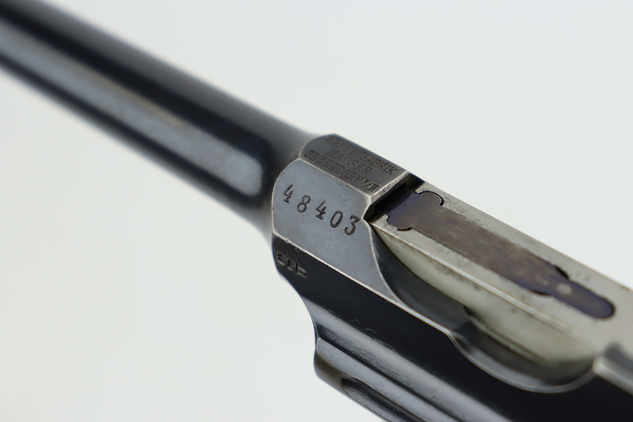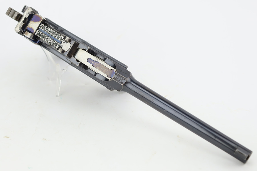 9/19/23 – This is an excellent example of a Mauser C96 Broomhandle, manufactured in 1905 and chambered in 7.63mm. It is all matching, fitted with an excellent set of black bakelite grips. The gun itself has retained about 96% of its original finish with just very minor general high edge wear. Unfortunately, the writing “1132 R.P” was scratched into the left side of the frame. The bore has great rifling with just a hint of pin-pricking throughout.