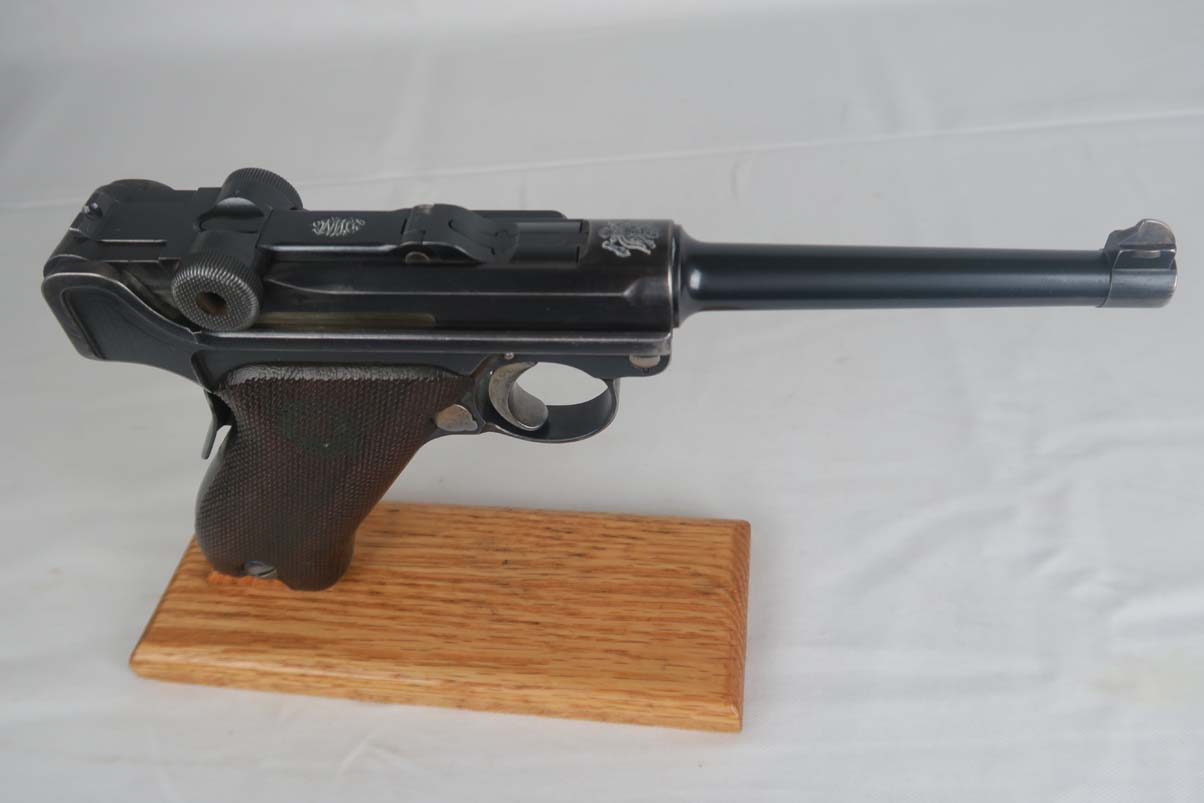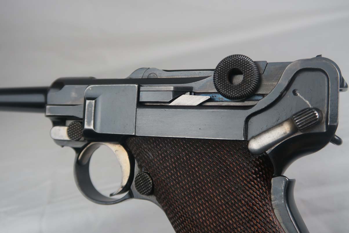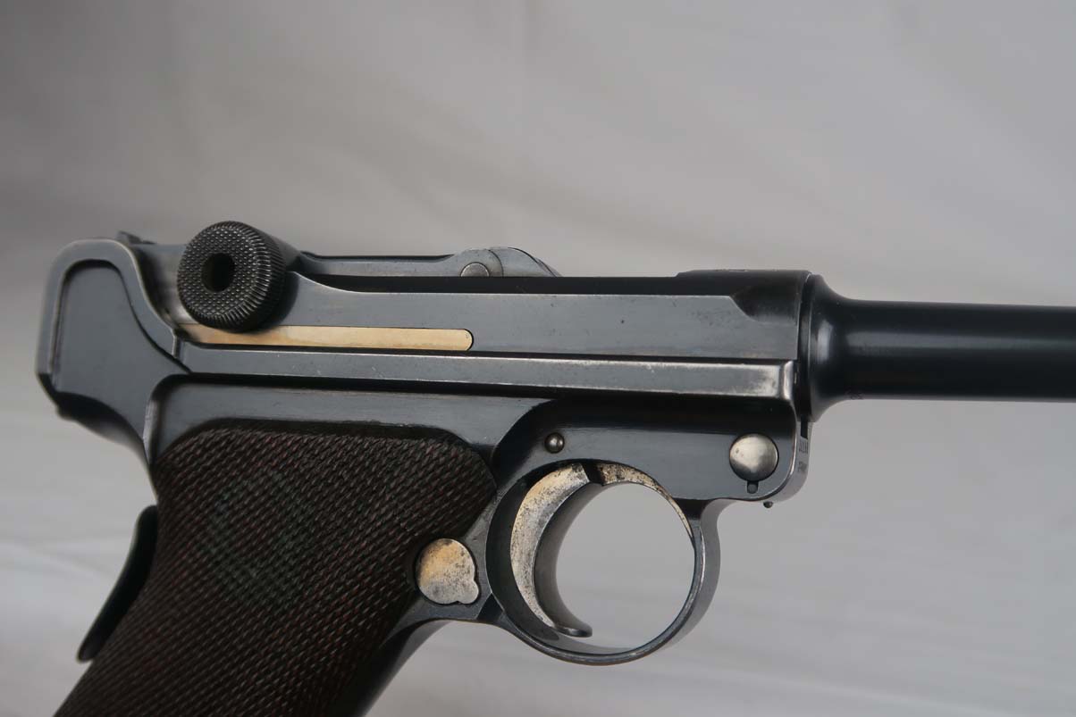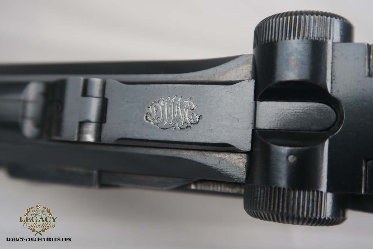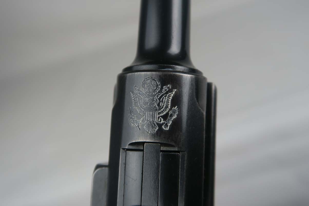 4/27/17 – This is a model 1906 DWM American Eagle luger. The American Eagle denotes a variation of luger that was manufactured expressly for distribution in the United States. The original finish rates at about 93-94%, with wear on the sideplate, muzzle, rails and bottom of the front strap. All numbered parts are correct and matching. Gun is GERMANY marked with correct grip safety. 4.75in barrel on this pistol. Excellent bore with strong rifling.