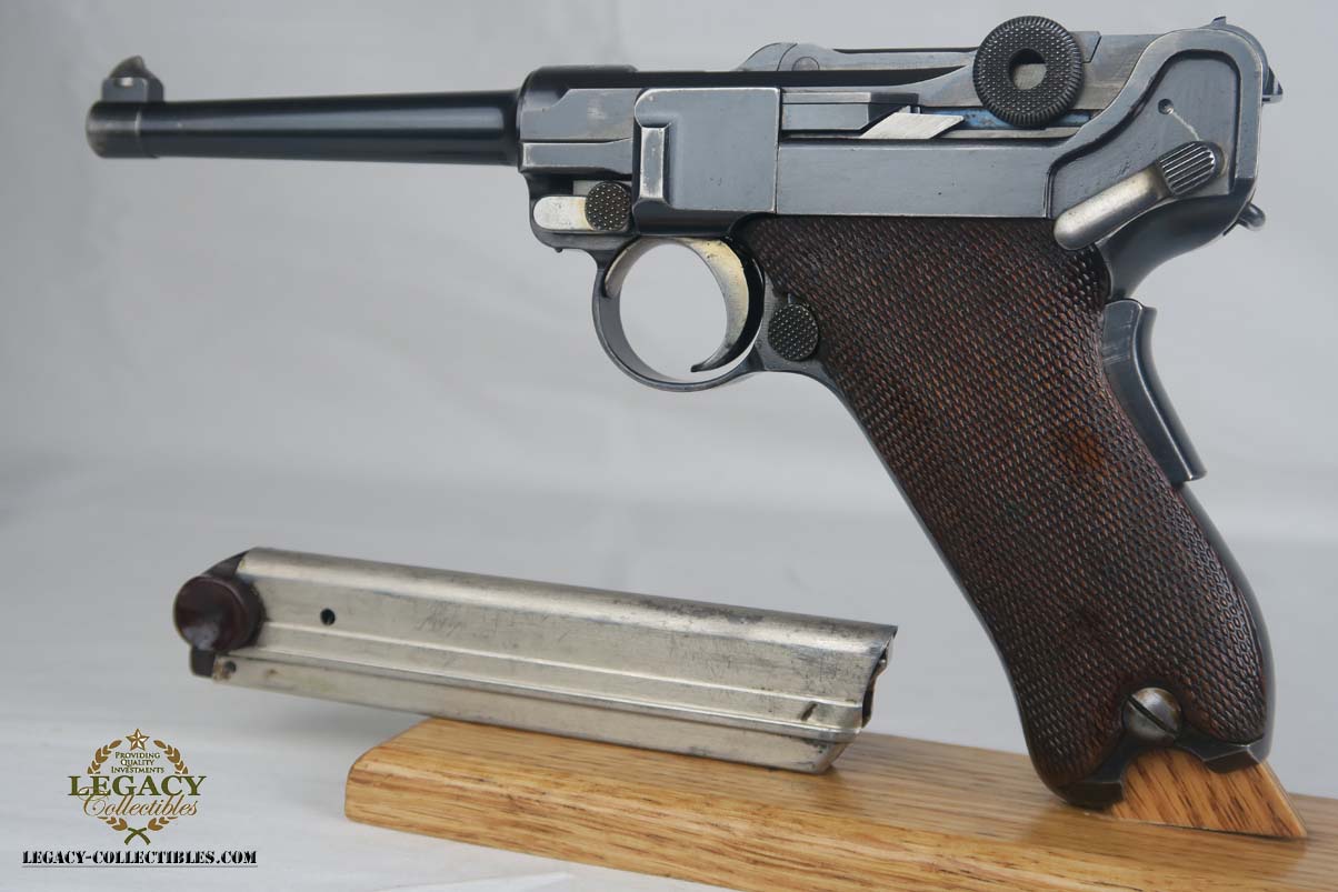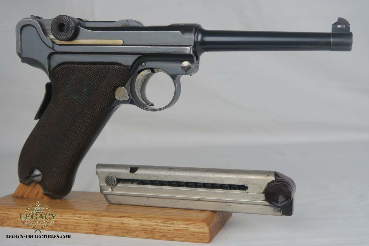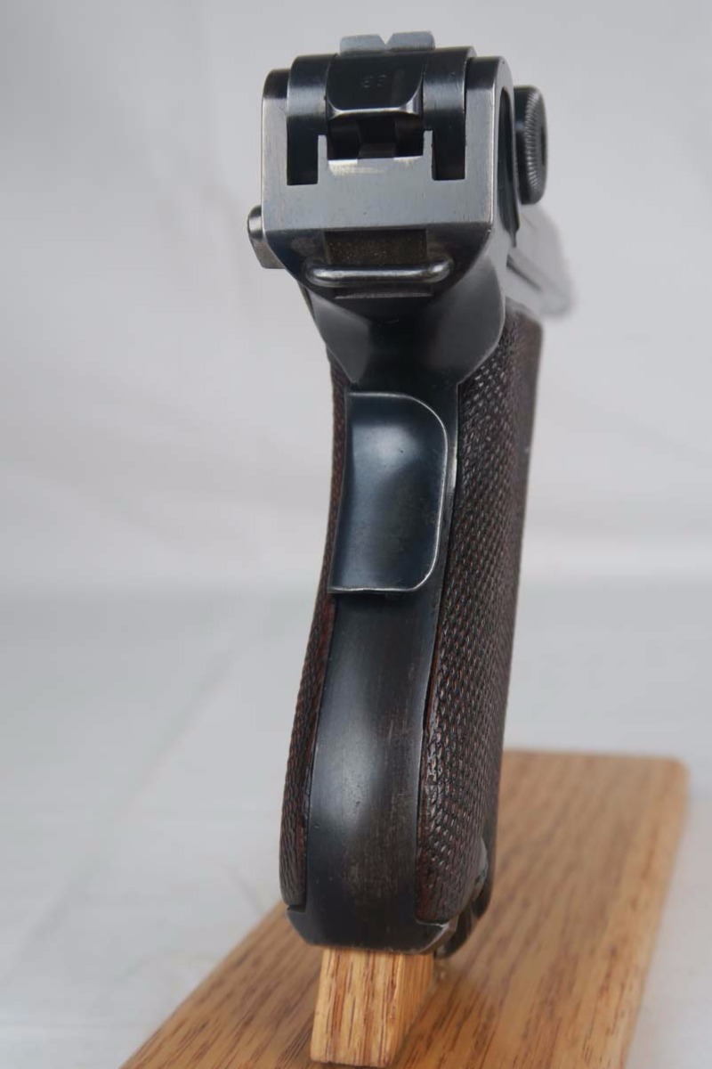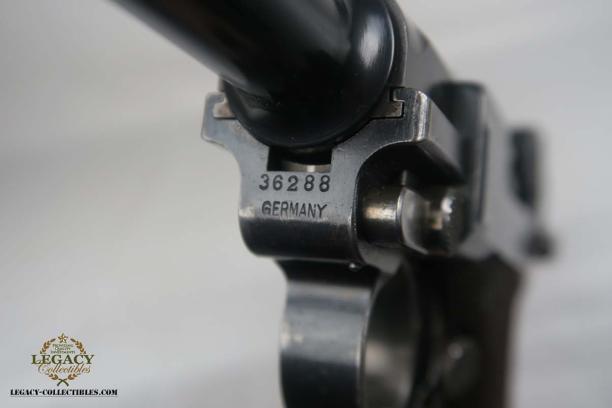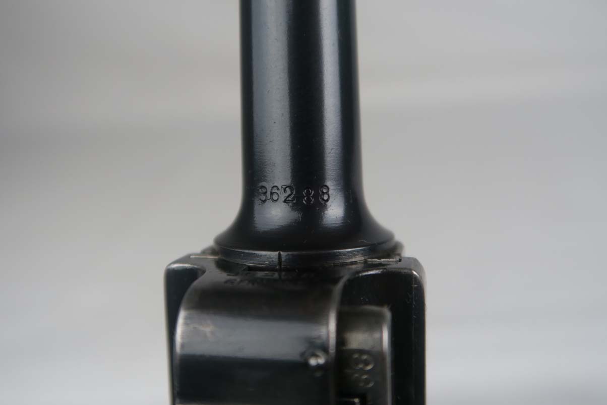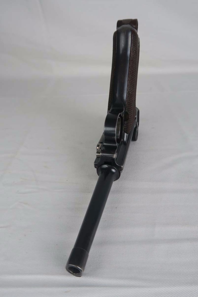 4/27/17 – This is a model 1906 DWM American Eagle luger. The American Eagle denotes a variation of luger that was manufactured expressly for distribution in the United States. The original finish rates at about 93-94%, with wear on the sideplate, muzzle, rails and bottom of the front strap. All numbered parts are correct and matching. Gun is GERMANY marked with correct grip safety. 4.75in barrel on this pistol. Excellent bore with strong rifling.