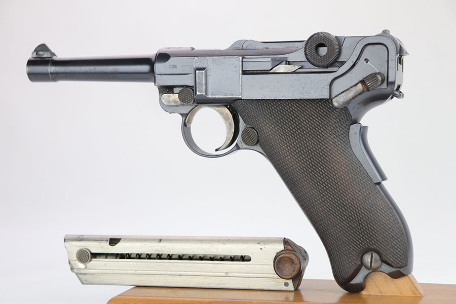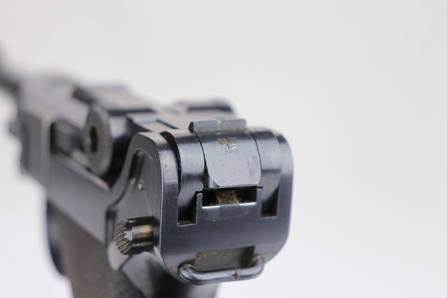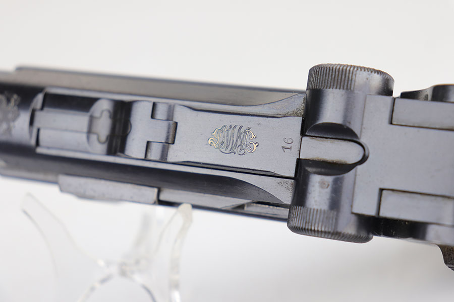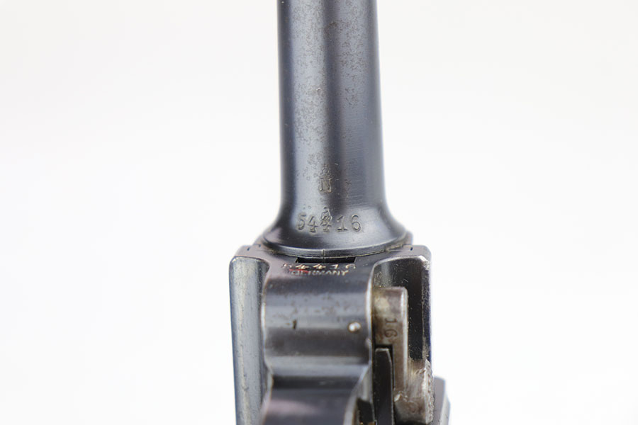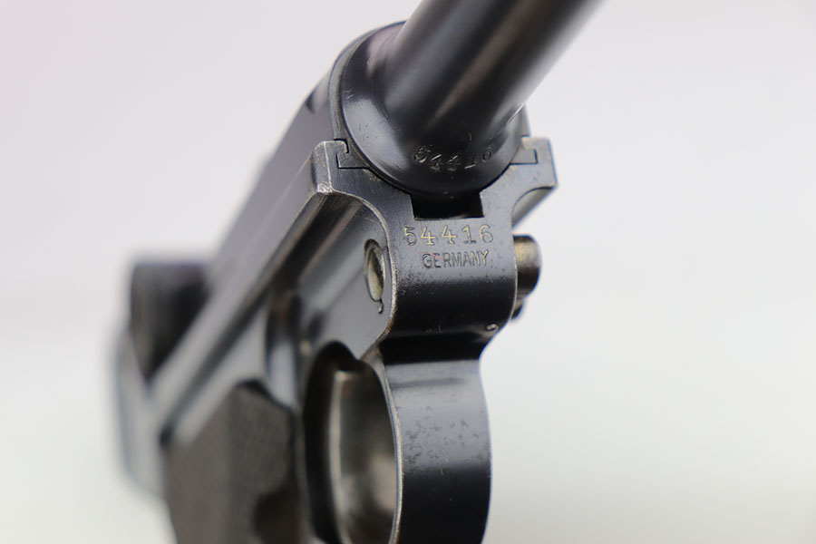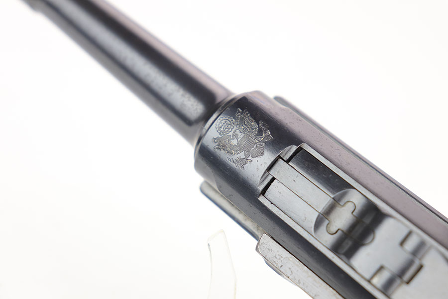 5/25/20 – This is a very nice, all original 1906 DWM American Eagle Luger. The pistol is all matching with about 95% polished blue remaining, with standard high edge wear. The bluing is somewhat tough to rate as there’s very little actual bluing loss, but oxidation spots all over the pistol, especially the straps. Small parts retain about 50% original straw. Grips show minor handling wear but no major flaws and have nice checkering. They are unmarked. The pistol comes with the rare and desirable ‘CAL. 9M/M’ bottom, which can sell for about $400 on its. The bore is shiny with strong rifling and only minor signs of use. These pistols went to the US retail market and the manufacturers at DWM realized that nation-based crests increased sales of these lugers, so that is why you find the American Eagle over the chamber. This is also why you see GERMANY marked on the frame, denoting these were exported for commercial sale.