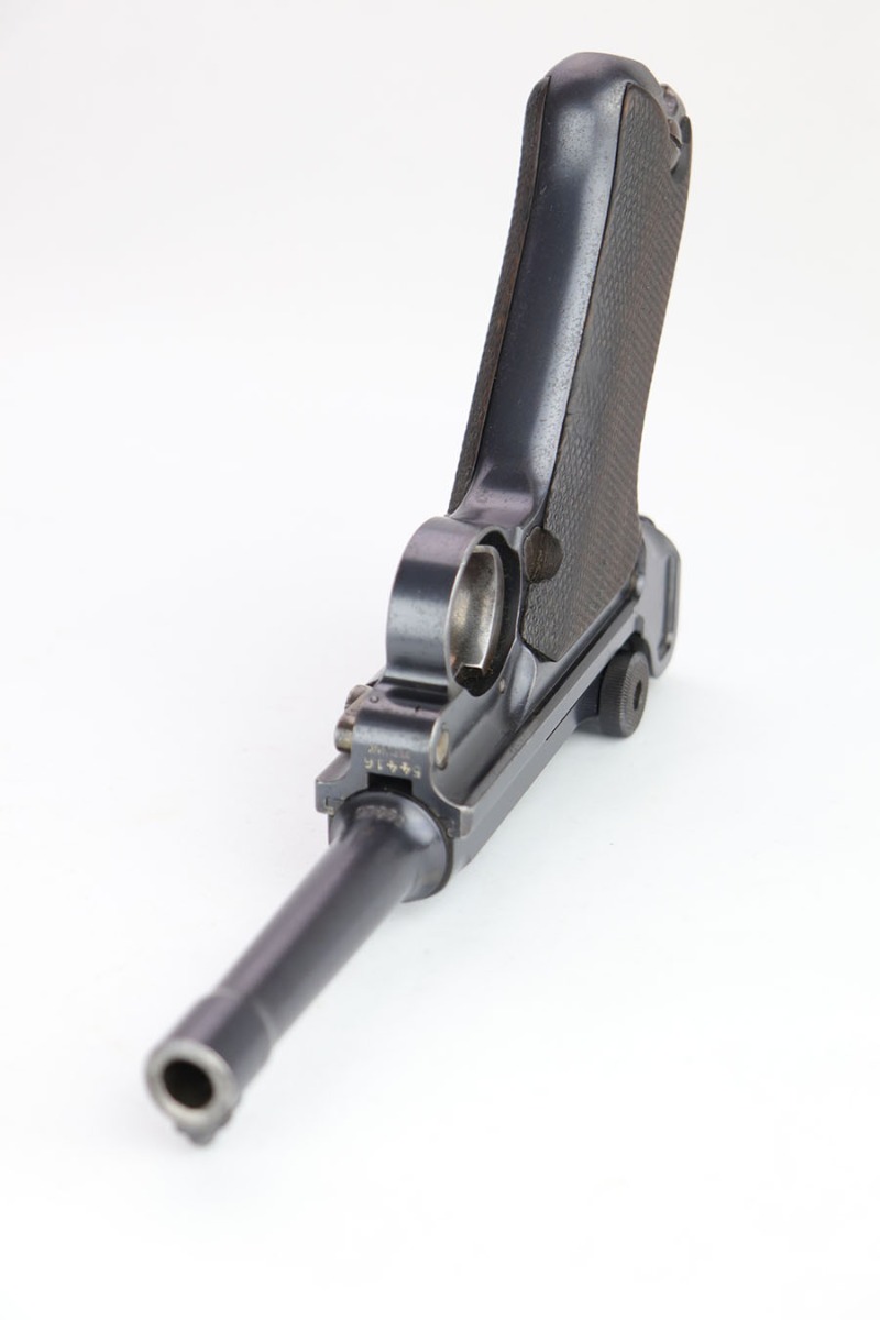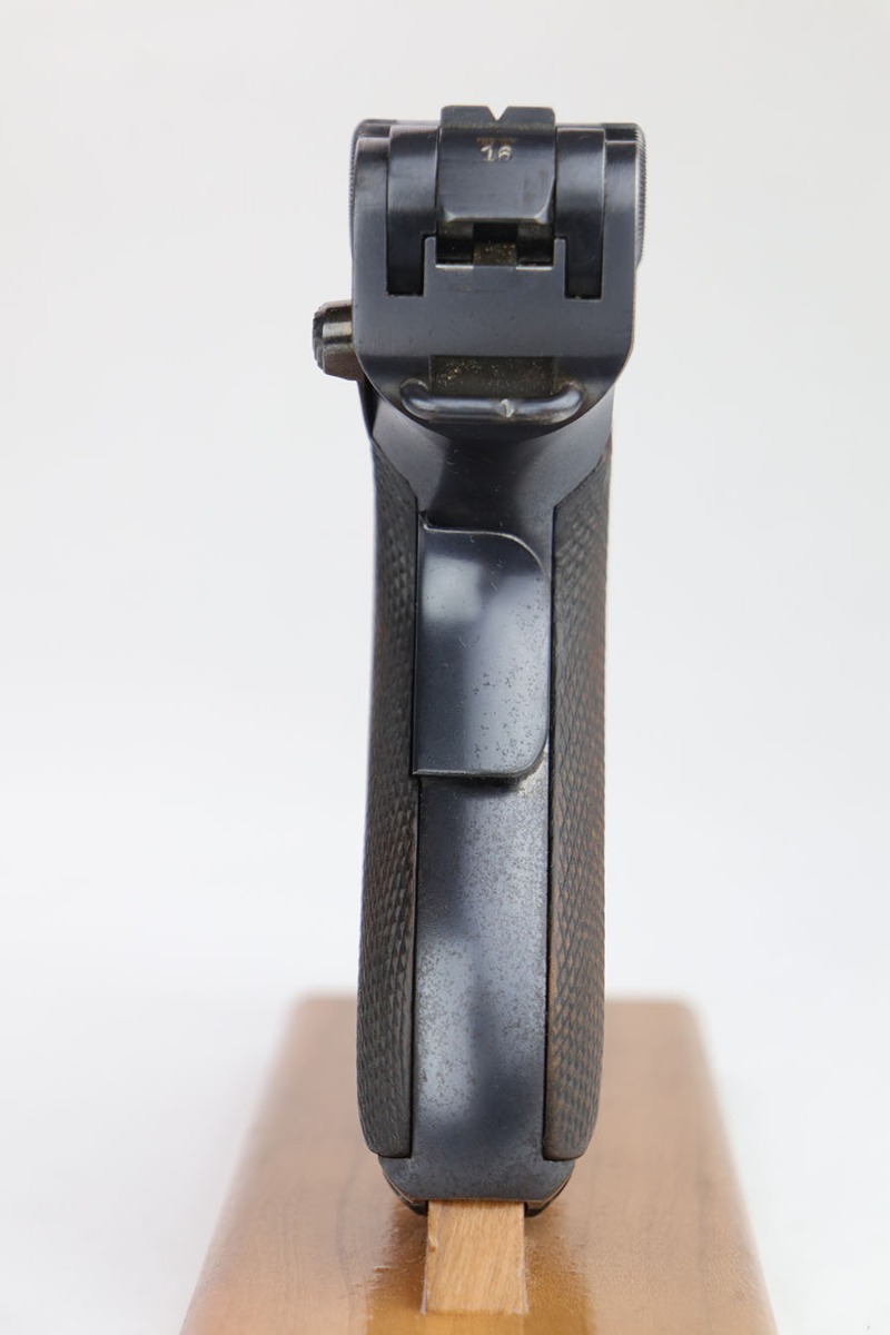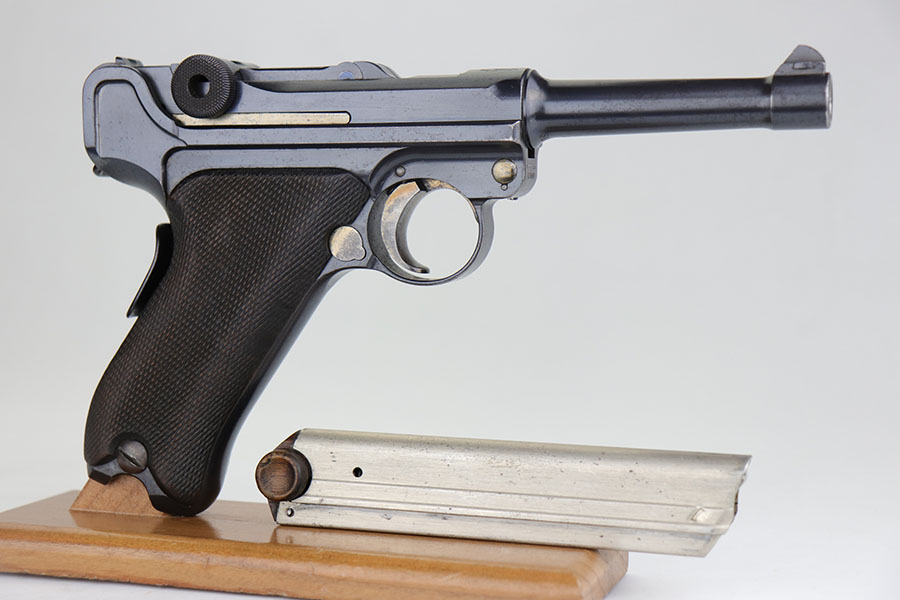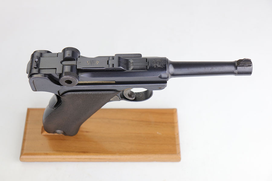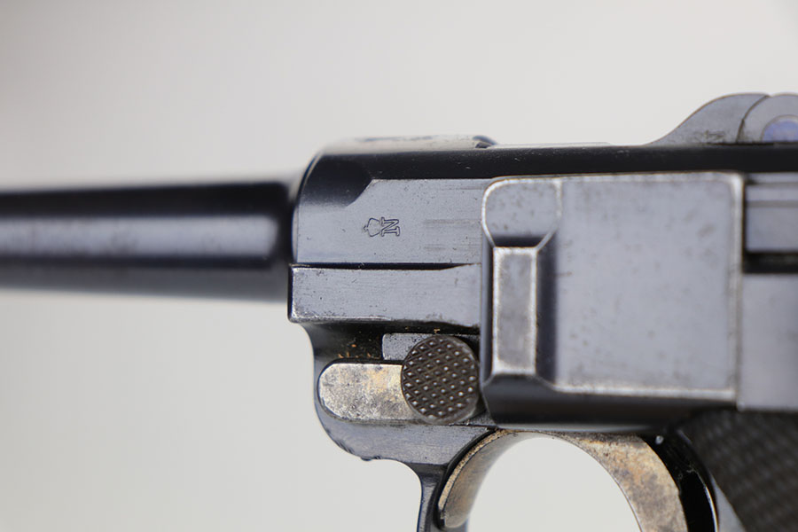 5/25/20 – This is a very nice, all original 1906 DWM American Eagle Luger. The pistol is all matching with about 95% polished blue remaining, with standard high edge wear. The bluing is somewhat tough to rate as there’s very little actual bluing loss, but oxidation spots all over the pistol, especially the straps. Small parts retain about 50% original straw. Grips show minor handling wear but no major flaws and have nice checkering. They are unmarked. The pistol comes with the rare and desirable ‘CAL. 9M/M’ bottom, which can sell for about $400 on its. The bore is shiny with strong rifling and only minor signs of use. These pistols went to the US retail market and the manufacturers at DWM realized that nation-based crests increased sales of these lugers, so that is why you find the American Eagle over the chamber. This is also why you see GERMANY marked on the frame, denoting these were exported for commercial sale.