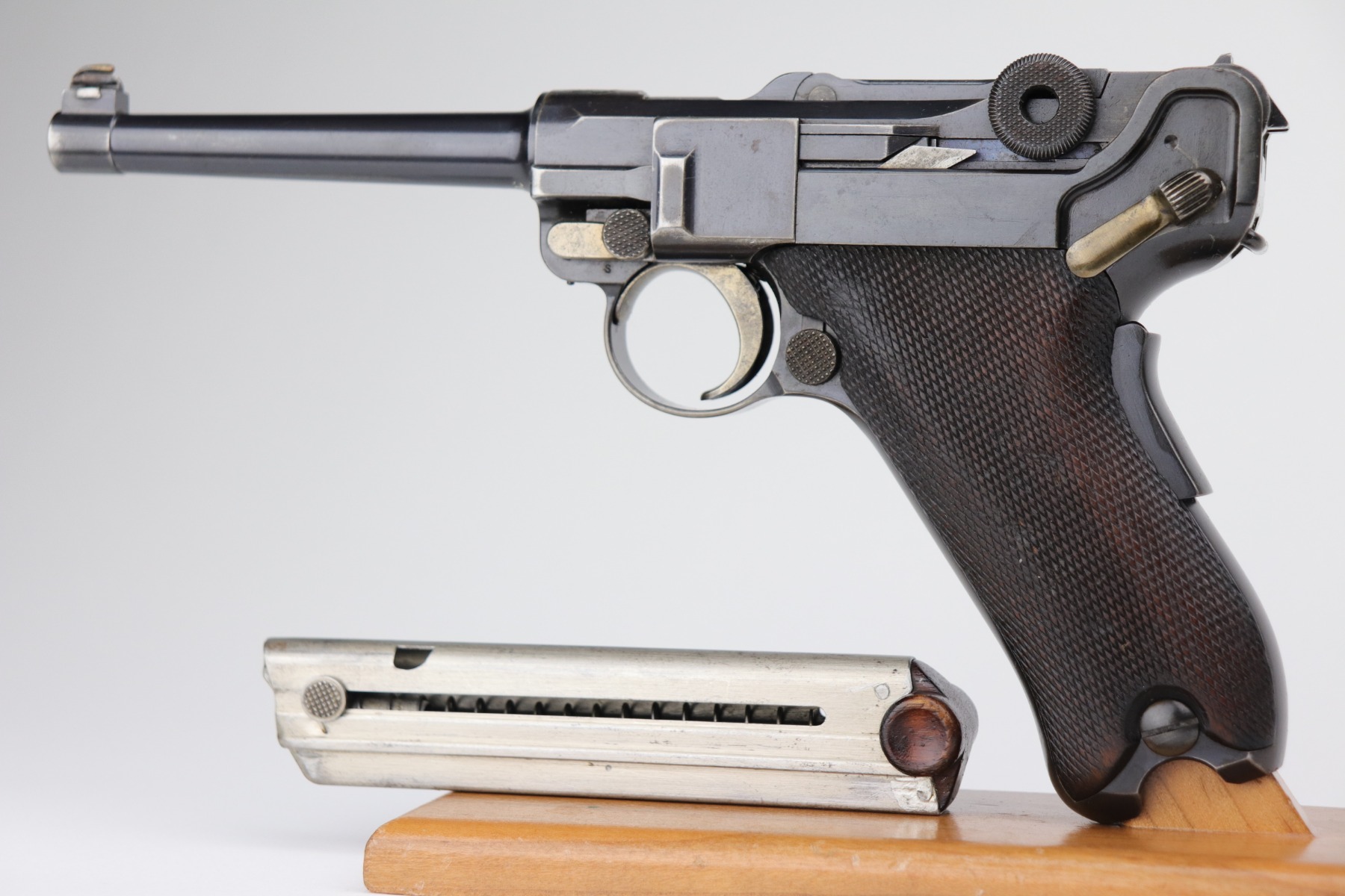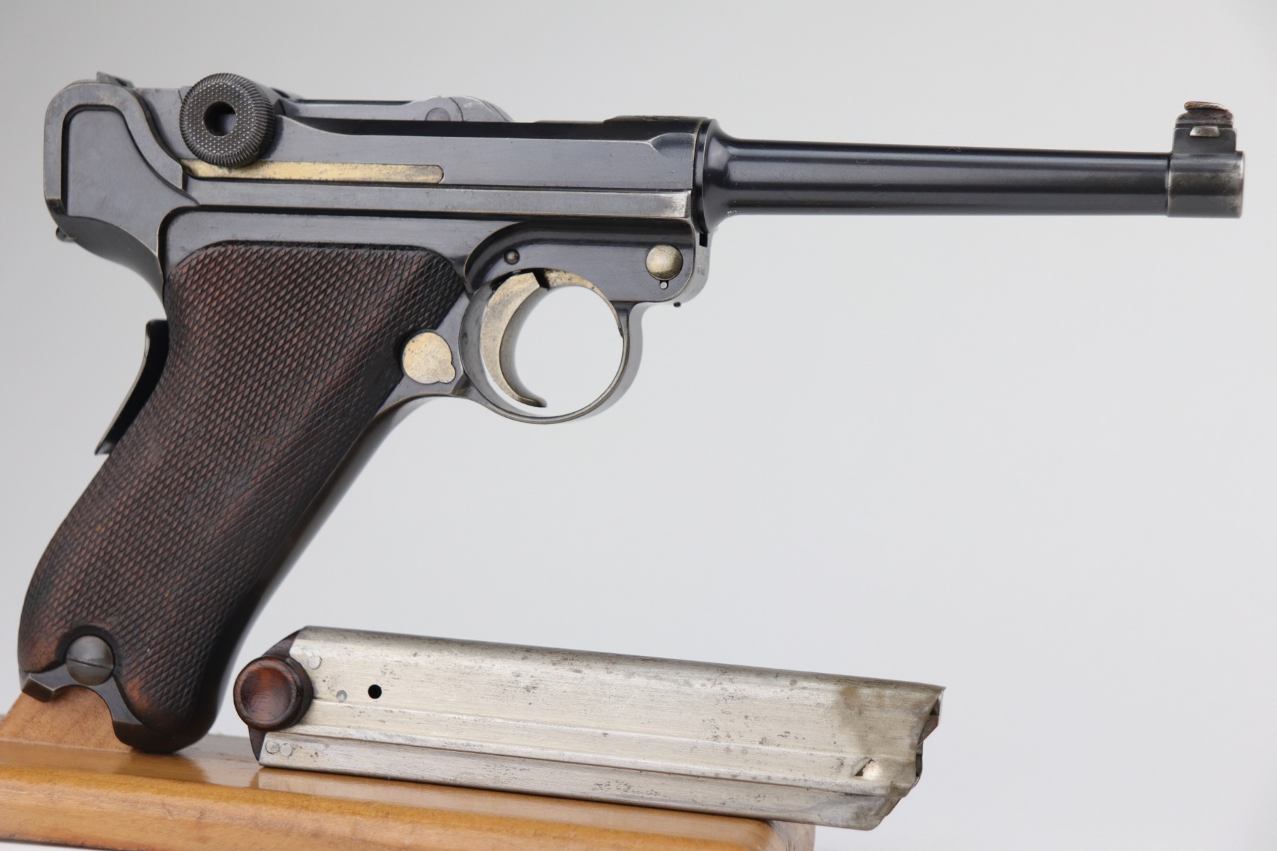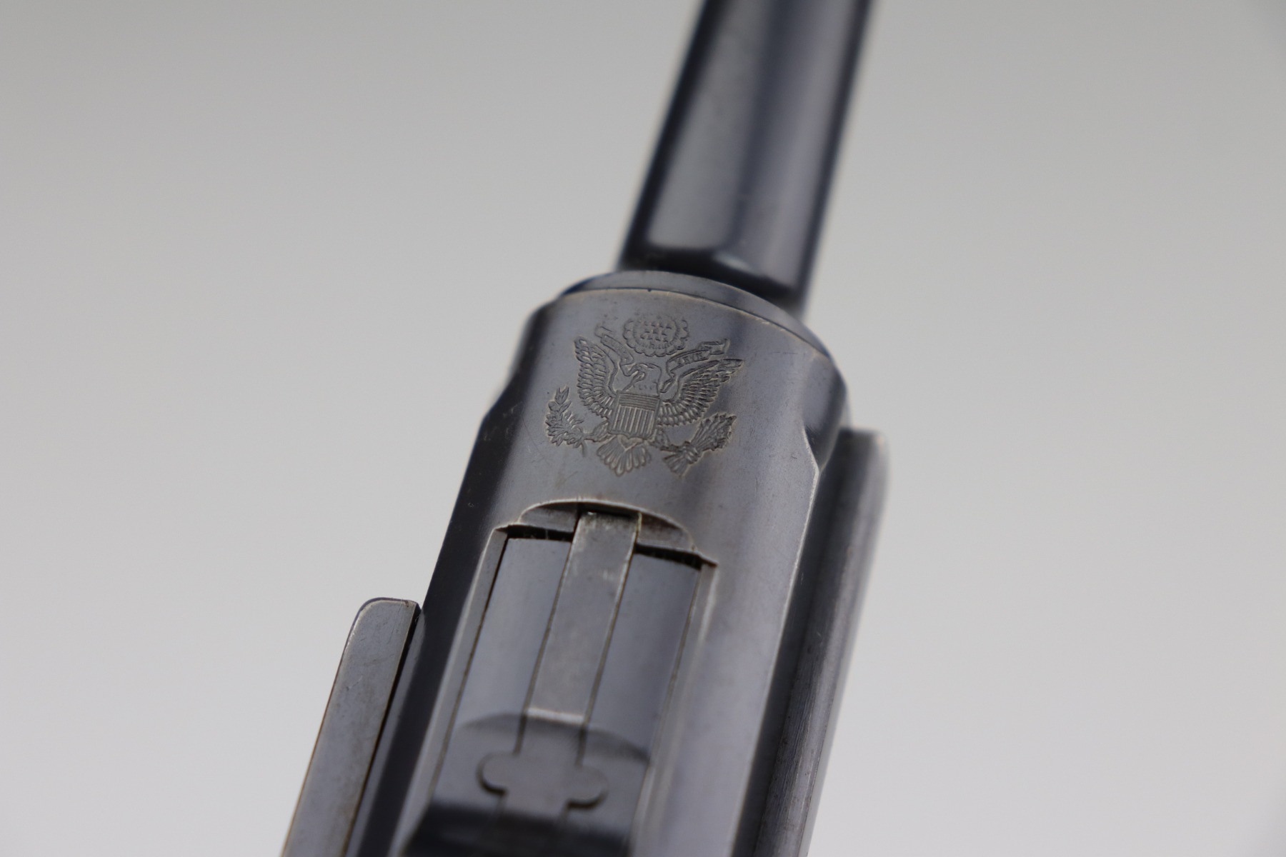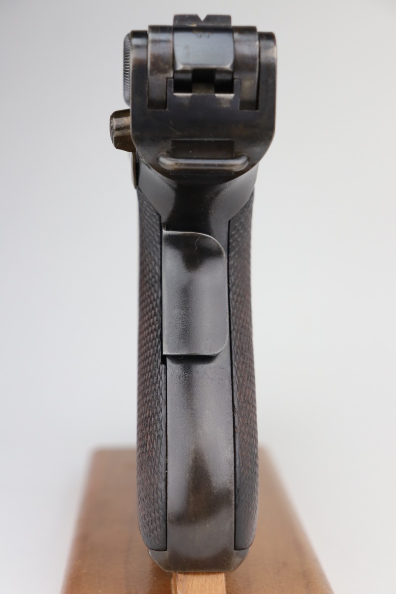 1/15/21 – This is an excellent, all original 1906 DWM American Eagle Luger, chambered in .30 Luger. These pistols went to the US retail market and the manufacturers at DWM realized that nation-based crests increased sales of these Lugers, so that is why you find the American Eagle over the chamber. This is also why you see GERMANY marked on the frame, denoting these were exported for commercial sale. This particular gun has retained about 95-96% of its original bluing. There is minor wear around the muzzle, side plate, and high edges of the frame. Very minor thinning and brown patina on the straps. There is some spotty discoloration mostly on the left side of the gun. It comes with excellent grips and a correct un-numbered magazine. The rifling in the bore is a bit worn and there’s minor pin-pricking throughout.