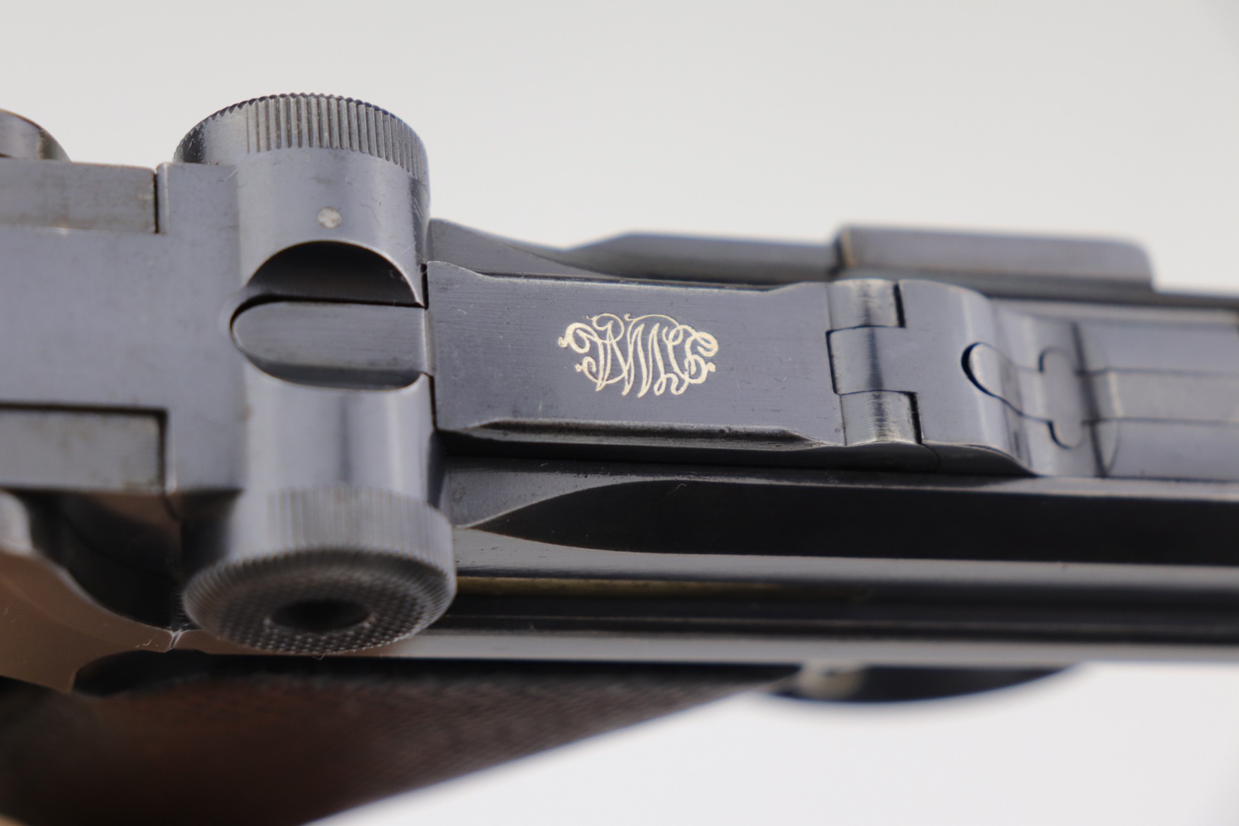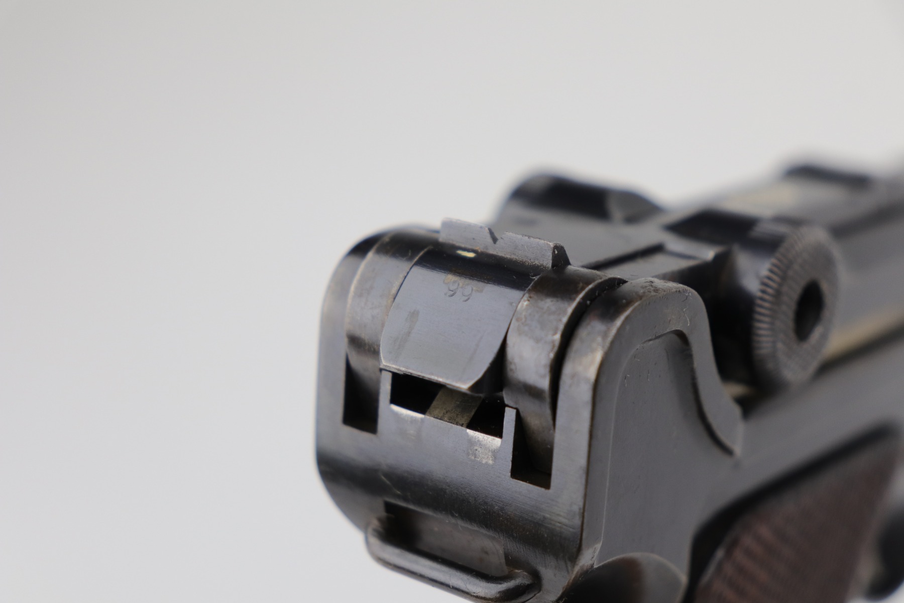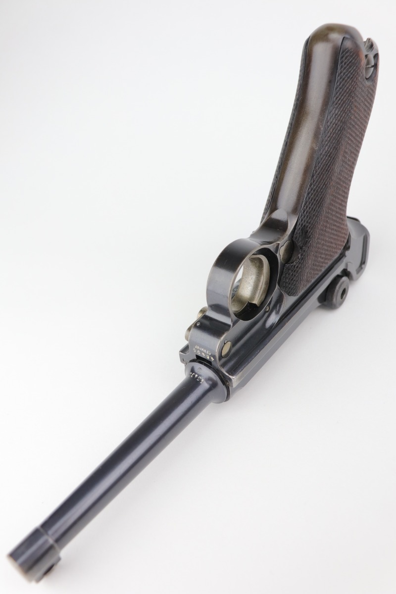 1/15/21 – This is an excellent, all original 1906 DWM American Eagle Luger, chambered in .30 Luger. These pistols went to the US retail market and the manufacturers at DWM realized that nation-based crests increased sales of these Lugers, so that is why you find the American Eagle over the chamber. This is also why you see GERMANY marked on the frame, denoting these were exported for commercial sale. This particular gun has retained about 95-96% of its original bluing. There is minor wear around the muzzle, side plate, and high edges of the frame. Very minor thinning and brown patina on the straps. There is some spotty discoloration mostly on the left side of the gun. It comes with excellent grips and a correct un-numbered magazine. The rifling in the bore is a bit worn and there’s minor pin-pricking throughout.