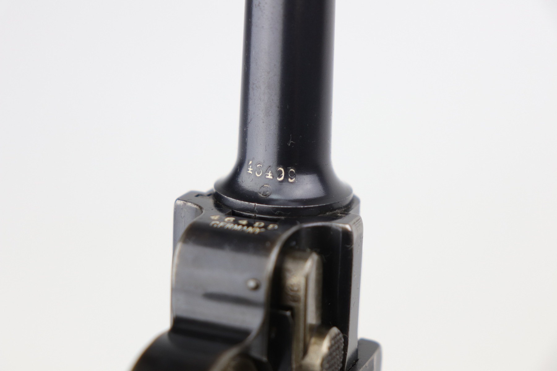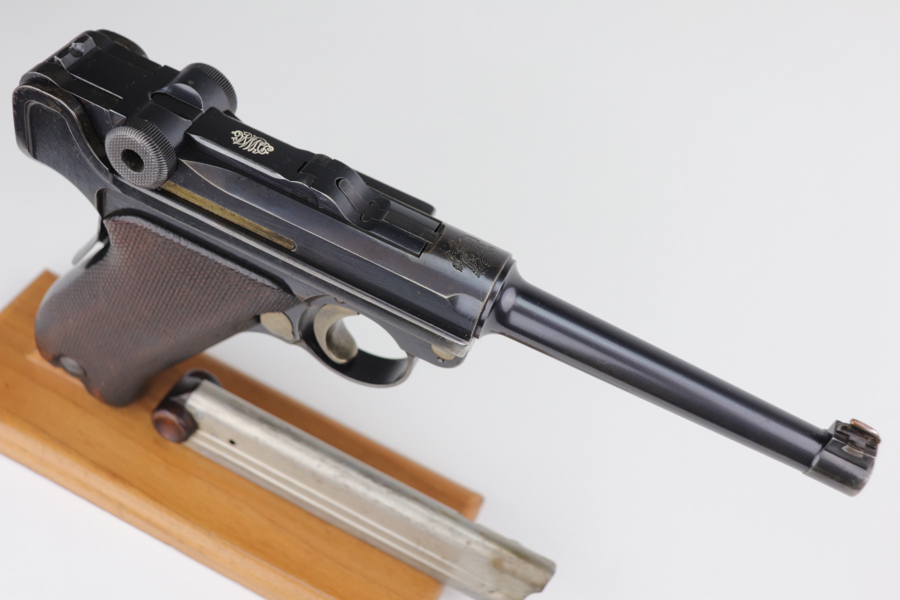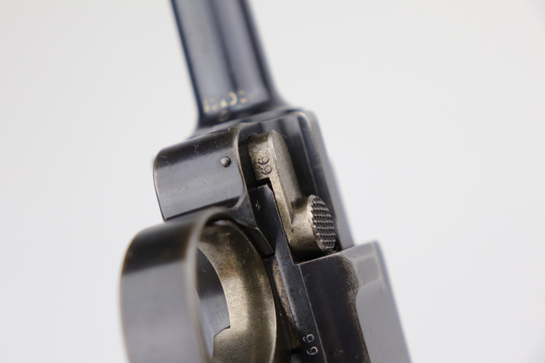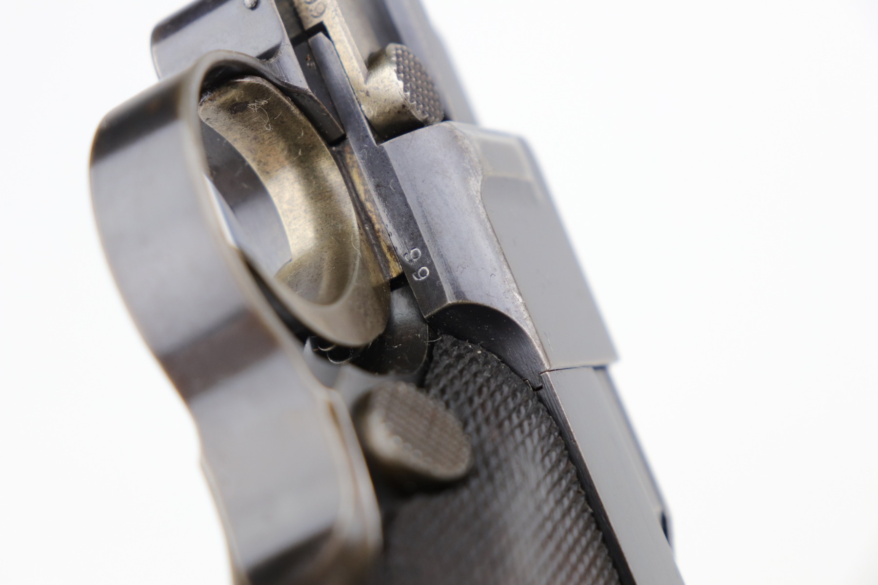1/15/21 – This is an excellent, all original 1906 DWM American Eagle Luger, chambered in .30 Luger. These pistols went to the US retail market and the manufacturers at DWM realized that nation-based crests increased sales of these Lugers, so that is why you find the American Eagle over the chamber. This is also why you see GERMANY marked on the frame, denoting these were exported for commercial sale. This particular gun has retained about 95-96% of its original bluing. There is minor wear around the muzzle, side plate, and high edges of the frame. Very minor thinning and brown patina on the straps. There is some spotty discoloration mostly on the left side of the gun. It comes with excellent grips and a correct un-numbered magazine. The rifling in the bore is a bit worn and there’s minor pin-pricking throughout.