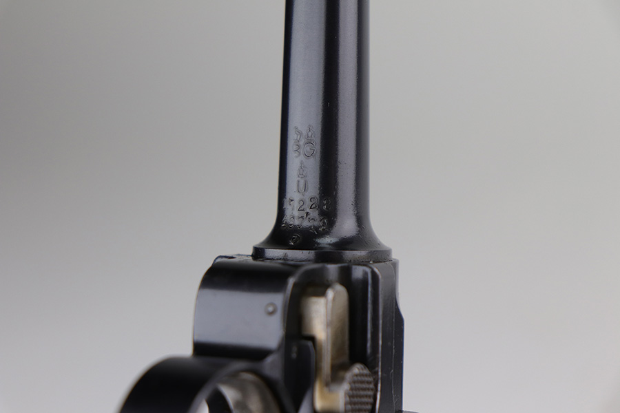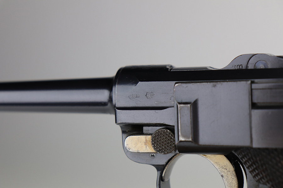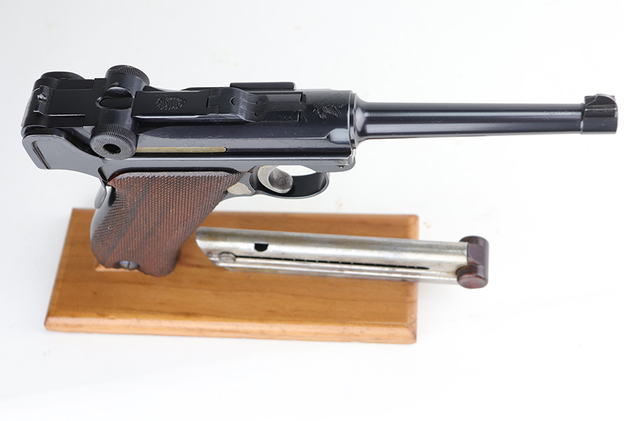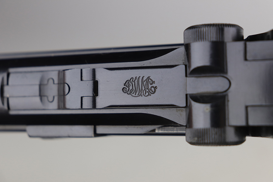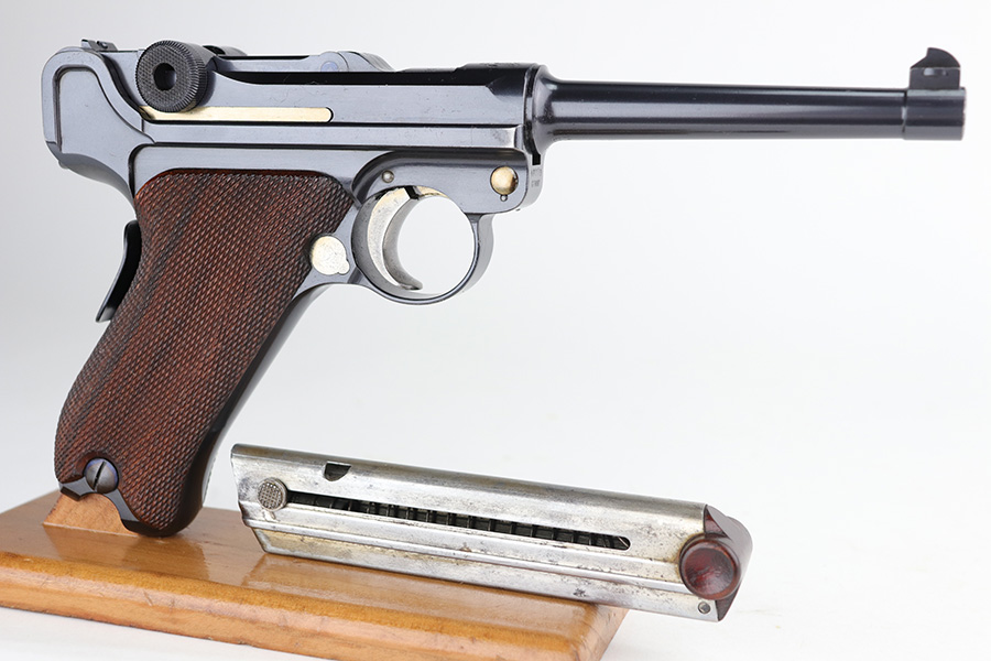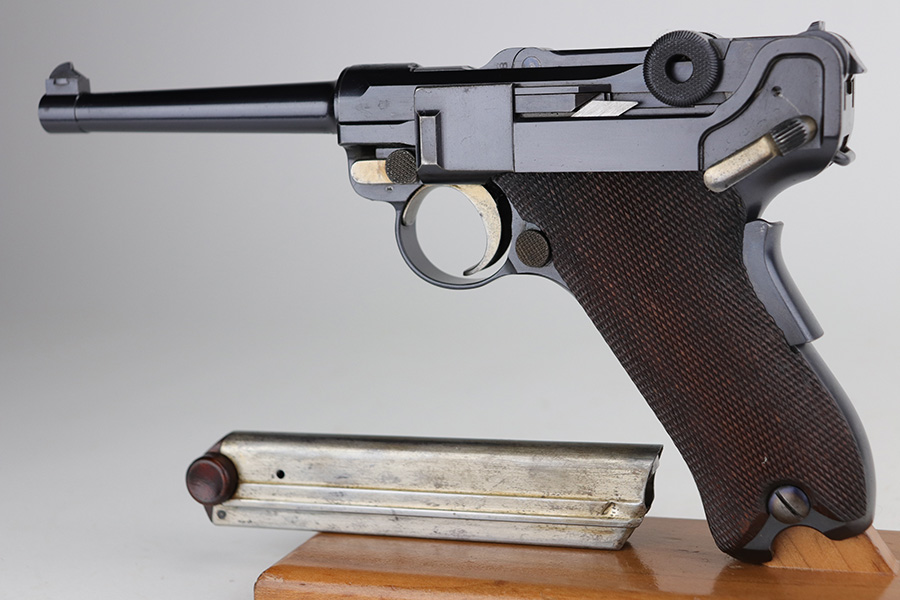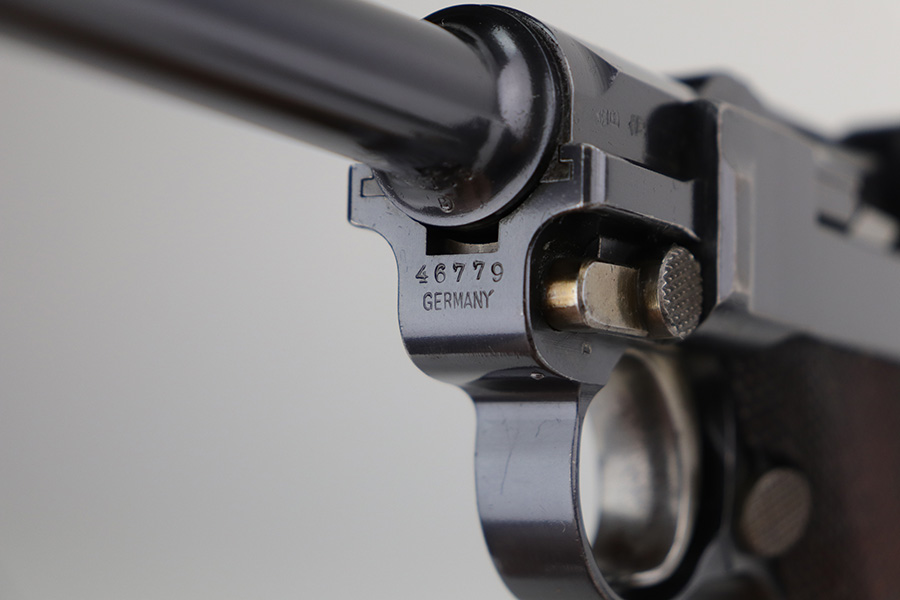 8/20/21 – This is a scarce DWM model 1906 luger with American Eagle crest on the chamber. These pistols went to the US retail market and the manufacturers at DWM realized that nation-based crests increased sales of these lugers, so that is why you find the American Eagle over the chamber. This is also why you see GERMANY marked on the frame, denoting these were exported for commercial sale. This pistol is in minty original condition, with almost zero bluing loss. There’s a hint of high edge wear on the sideplate and a bit of oxidation on the straps. All matching numbers on the pistol with correct blank-bottom wood magazine. Mint bore. The excellent grips are unmarked.