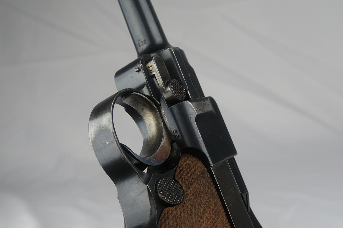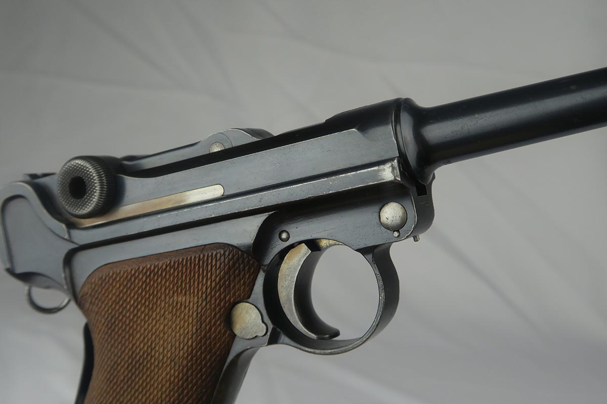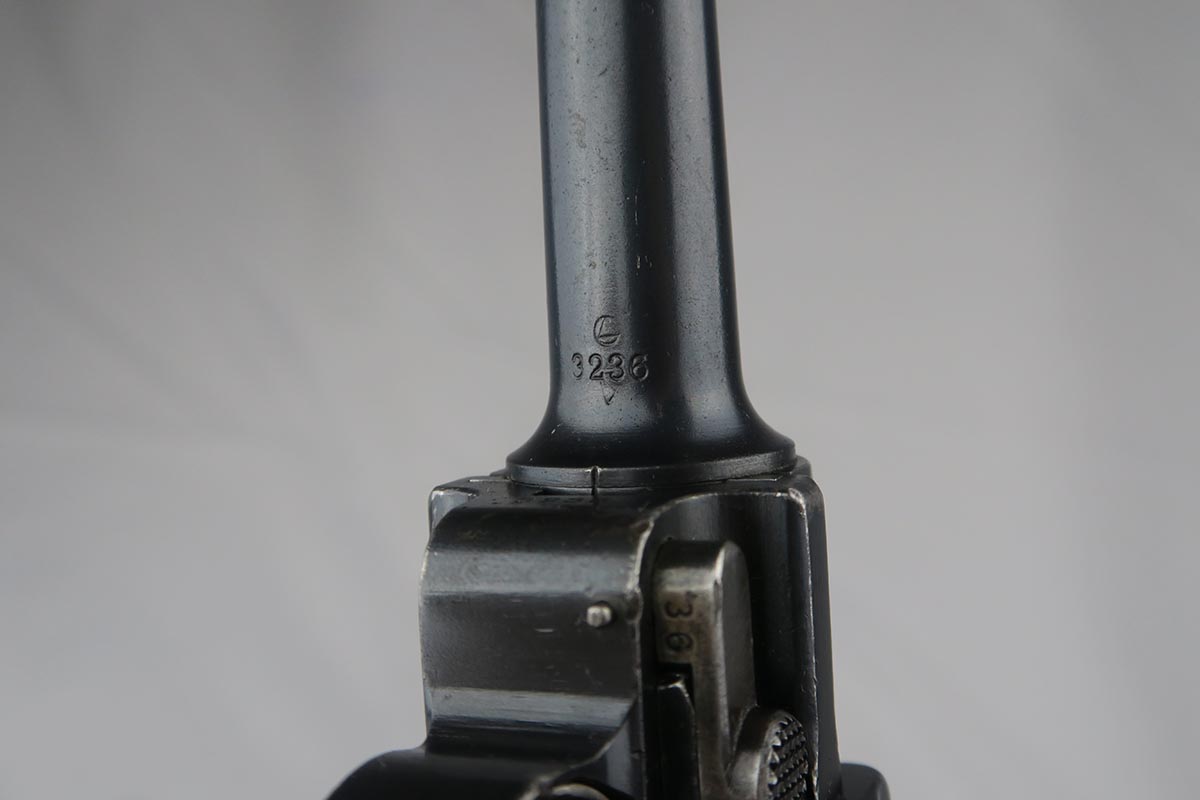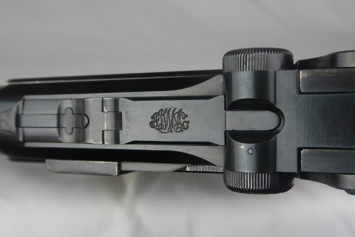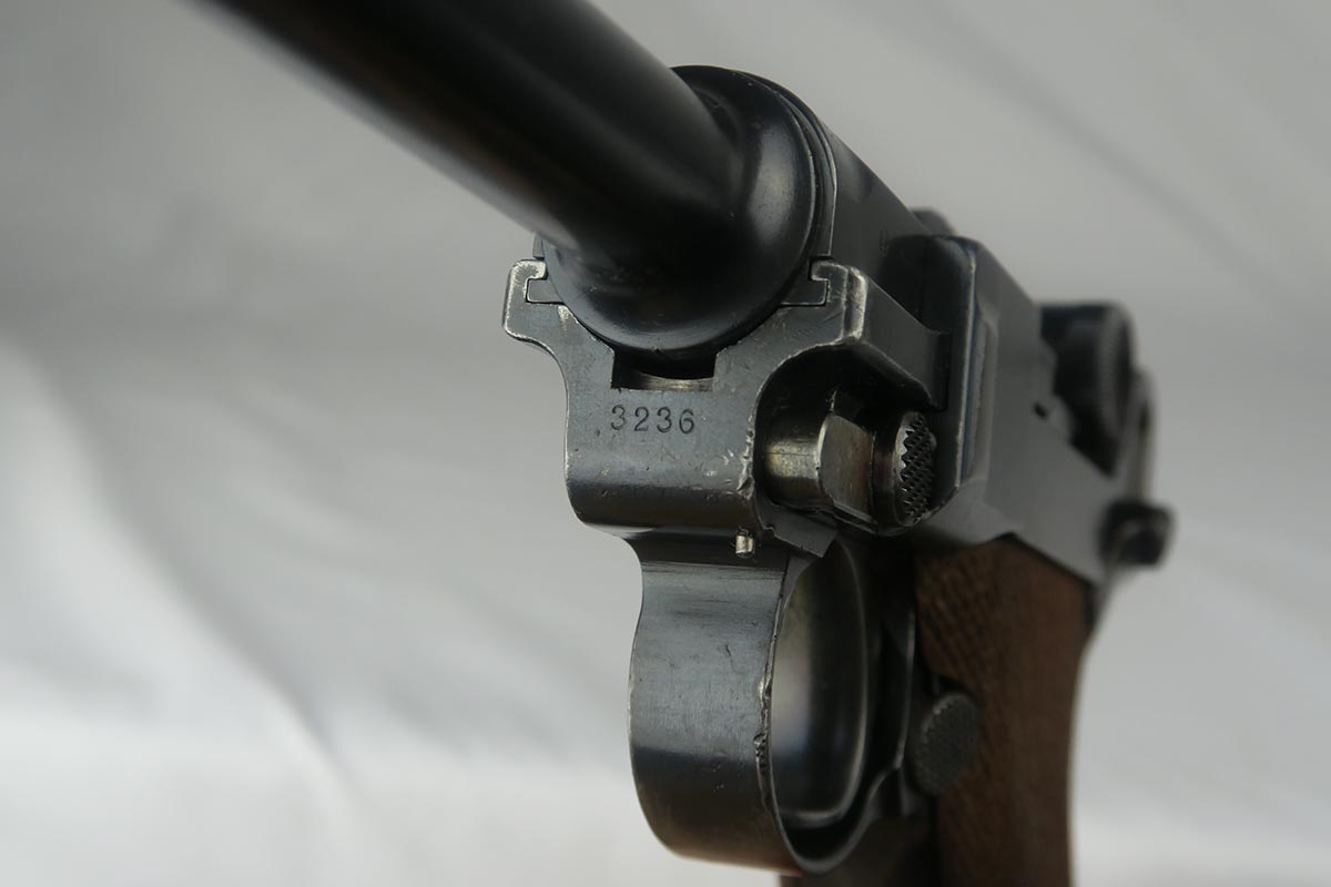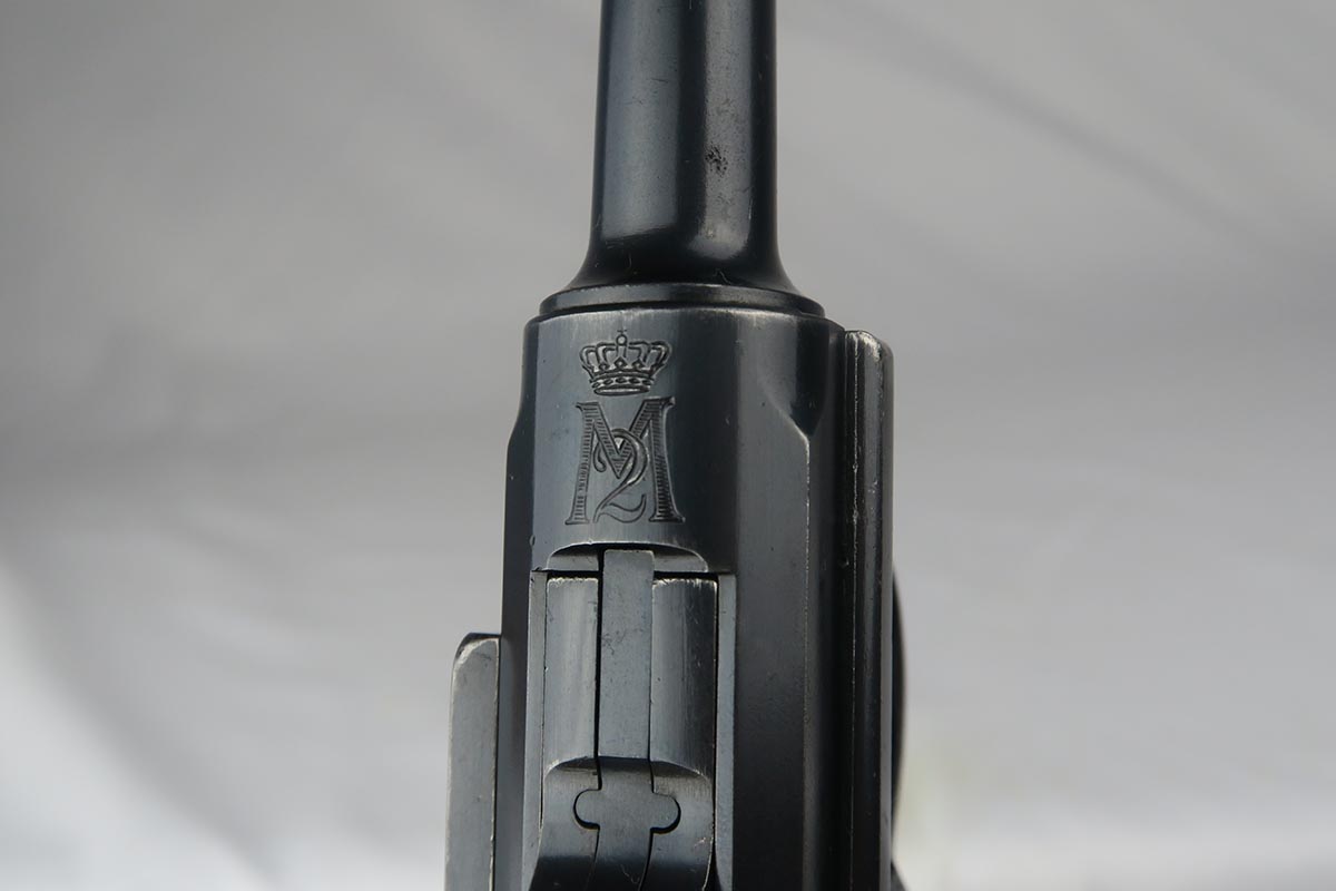 9/14/17 – This is one of the approximately 5,000 Model 1906 DWM Lugers made for the Royal Portuguese Army. The Royal Portuguese Crest of Manuel II is present on top of the chamber, with the DWM scroll marking on the toggle and “CARREGADA” is marked on the extractor. A triangle in a circle is marked on the rear of frame and barrel underside. All parts are matching with the serial number on the frame and barrel, takedown latch, side plate, and toggle links. Grips are proper and unnumbered. This contract was for 5,000 Lugers in 30 caliber, and without the lug stock. The original finish is about 90%, with some thinning/finish loss on the straps. All matching gun with correct magazine – triangle in a circle proof. Minty bore.