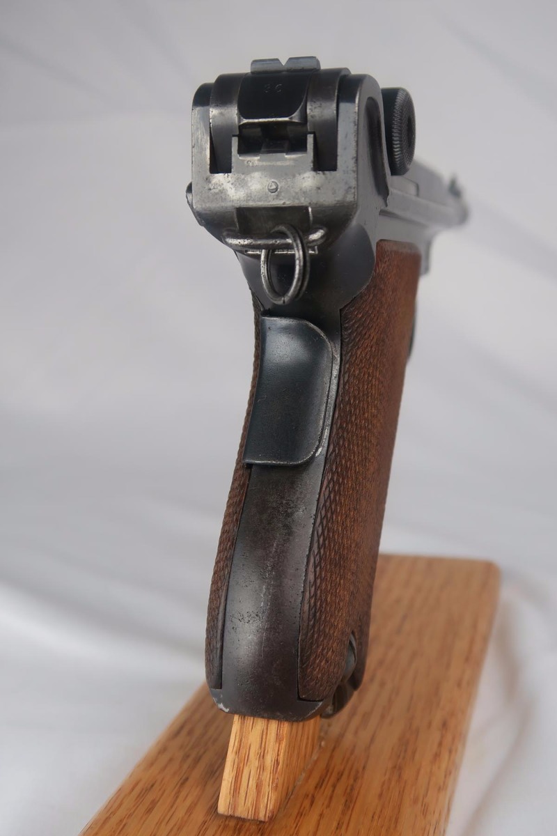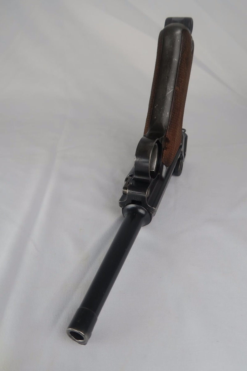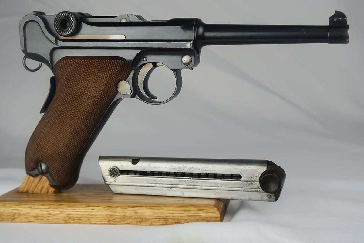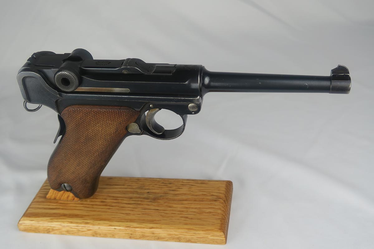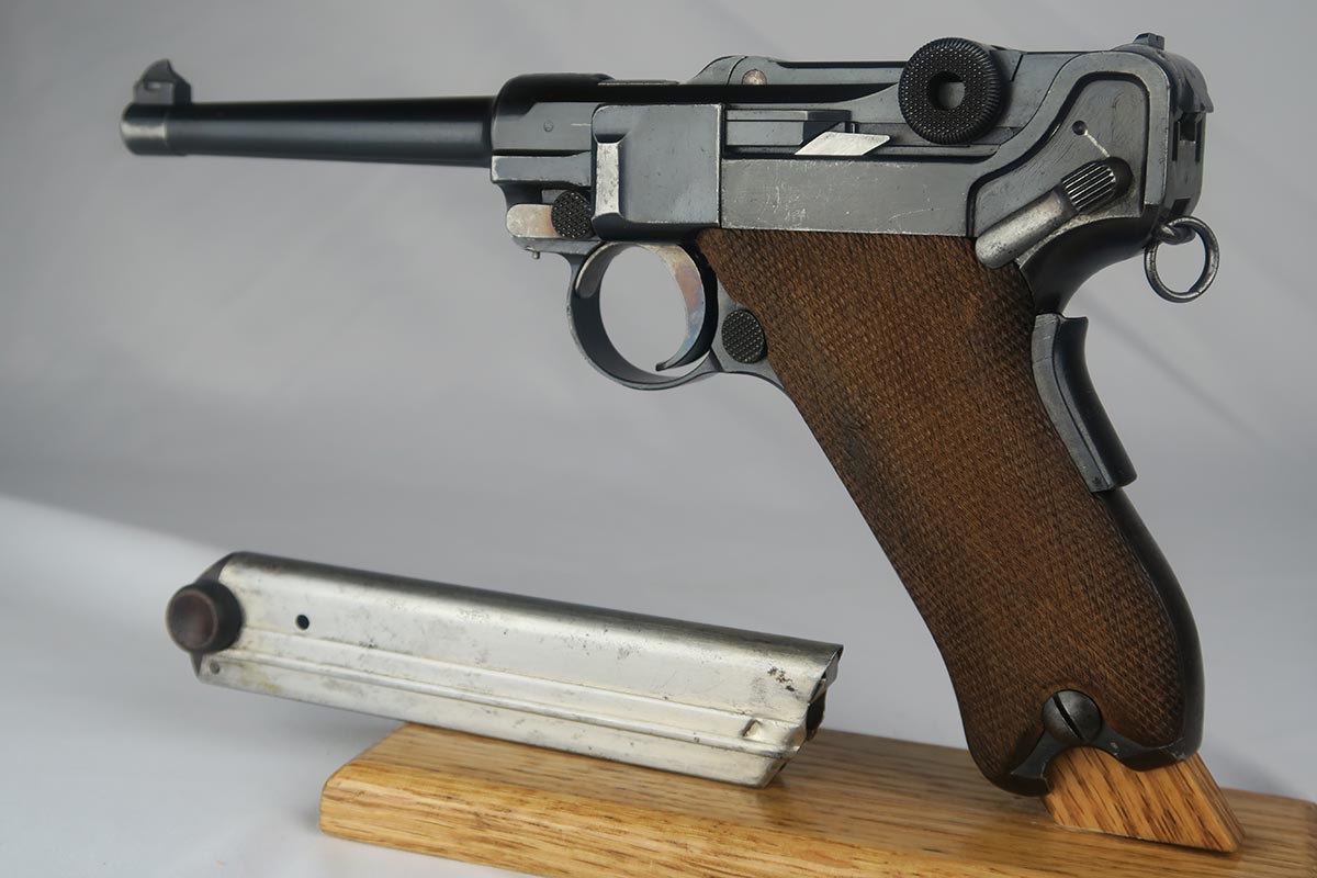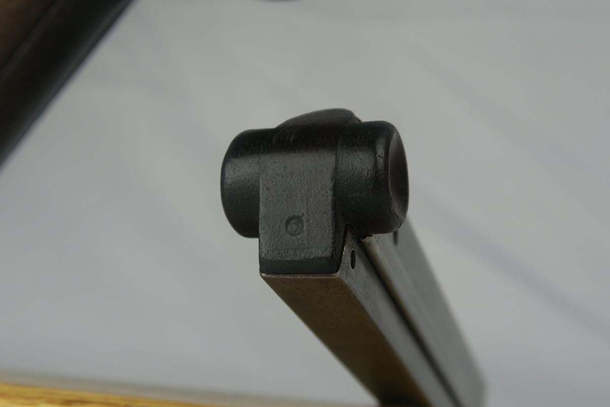 9/14/17 – This is one of the approximately 5,000 Model 1906 DWM Lugers made for the Royal Portuguese Army. The Royal Portuguese Crest of Manuel II is present on top of the chamber, with the DWM scroll marking on the toggle and “CARREGADA” is marked on the extractor. A triangle in a circle is marked on the rear of frame and barrel underside. All parts are matching with the serial number on the frame and barrel, takedown latch, side plate, and toggle links. Grips are proper and unnumbered. This contract was for 5,000 Lugers in 30 caliber, and without the lug stock. The original finish is about 90%, with some thinning/finish loss on the straps. All matching gun with correct magazine – triangle in a circle proof. Minty bore.
