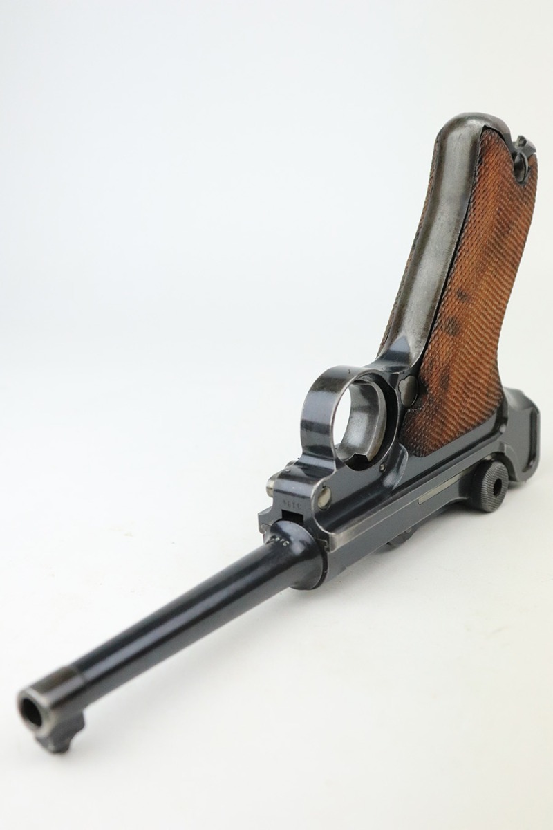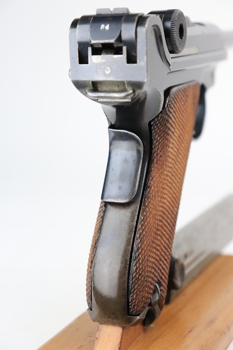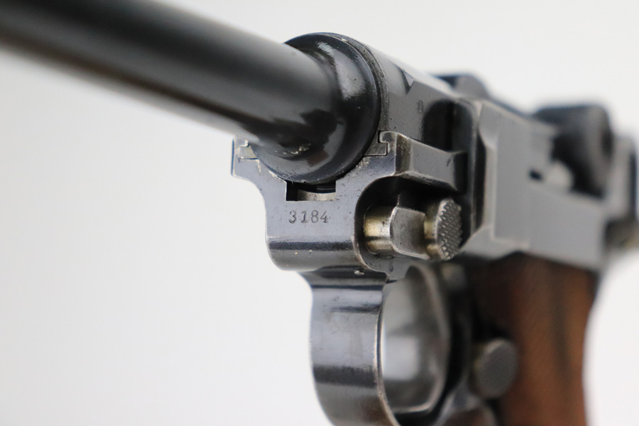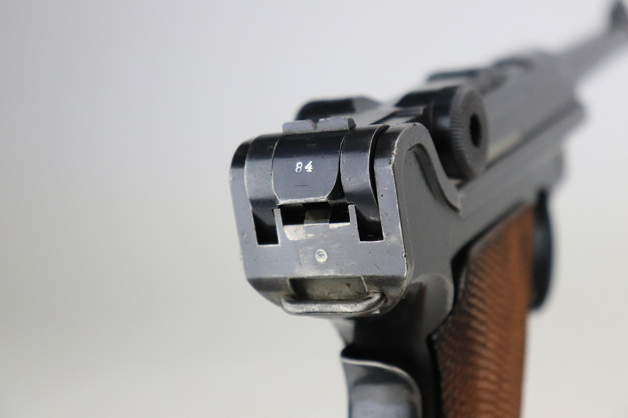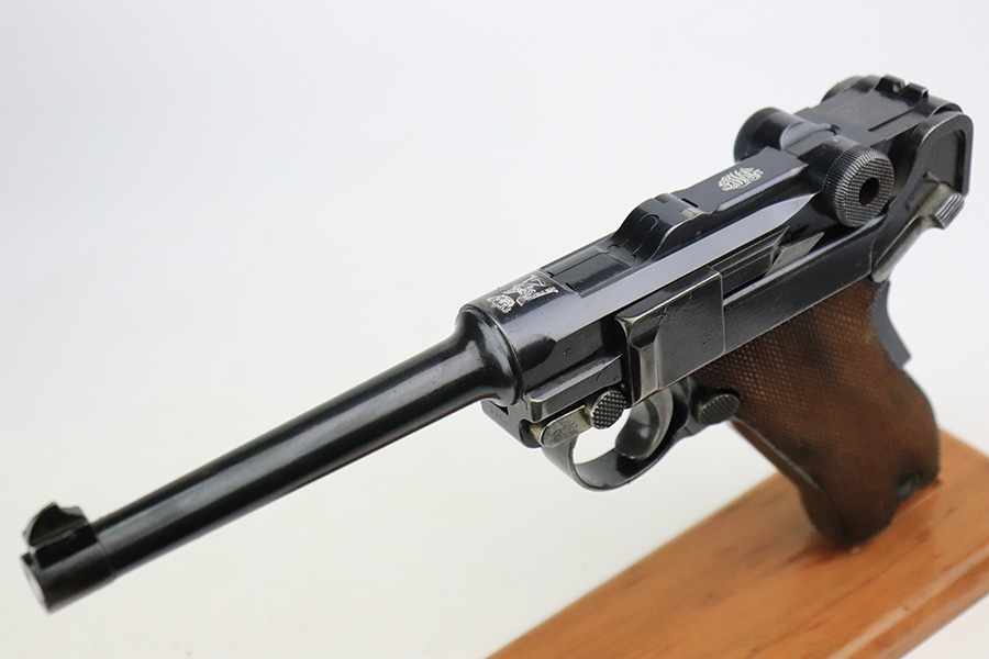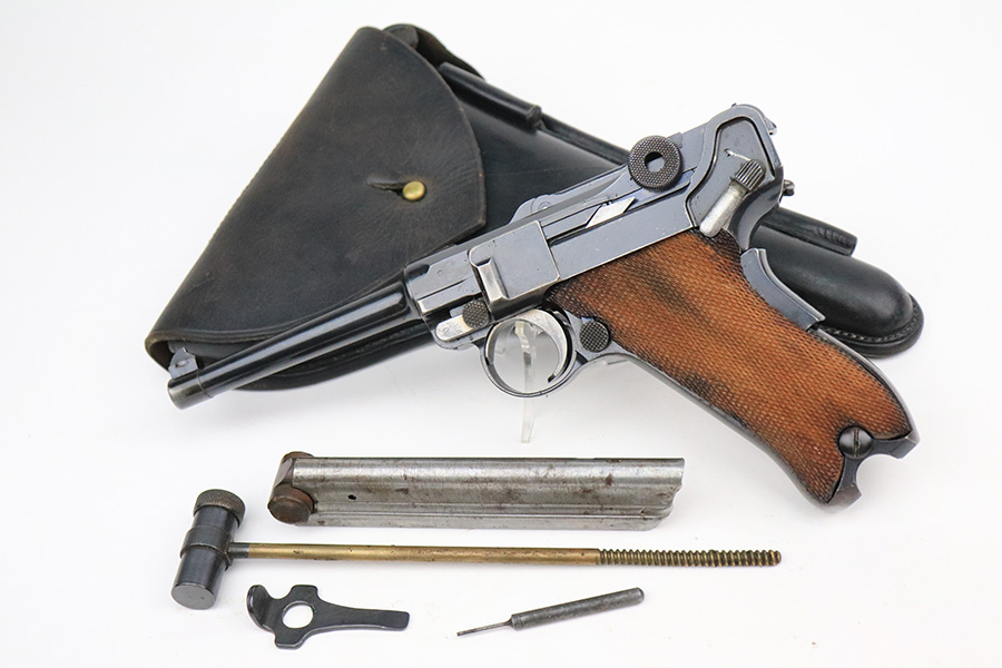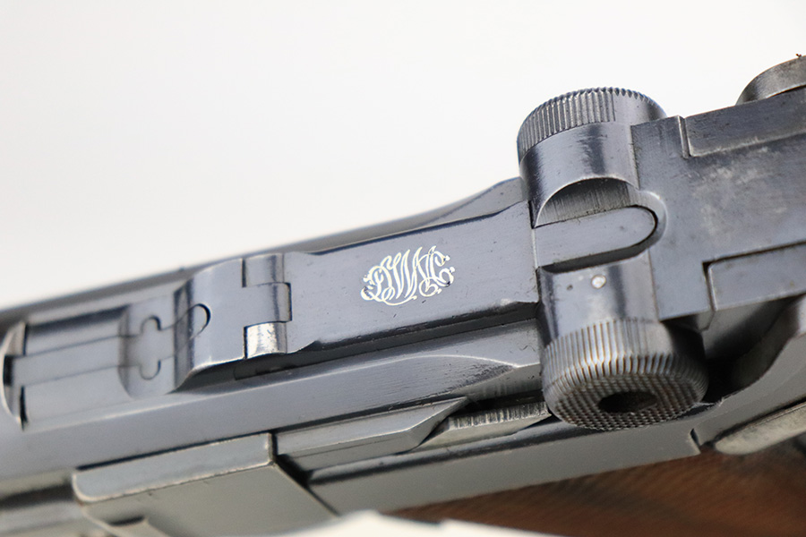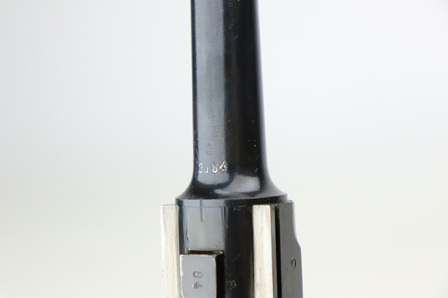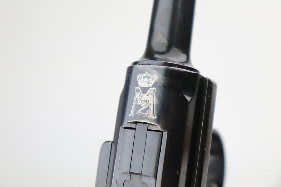6/7/22 – This is one of the approximately 5,000 Model 1906 DWM Lugers made for the Royal Portuguese Army. The Royal Portuguese Crest of Manuel II is present on top of the chamber, with the DWM scroll marking on the toggle. A triangle in a circle is marked on the rear of frame, underside of the barrel, and left side of the slide. All parts are matching. This contract was for 5,000 Lugers in 30 caliber, and without the lug stock. The finish rates roughly 75%. Most of the finish loss is on the grip straps, where there is also some light brown patina. There are also areas of wear on the side plate, side rails, around the chamber, and around the muzzle. An area of discoloration on the left side of the slide. Minty mismatched grips numbered “85”. The rifling in the bore is a bit worn with tiny pitting throughout. It comes as a rig with a proper Portuguese holster, cleaning rod/oiler, un-marked tool, spare firing pin, and a blank bottom wood magazine.