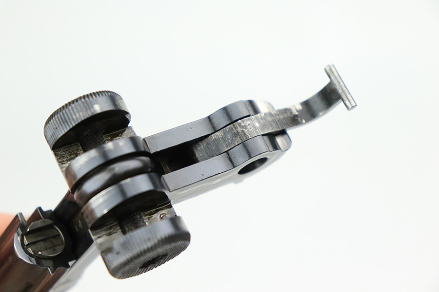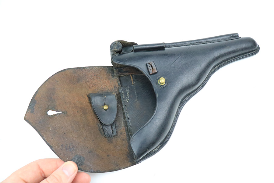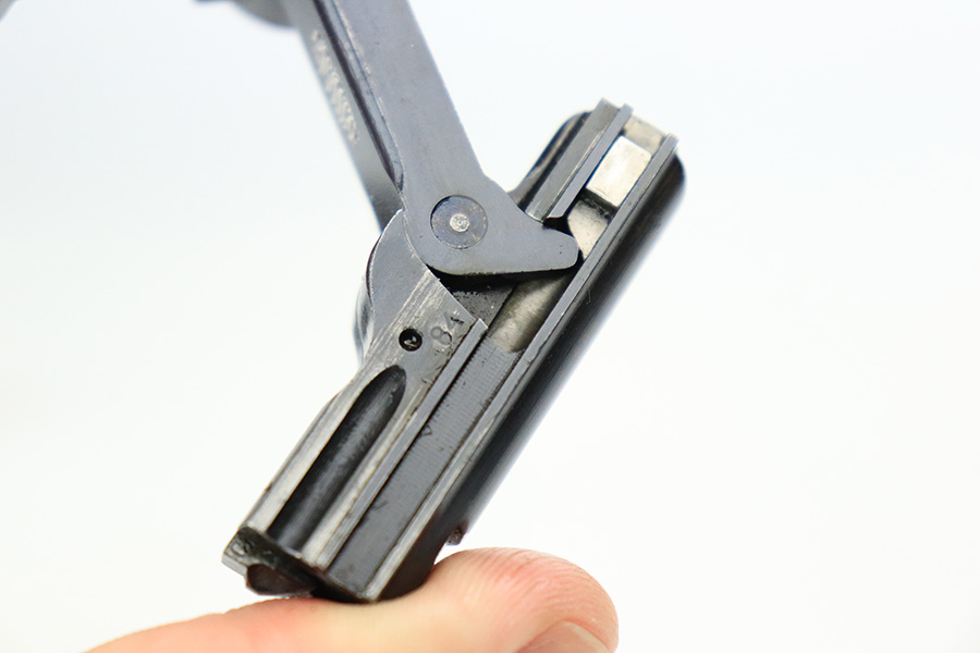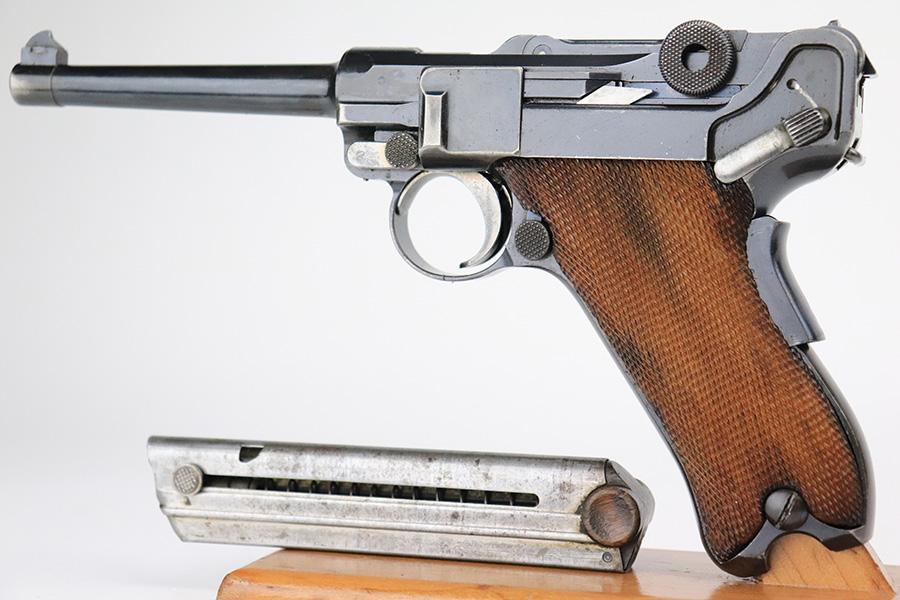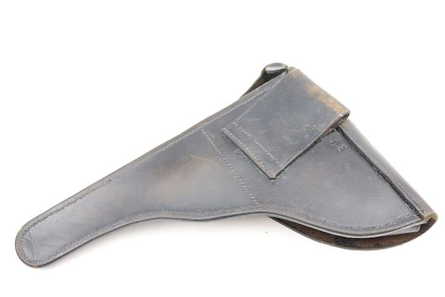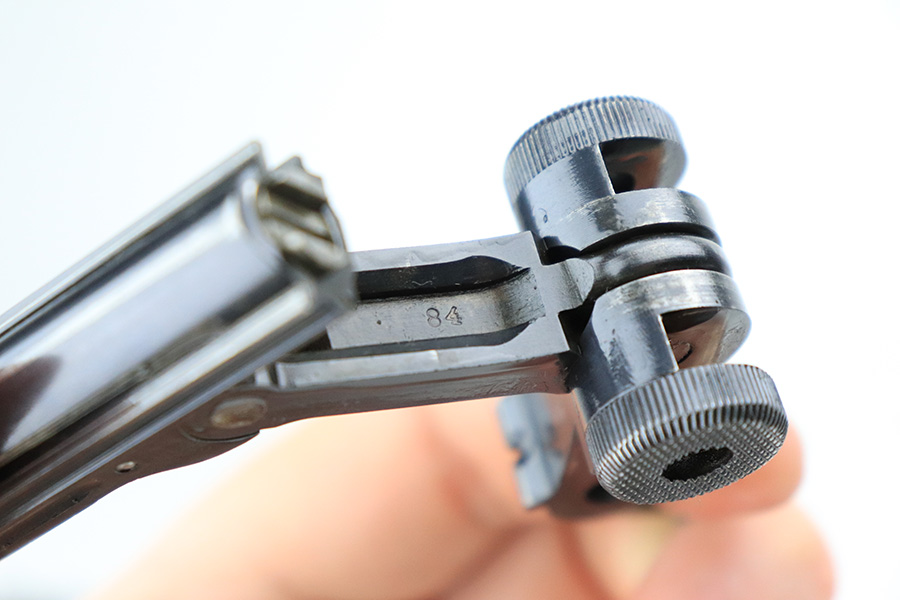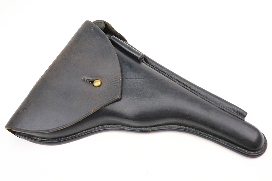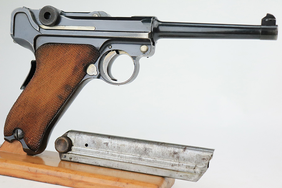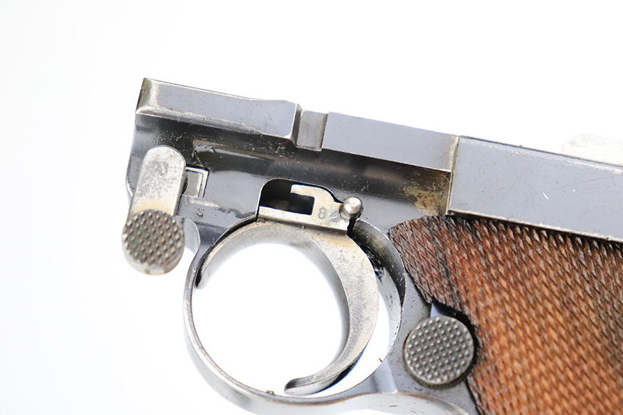 6/7/22 – This is one of the approximately 5,000 Model 1906 DWM Lugers made for the Royal Portuguese Army. The Royal Portuguese Crest of Manuel II is present on top of the chamber, with the DWM scroll marking on the toggle. A triangle in a circle is marked on the rear of frame, underside of the barrel, and left side of the slide. All parts are matching. This contract was for 5,000 Lugers in 30 caliber, and without the lug stock. The finish rates roughly 75%. Most of the finish loss is on the grip straps, where there is also some light brown patina. There are also areas of wear on the side plate, side rails, around the chamber, and around the muzzle. An area of discoloration on the left side of the slide. Minty mismatched grips numbered “85”. The rifling in the bore is a bit worn with tiny pitting throughout. It comes as a rig with a proper Portuguese holster, cleaning rod/oiler, un-marked tool, spare firing pin, and a blank bottom wood magazine.
