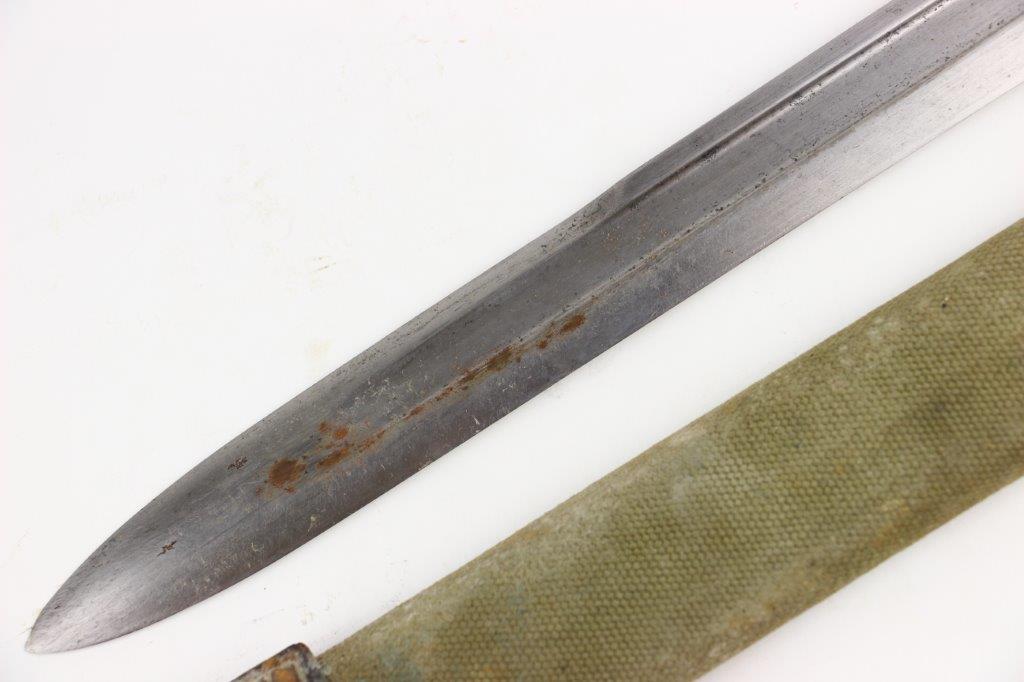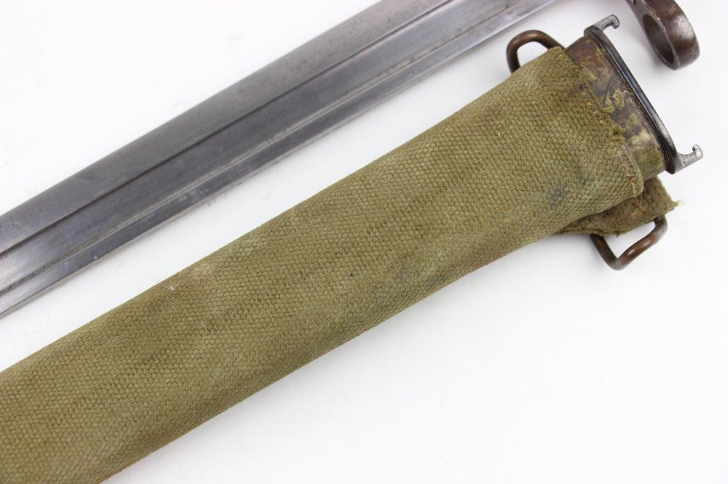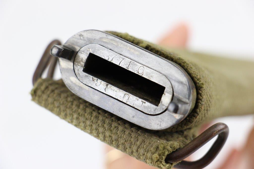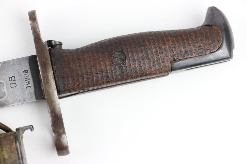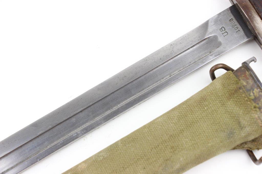 5/28/24 – This is an original, fairly rare M1905 Springfield Armory bayonet for the M1903 rifle. The bayonet features an uncut, 16 inch blade that’s in great condition (near-excellent considering its age). There’s some light patina and surface discoloration near the tip and along the edges of the blood groove. The blade edge is clean with light signs of use and aging wear. Minor surface scratches throughout as well, but this is typical. Maker stamped and dated at the base of the blade, as shown. The hand guard has natural patina and surface age but no rust or pitting. The pommel is excellent, as are the original wood grip panels. The scabbard is in great condition with a canvas cover and leather toe. The leather toe has some surface wear but is still intact. The mouth of the scabbard is numbered, as shown.