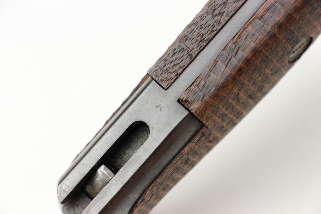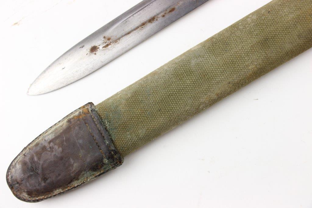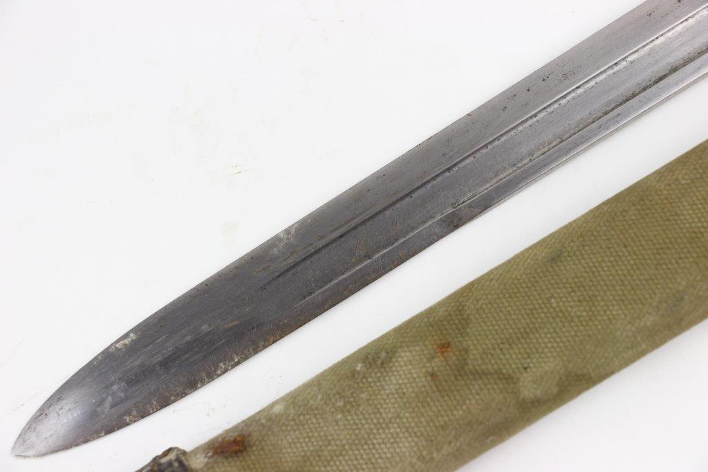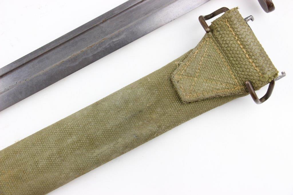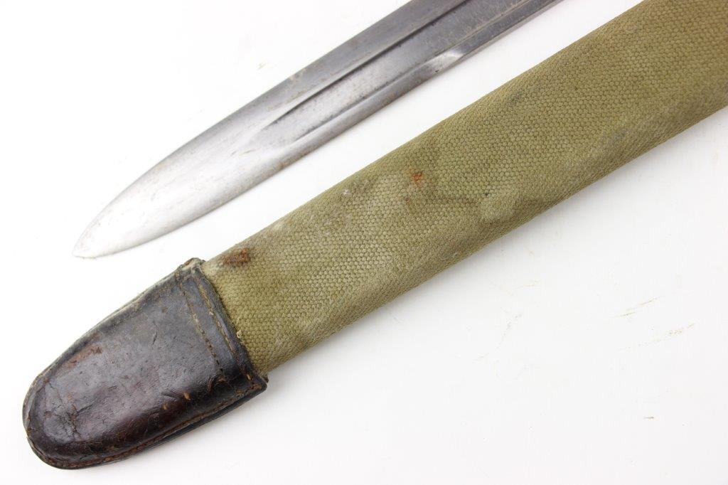 5/28/24 – This is an original, fairly rare M1905 Springfield Armory bayonet for the M1903 rifle. The bayonet features an uncut, 16 inch blade that’s in great condition (near-excellent considering its age). There’s some light patina and surface discoloration near the tip and along the edges of the blood groove. The blade edge is clean with light signs of use and aging wear. Minor surface scratches throughout as well, but this is typical. Maker stamped and dated at the base of the blade, as shown. The hand guard has natural patina and surface age but no rust or pitting. The pommel is excellent, as are the original wood grip panels. The scabbard is in great condition with a canvas cover and leather toe. The leather toe has some surface wear but is still intact. The mouth of the scabbard is numbered, as shown.