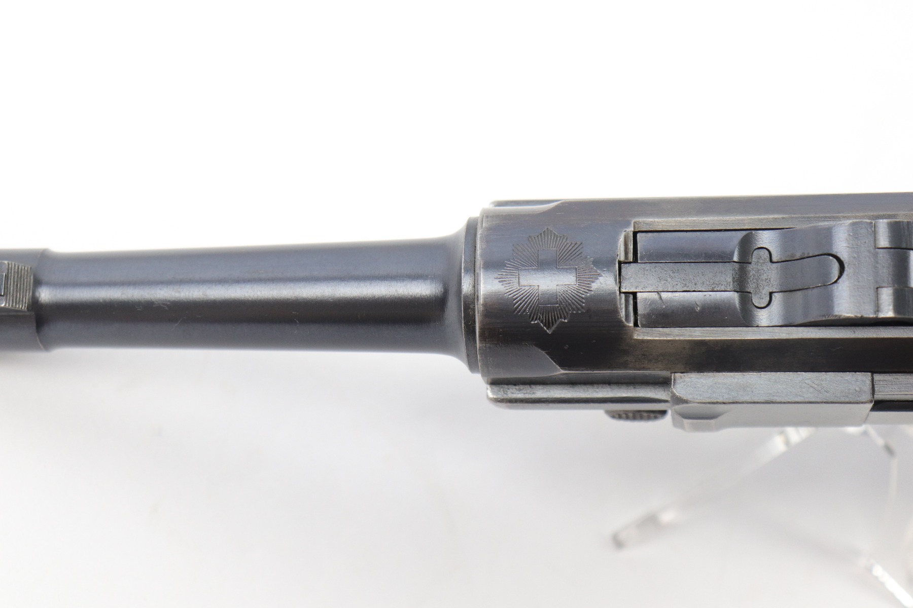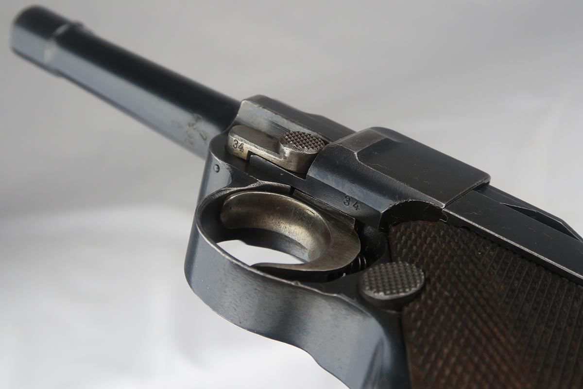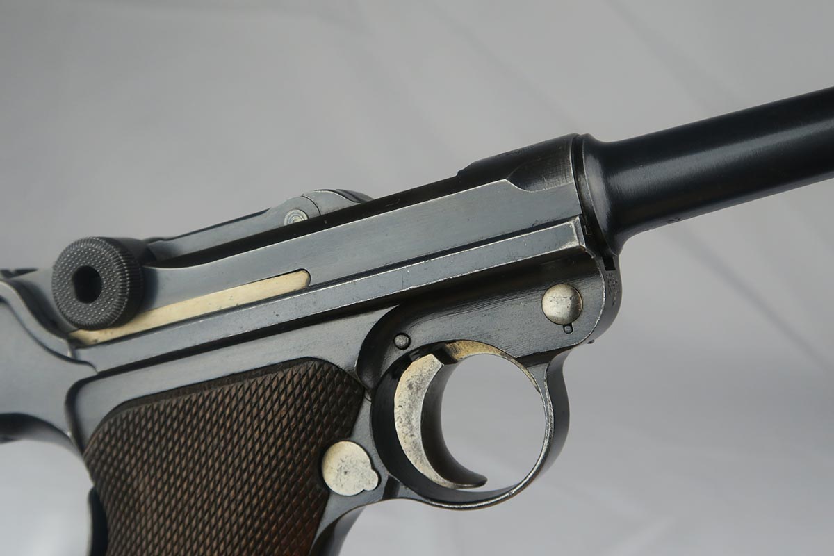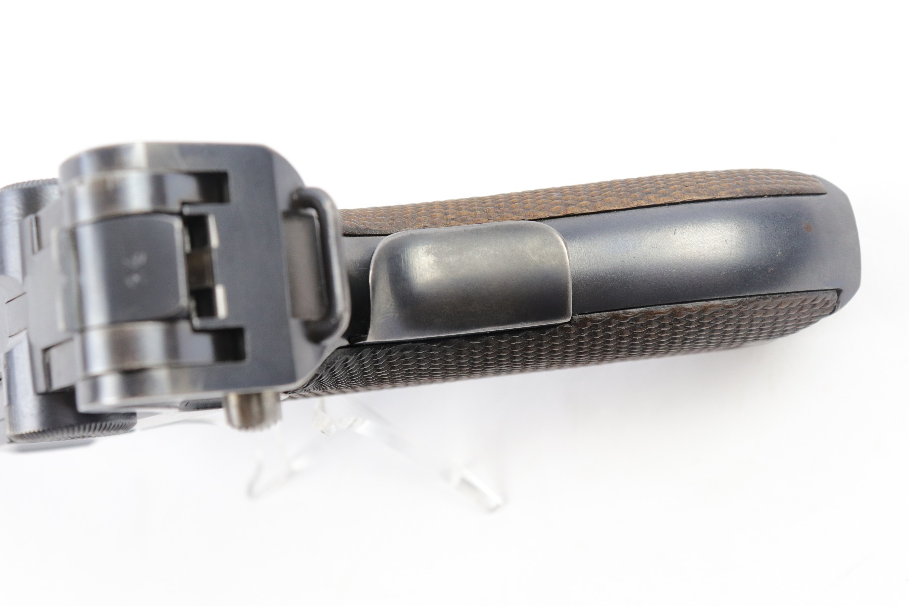 5/25/17 – This is a 1906 model Swiss luger, manufactured by DWM for commercial sales.  It is all original and correct with about 95% blue remaining.  Majority of finish loss is on the sideplate and bottom of the front strap.  Small parts show mostly faded straw.  Grip safety with no dish toggle is correct.  Period correct wood-bottom magazine is not numbered.  Strong bore and excellent grips.
