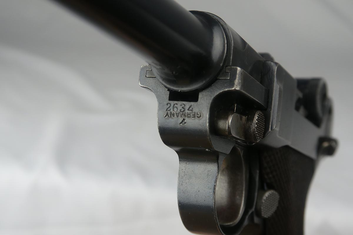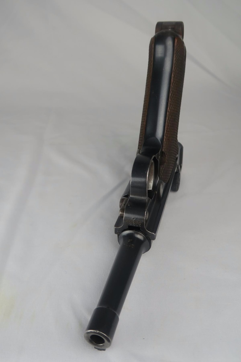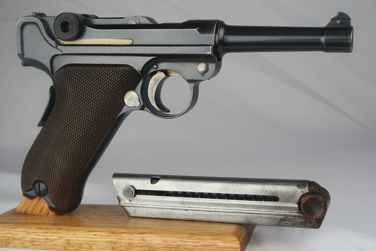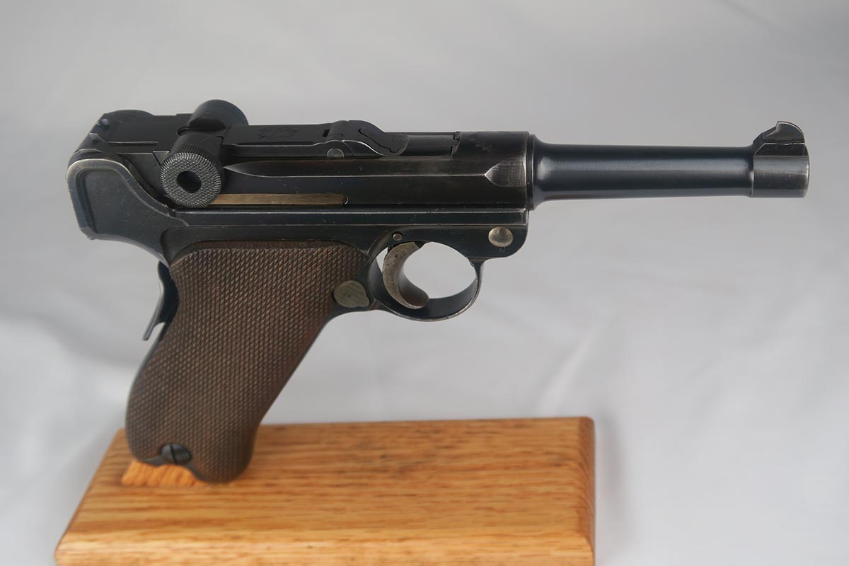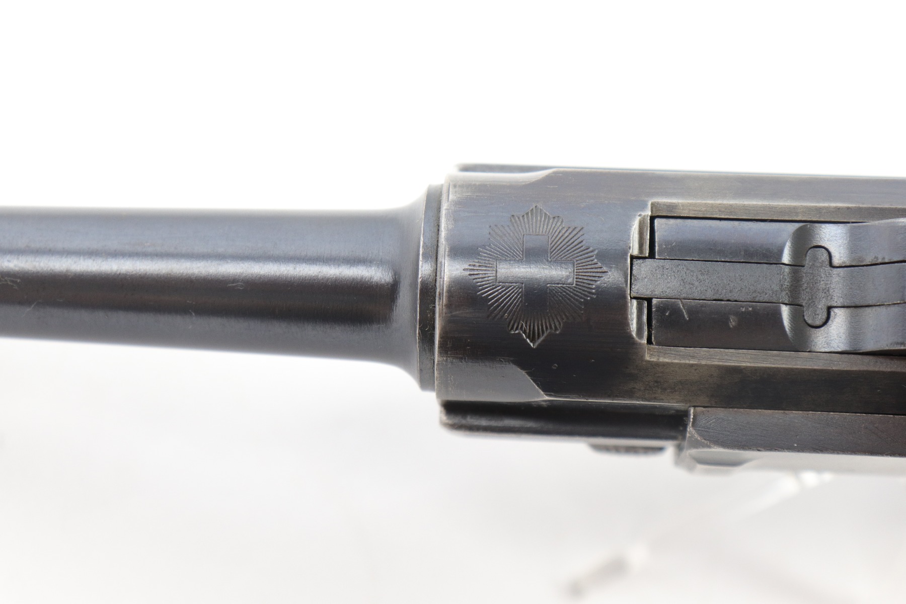 5/25/17 – This is a 1906 model Swiss luger, manufactured by DWM for commercial sales.  It is all original and correct with about 95% blue remaining.  Majority of finish loss is on the sideplate and bottom of the front strap.  Small parts show mostly faded straw.  Grip safety with no dish toggle is correct.  Period correct wood-bottom magazine is not numbered.  Strong bore and excellent grips.