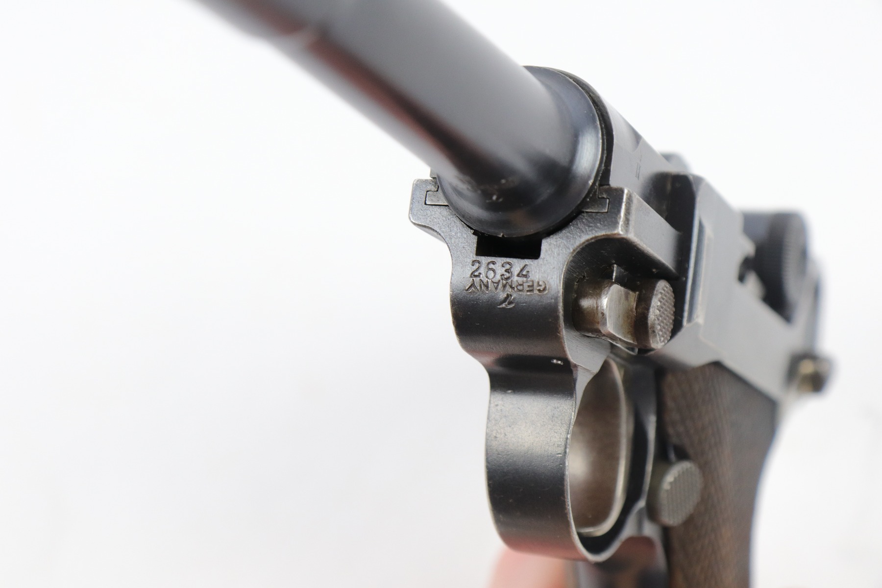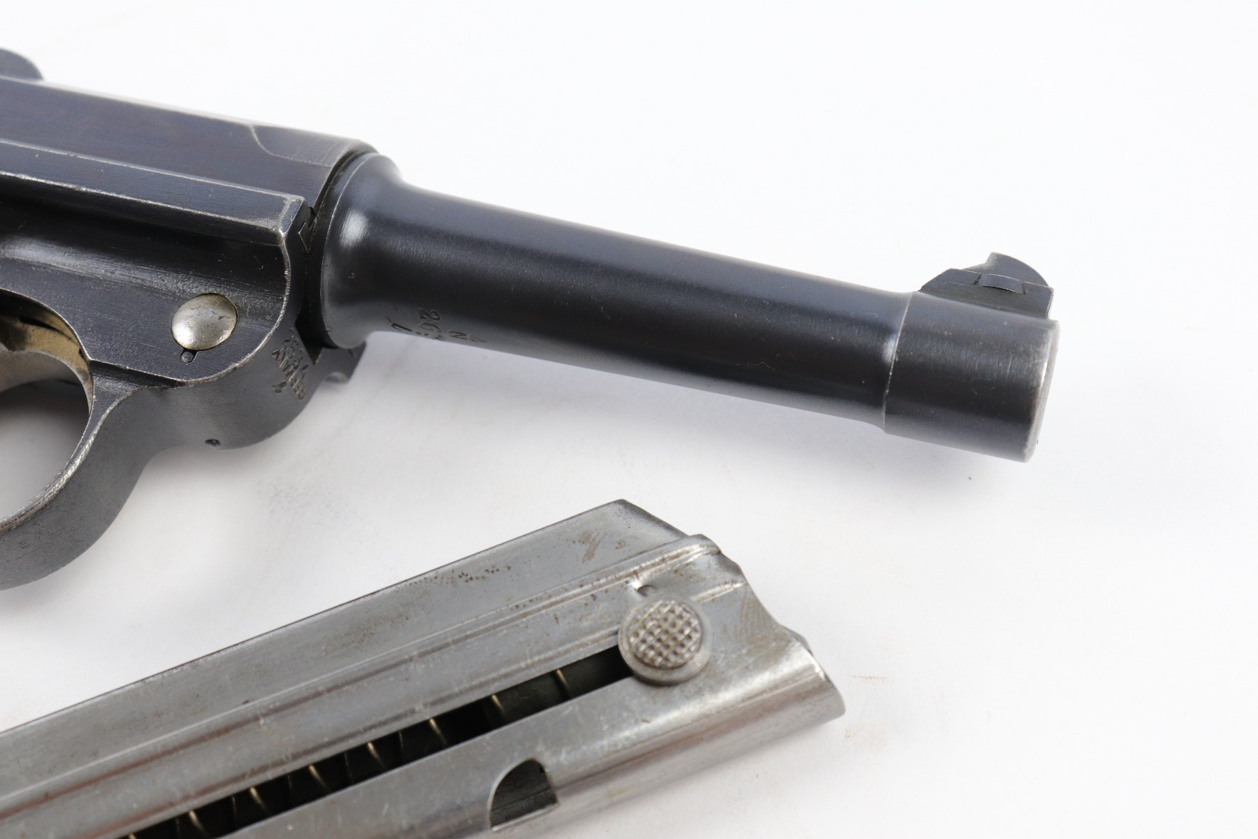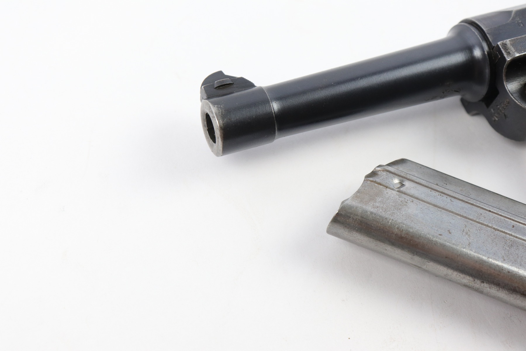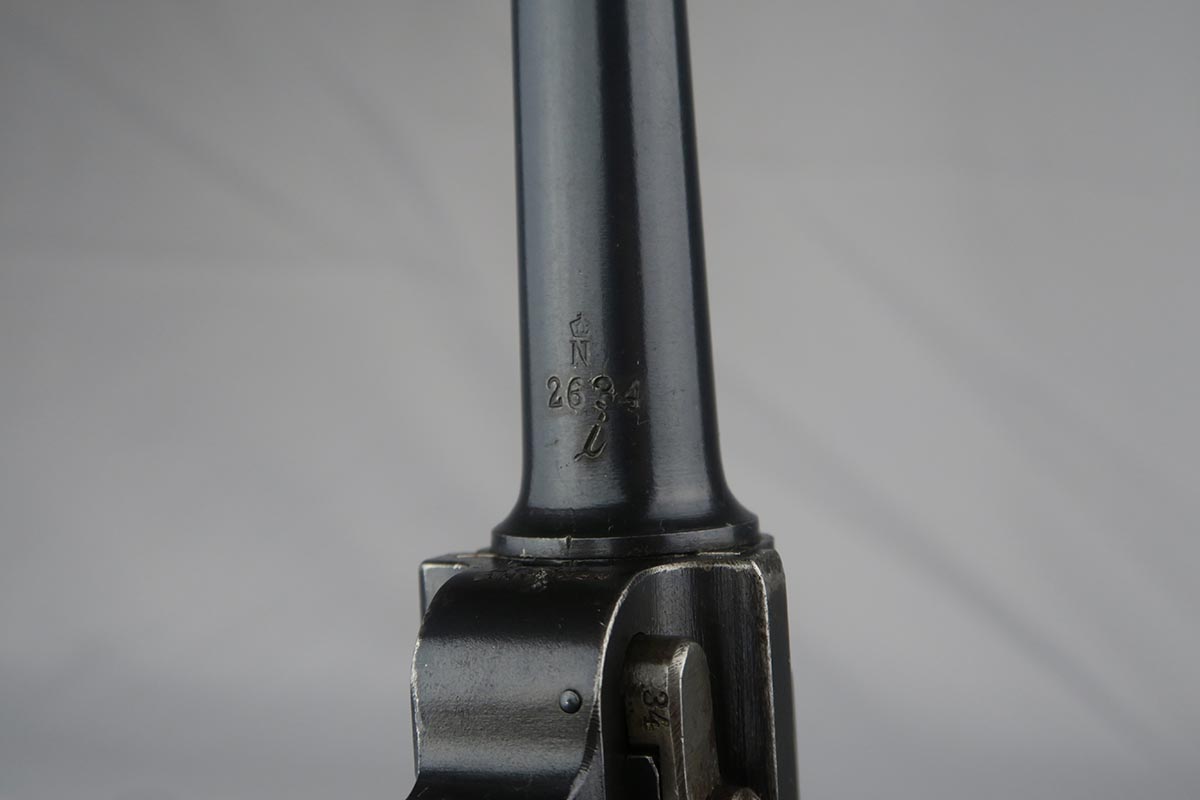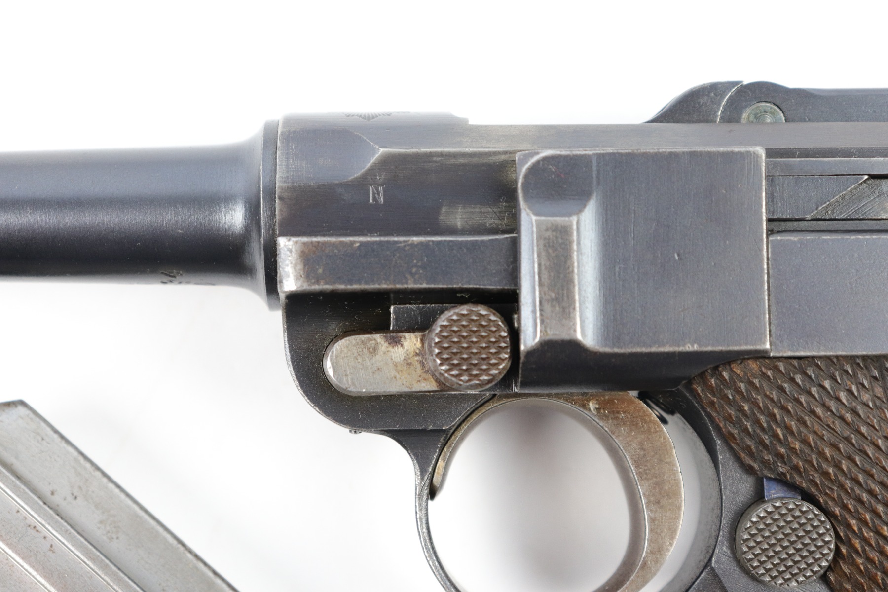 5/25/17 – This is a 1906 model Swiss luger, manufactured by DWM for commercial sales.  It is all original and correct with about 95% blue remaining.  Majority of finish loss is on the sideplate and bottom of the front strap.  Small parts show mostly faded straw.  Grip safety with no dish toggle is correct.  Period correct wood-bottom magazine is not numbered.  Strong bore and excellent grips.
