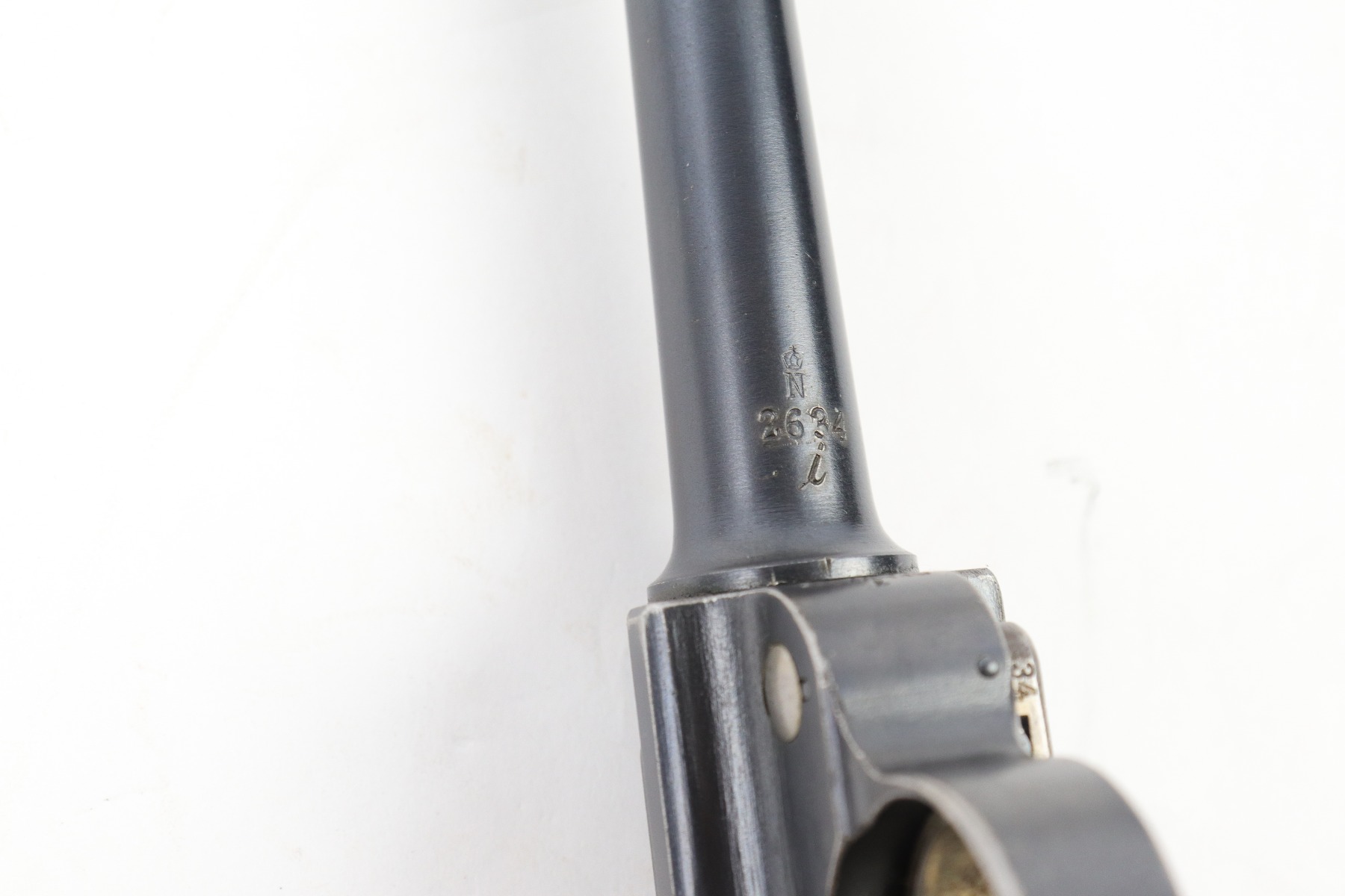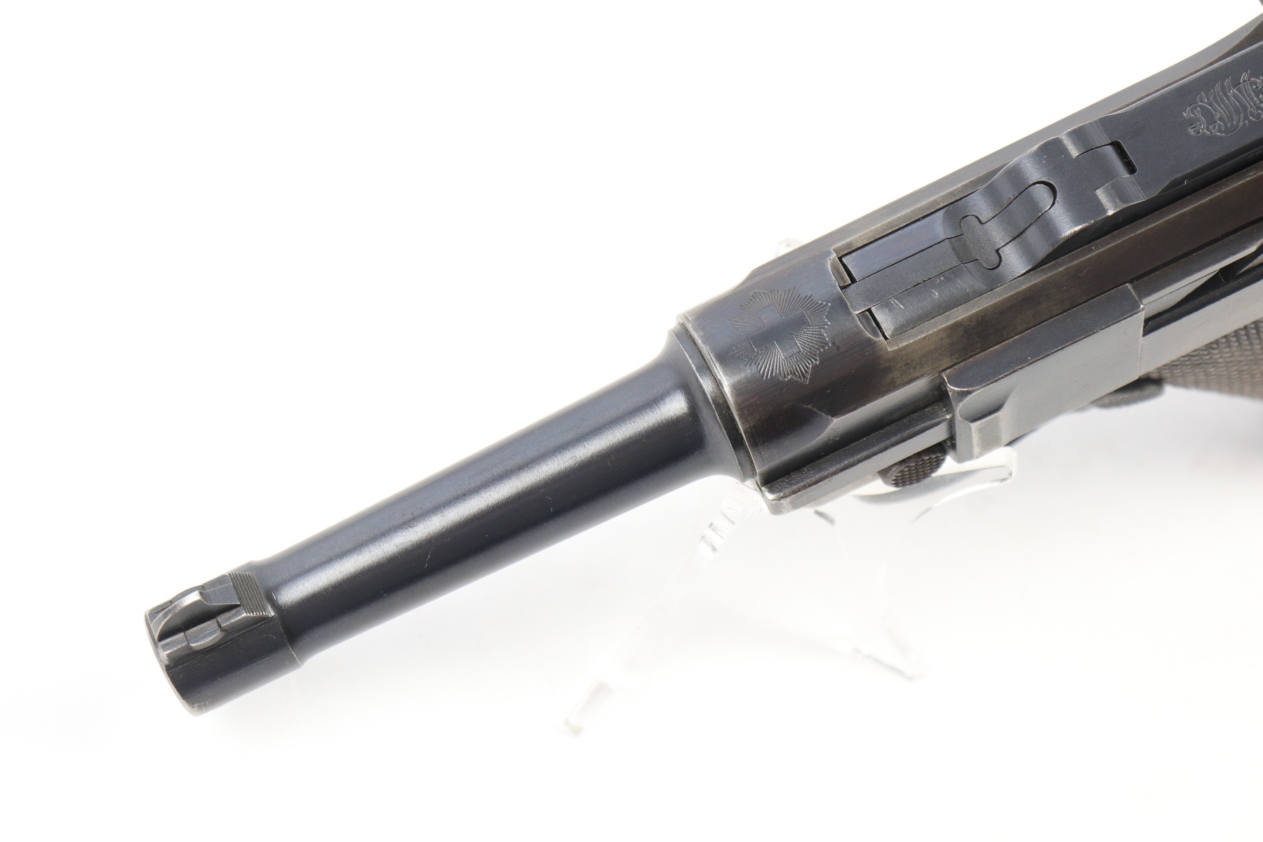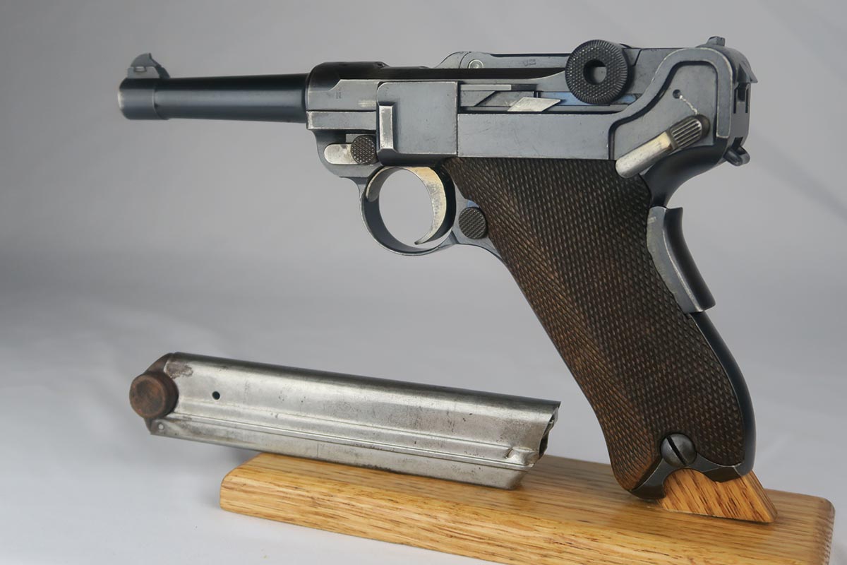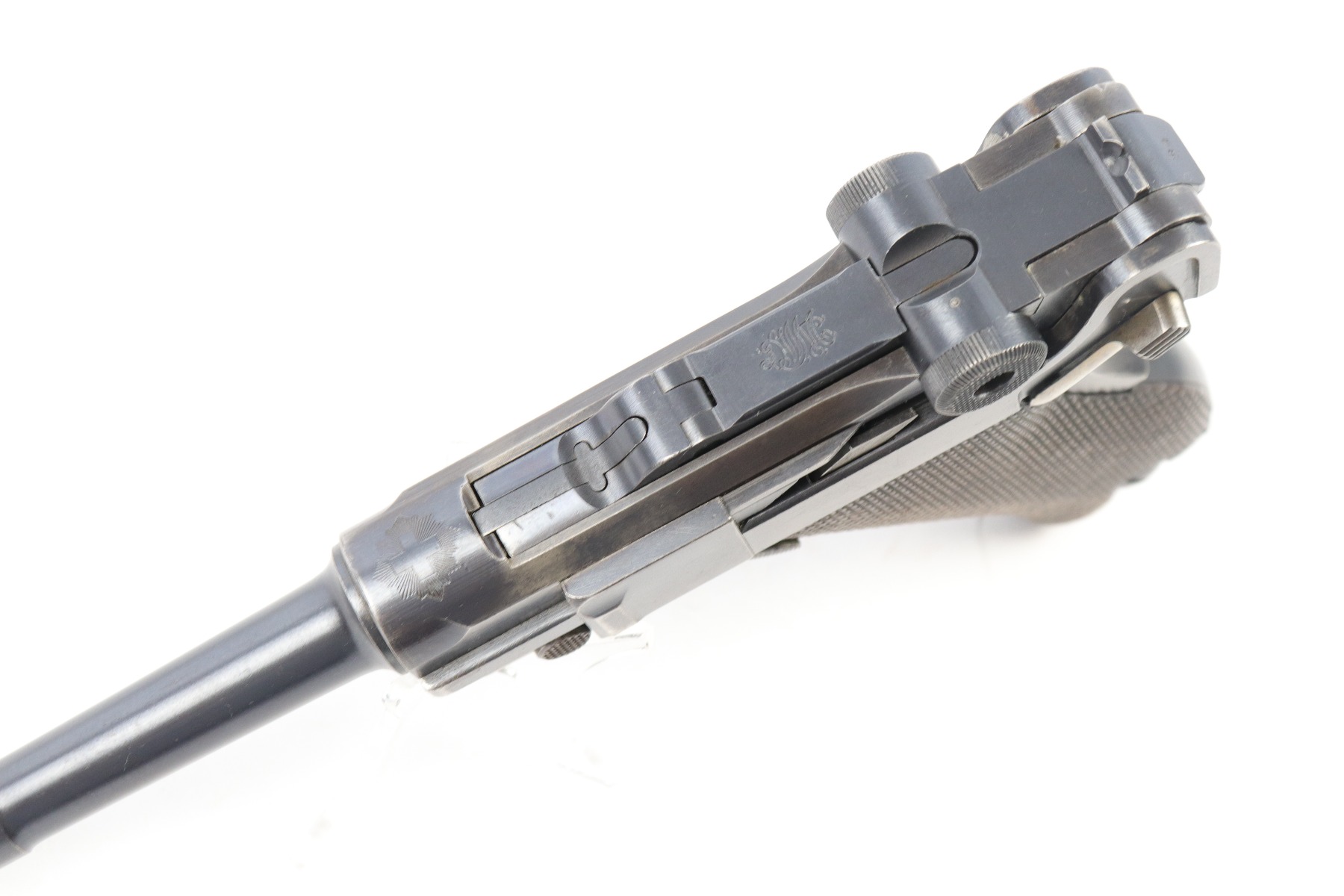 5/25/17 – This is a 1906 model Swiss luger, manufactured by DWM for commercial sales.  It is all original and correct with about 95% blue remaining.  Majority of finish loss is on the sideplate and bottom of the front strap.  Small parts show mostly faded straw.  Grip safety with no dish toggle is correct.  Period correct wood-bottom magazine is not numbered.  Strong bore and excellent grips.
