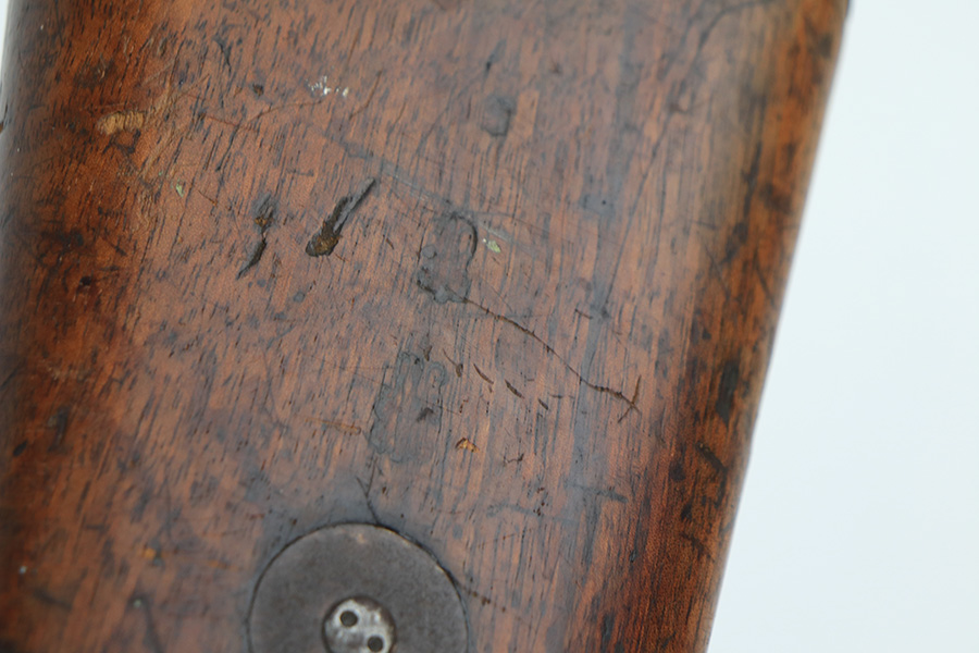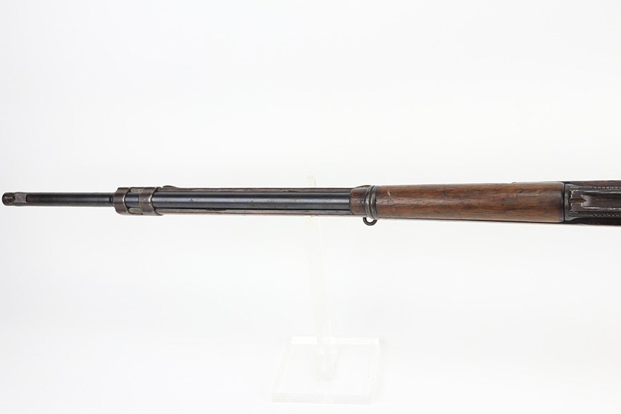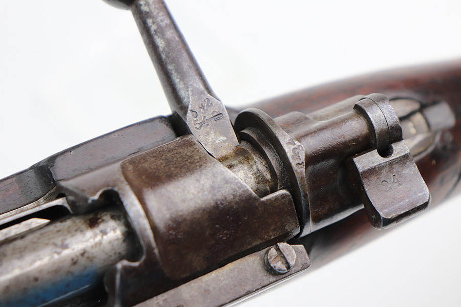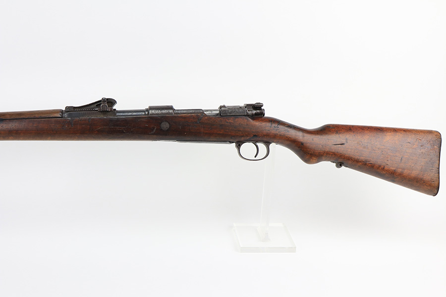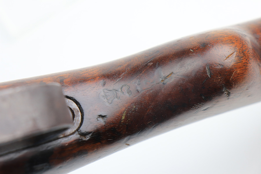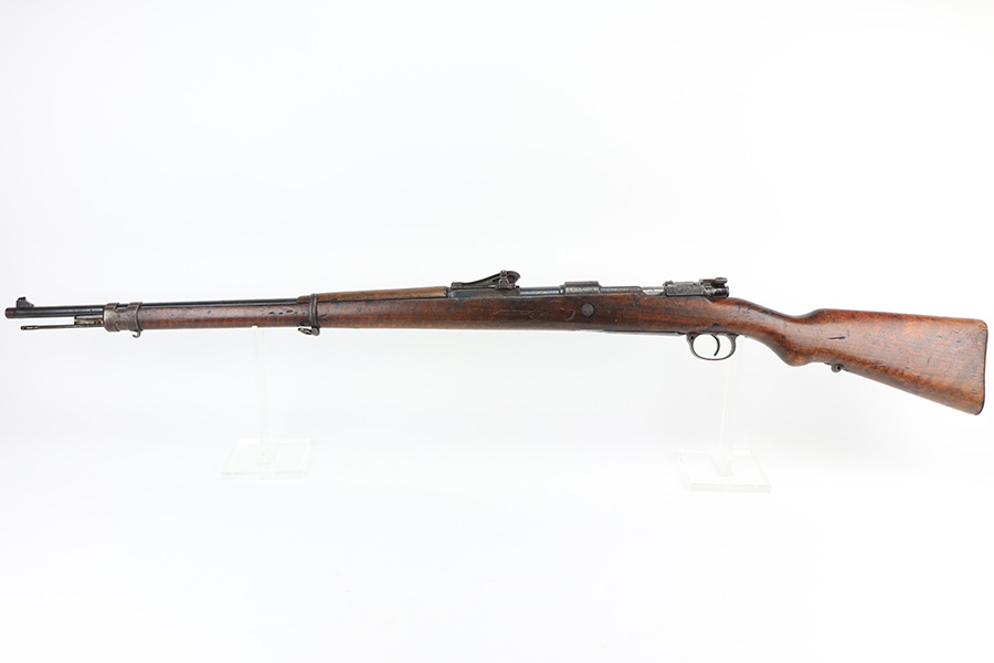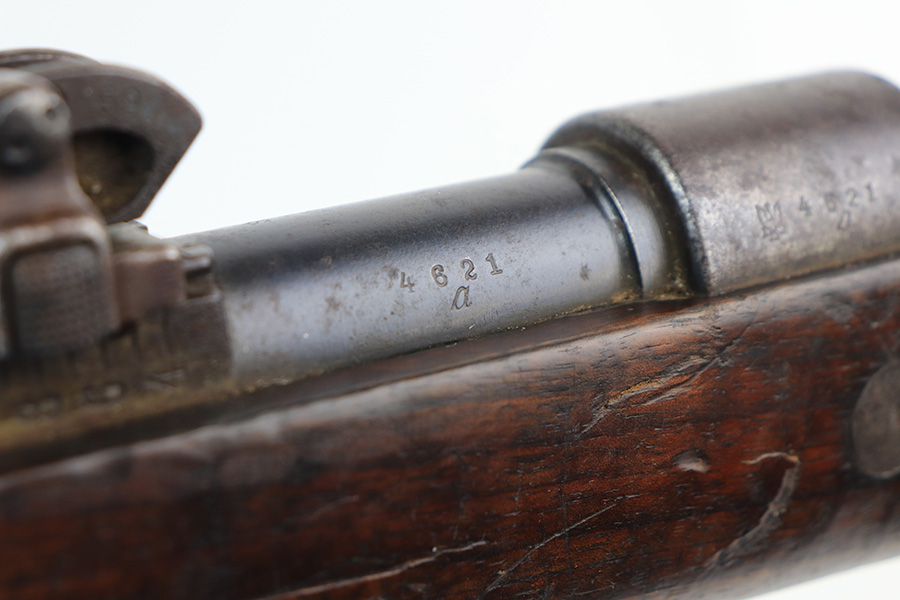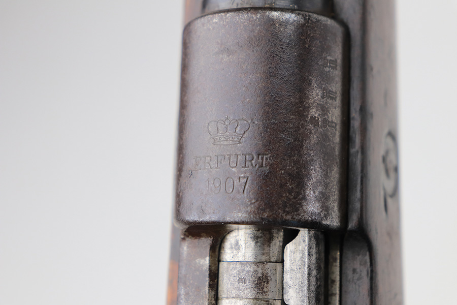 3/3/22 – This is a nice example of an Erfurt Gewehr 98 rifle issued to the Imperial German military in 1907. The gun is mostly matching (including the follower and stock), but the following parts are mismatched – the rear sight, bolt, and bolt release. No import marks. The numbering on the stock is very faint, but it is matching. It has the proper Imperial military proofs throughout. Overall, the gun is in fair condition. There isn’t a ton of actual finish loss, but there is heavy brown patina and areas of minor pitting on the receiver, floor plate, trigger group, and butt plate. Spotty brown patina on both barrel bands. Spotty oxidation along the barrel. The stock has noticeable dents, scratches, and bruising throughout. There are a few more noticeable gouges here and there. The bore has good rifling with pin-pricking throughout.