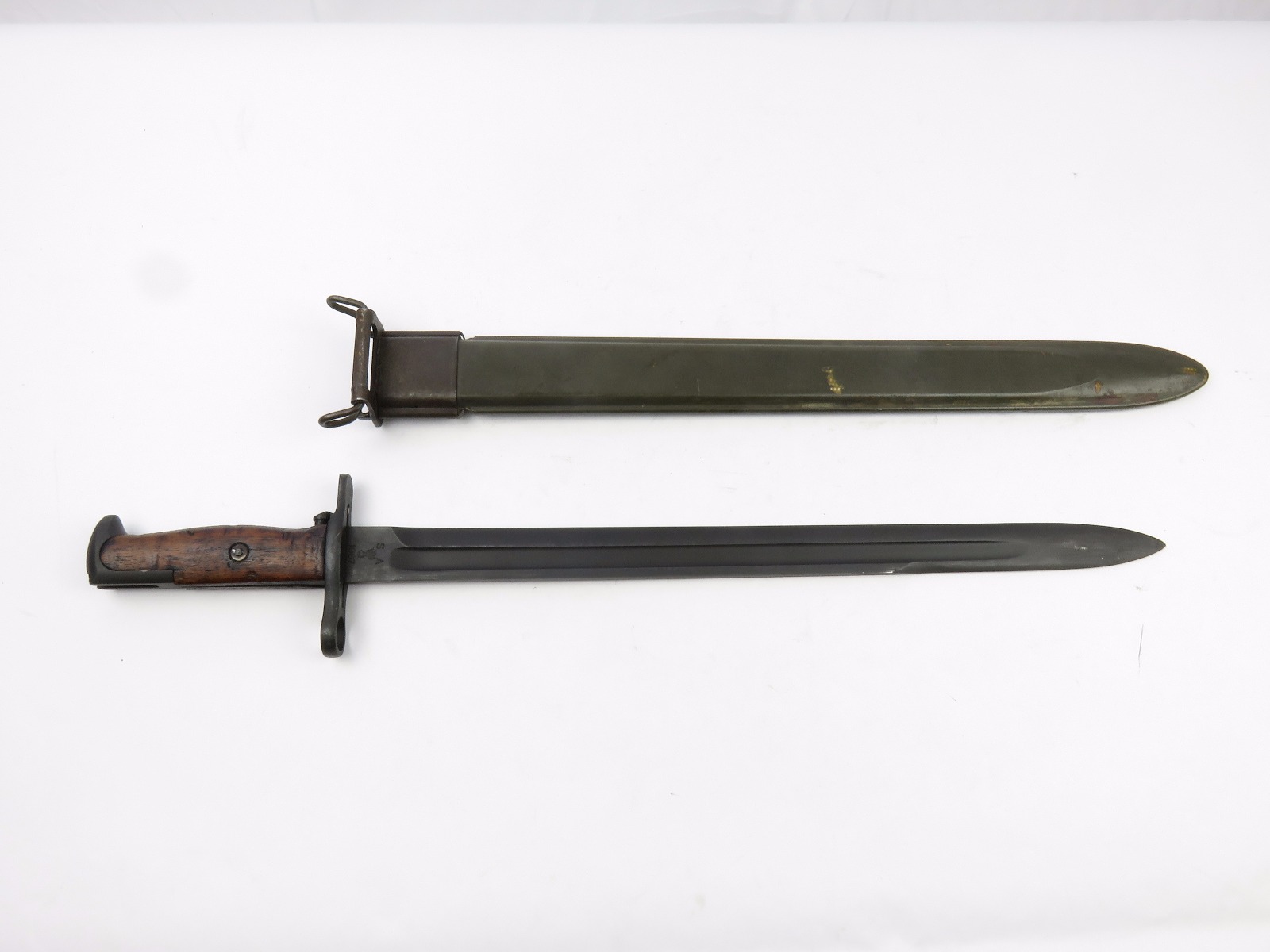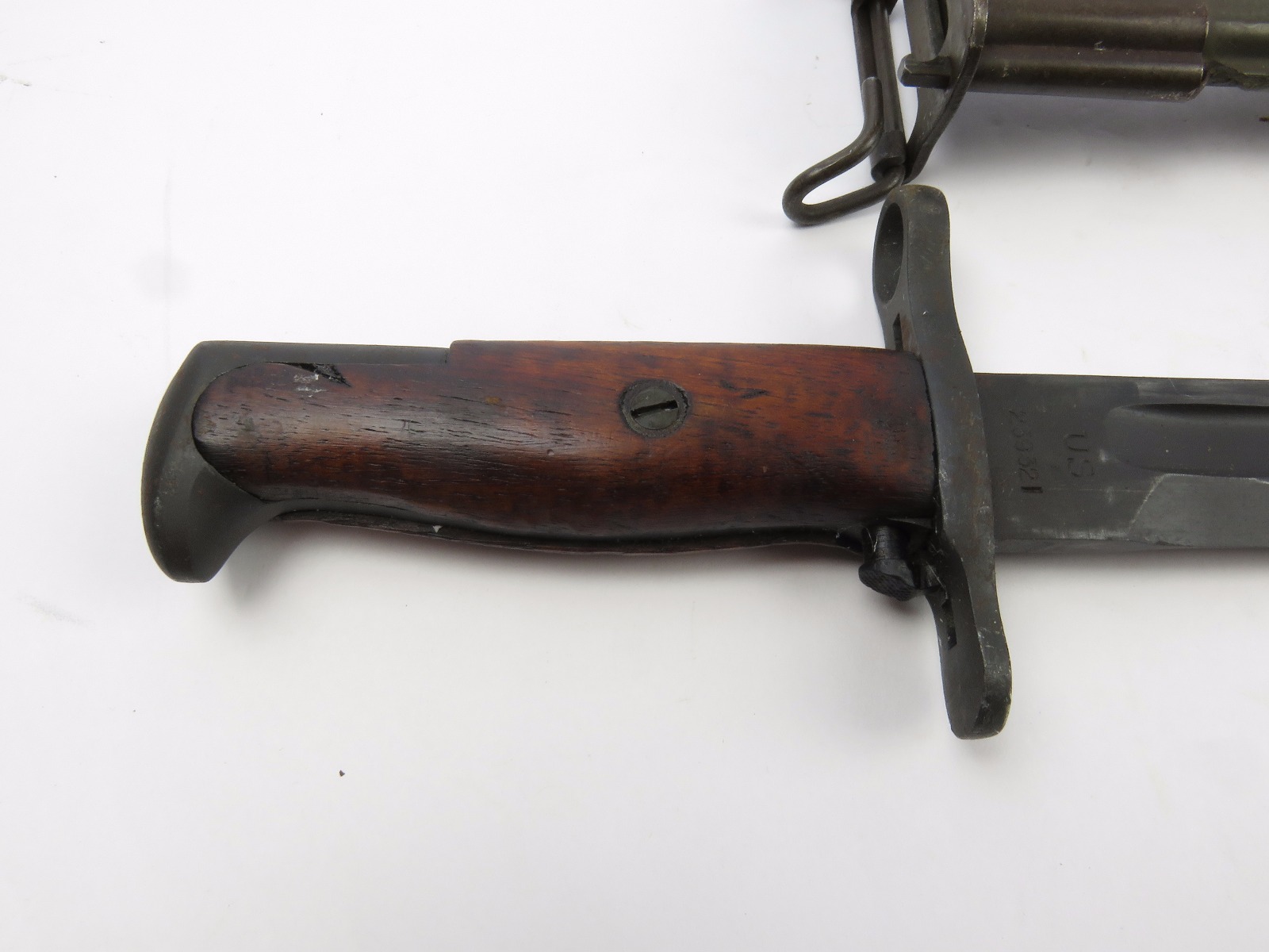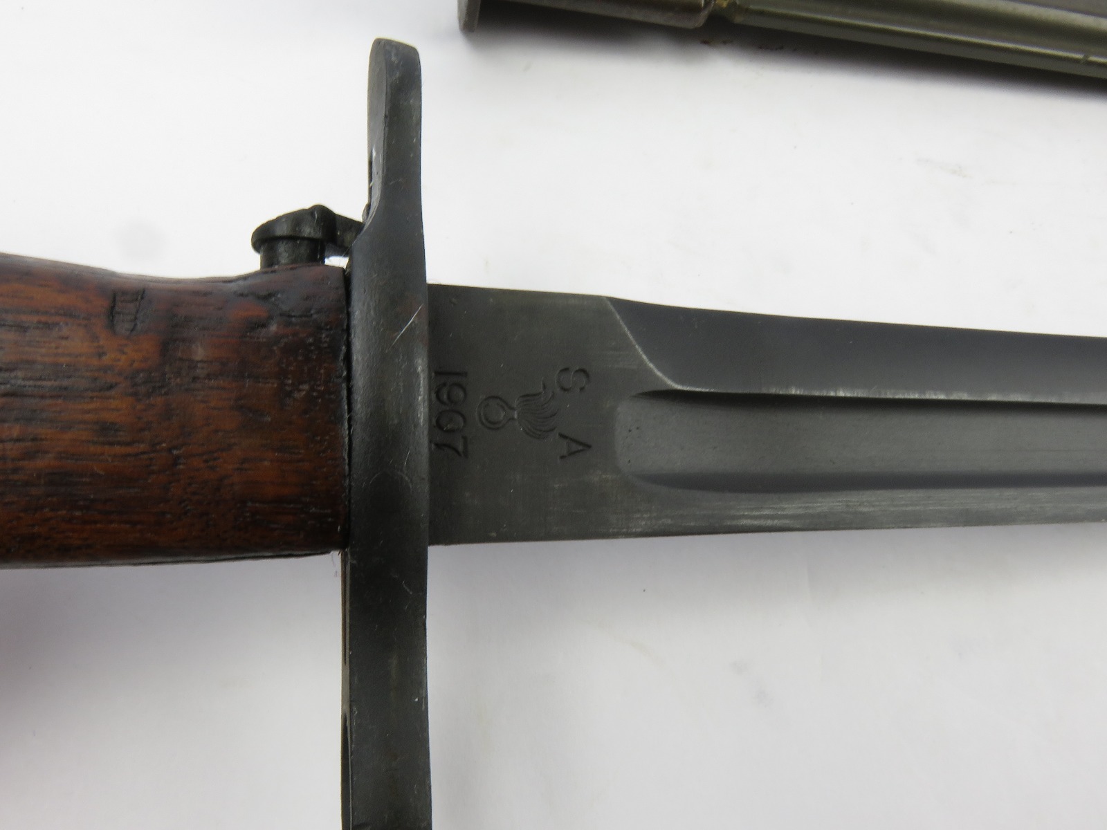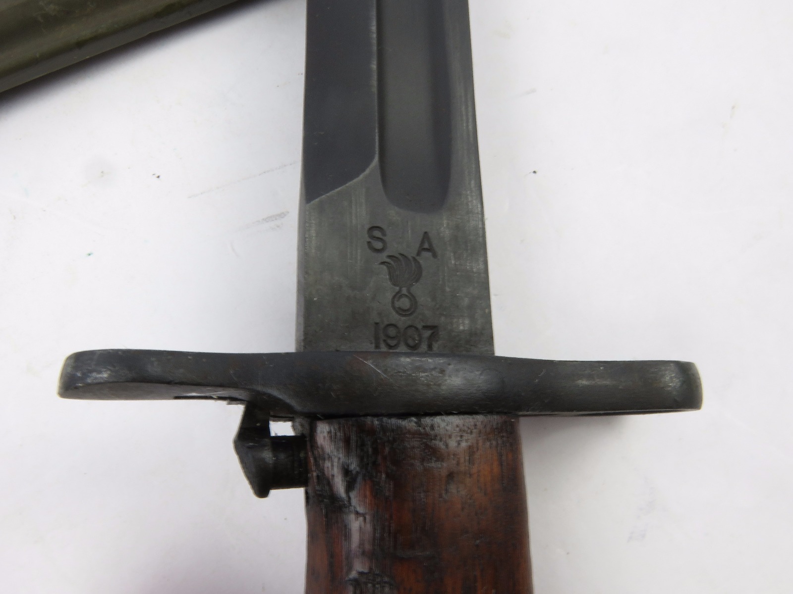 8/16/17 – This is a WW1 production model 1907 Springfield bayonet. The bayonet blade is blued, original, and excellent with “SA” and a flaming bomb on one side. The reverse side is marked “US” with a serial number. This bayonet was original for the Springfield bolt action rifle in WW1, but was later repurposed for the M1 Garand and saw use during WW2. We know this by the WW2 style scabbard that comes with the bayonet. The scabbard is marked with a US flaming bomb and has a few dings and flaws, but overall is in tact. The wood handle is excellent on the bayonet. Guaratneed original.