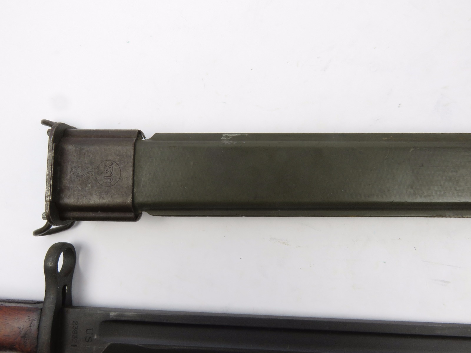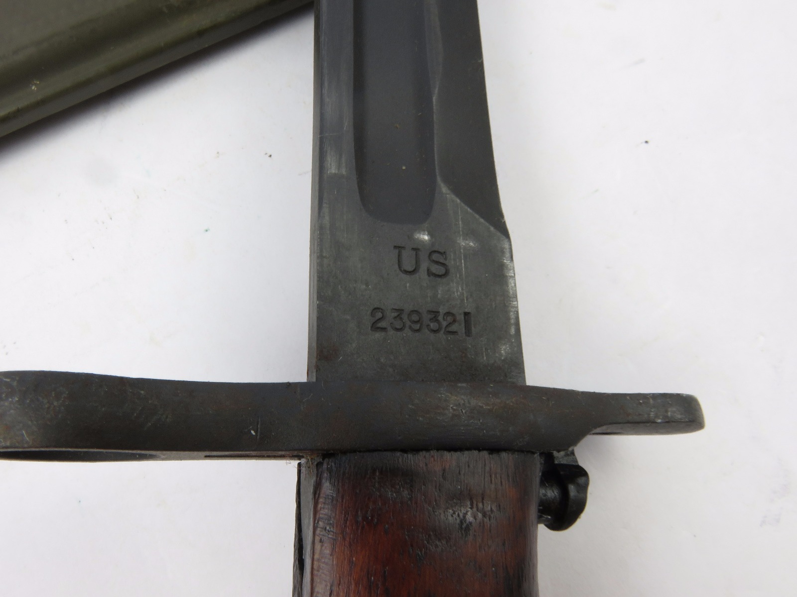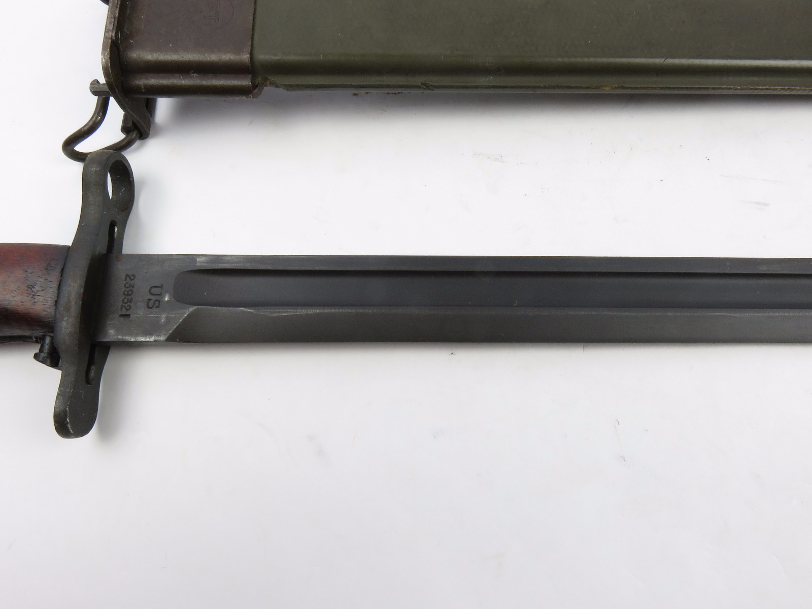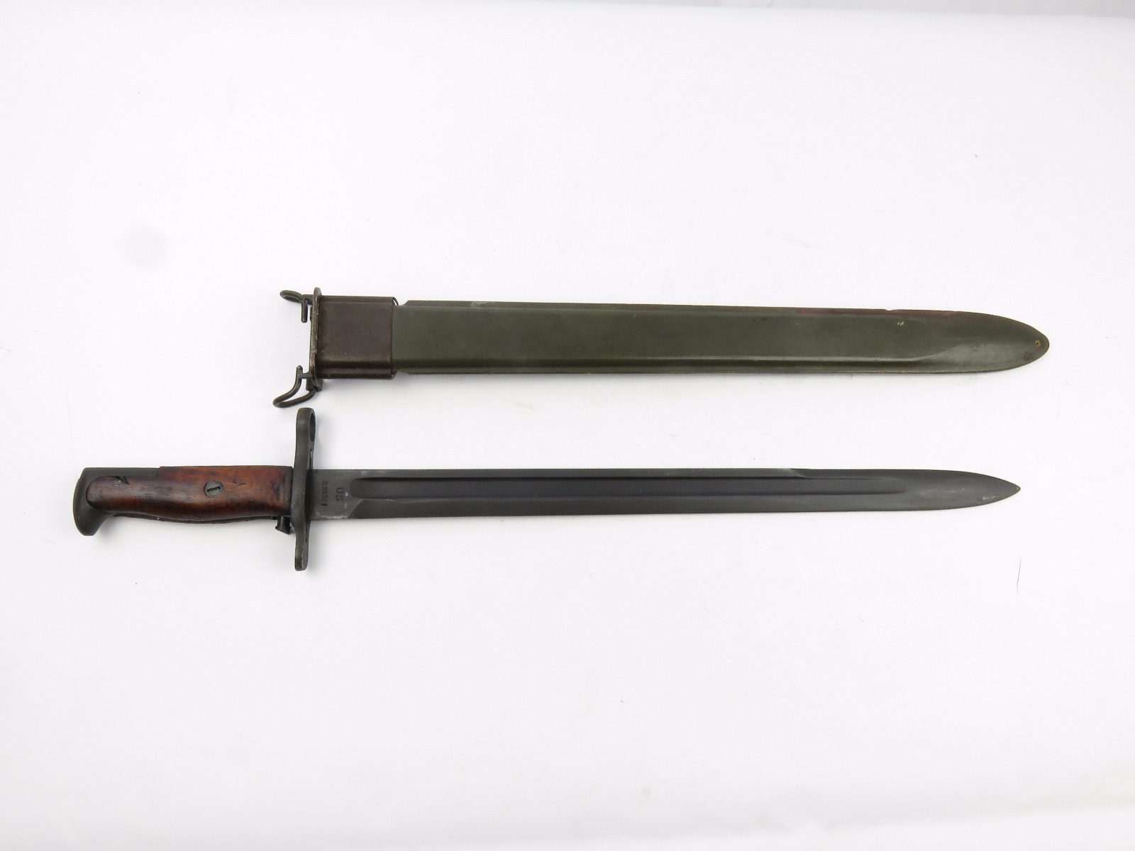 8/16/17 – This is a WW1 production model 1907 Springfield bayonet. The bayonet blade is blued, original, and excellent with “SA” and a flaming bomb on one side. The reverse side is marked “US” with a serial number. This bayonet was original for the Springfield bolt action rifle in WW1, but was later repurposed for the M1 Garand and saw use during WW2. We know this by the WW2 style scabbard that comes with the bayonet. The scabbard is marked with a US flaming bomb and has a few dings and flaws, but overall is in tact. The wood handle is excellent on the bayonet. Guaratneed original.