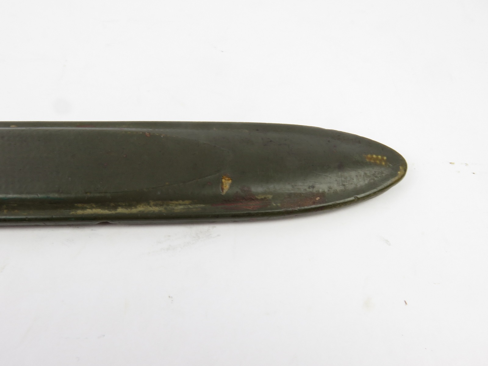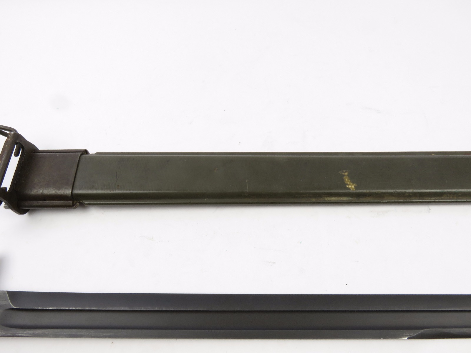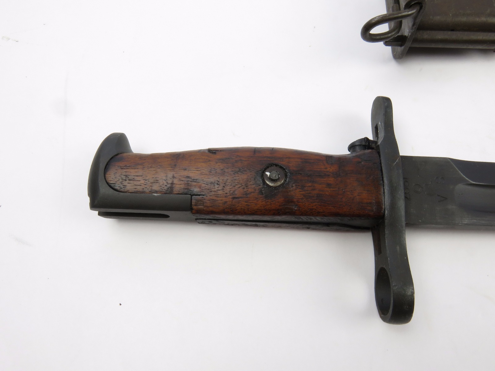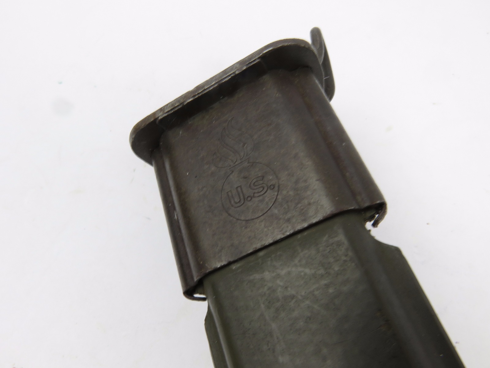 8/16/17 – This is a WW1 production model 1907 Springfield bayonet. The bayonet blade is blued, original, and excellent with “SA” and a flaming bomb on one side. The reverse side is marked “US” with a serial number. This bayonet was original for the Springfield bolt action rifle in WW1, but was later repurposed for the M1 Garand and saw use during WW2. We know this by the WW2 style scabbard that comes with the bayonet. The scabbard is marked with a US flaming bomb and has a few dings and flaws, but overall is in tact. The wood handle is excellent on the bayonet. Guaratneed original.