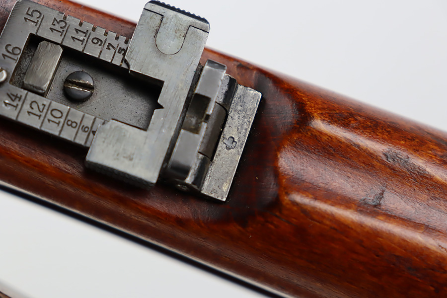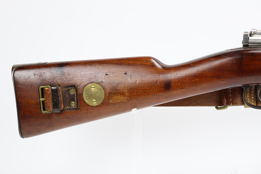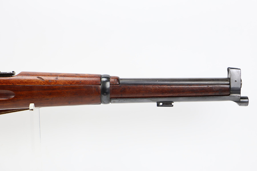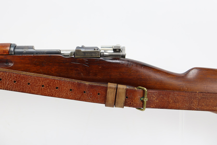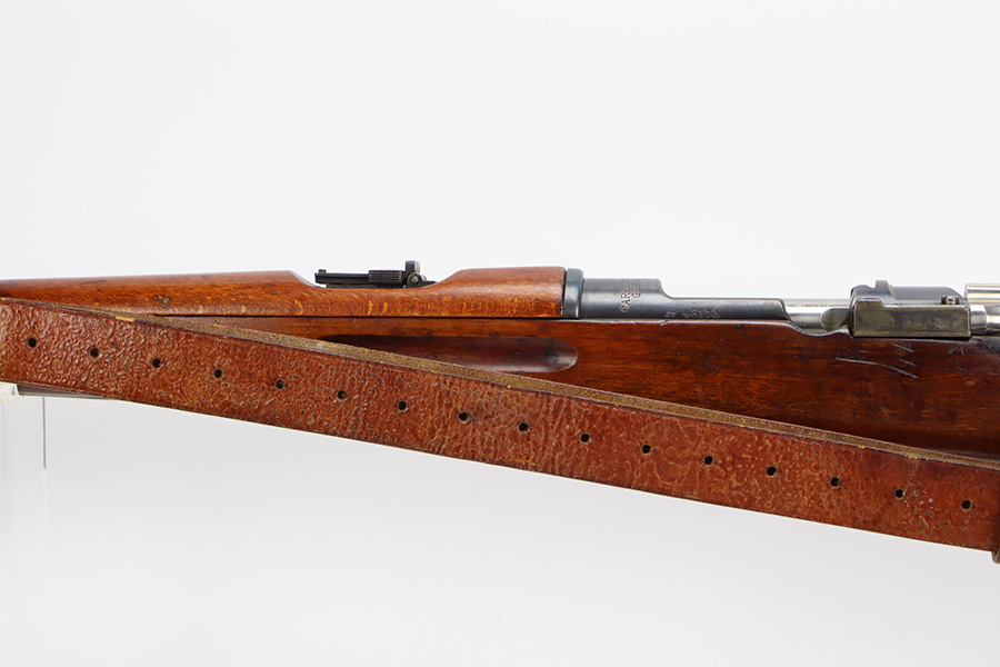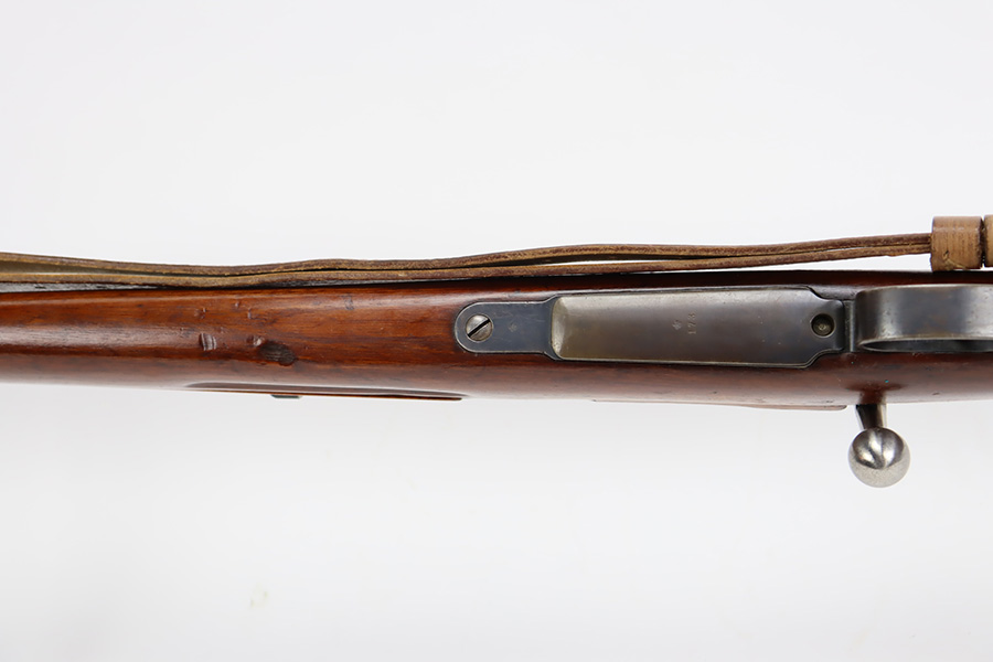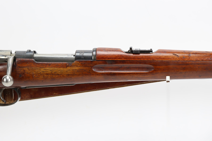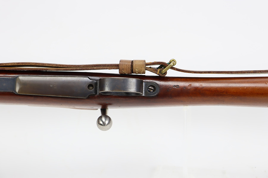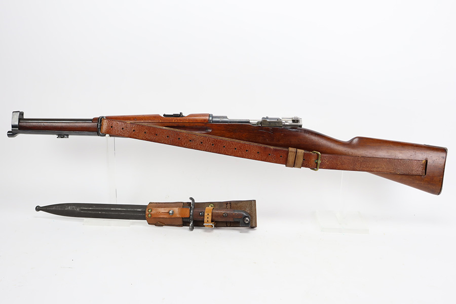 10/3/23 – This is an excellent example of a Swedish Carl Gustafs Model 1894/14 Carbine, manufactured in 1907. The rear sight and butt plate are mismatched. The gun comes with a period-correct bayonet, scabbard, leather frog, and leather sling. The bluing on the metal rates about 93-94% with general high edge wear and some thinning on the floor plate. Spotty oxidation on the butt plate. Excellent wood stock with a small wood repair against the right side of the receiver. The bore has good rifling, but there is very light pin-pricking throughout.