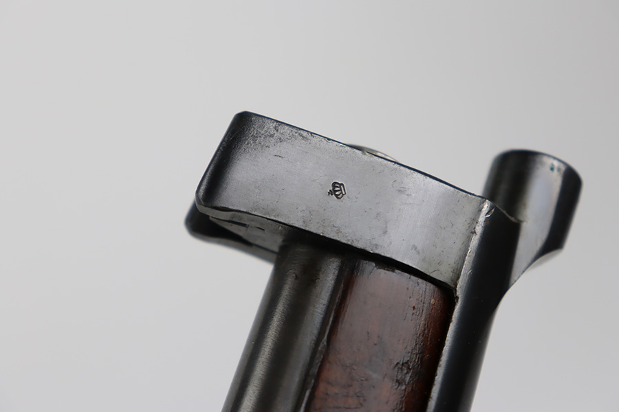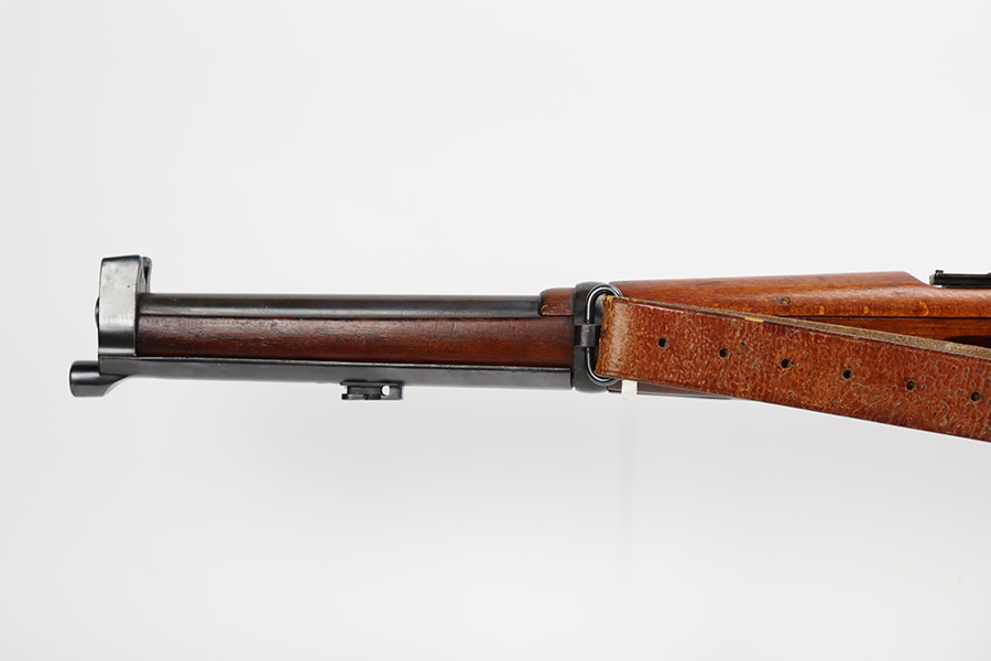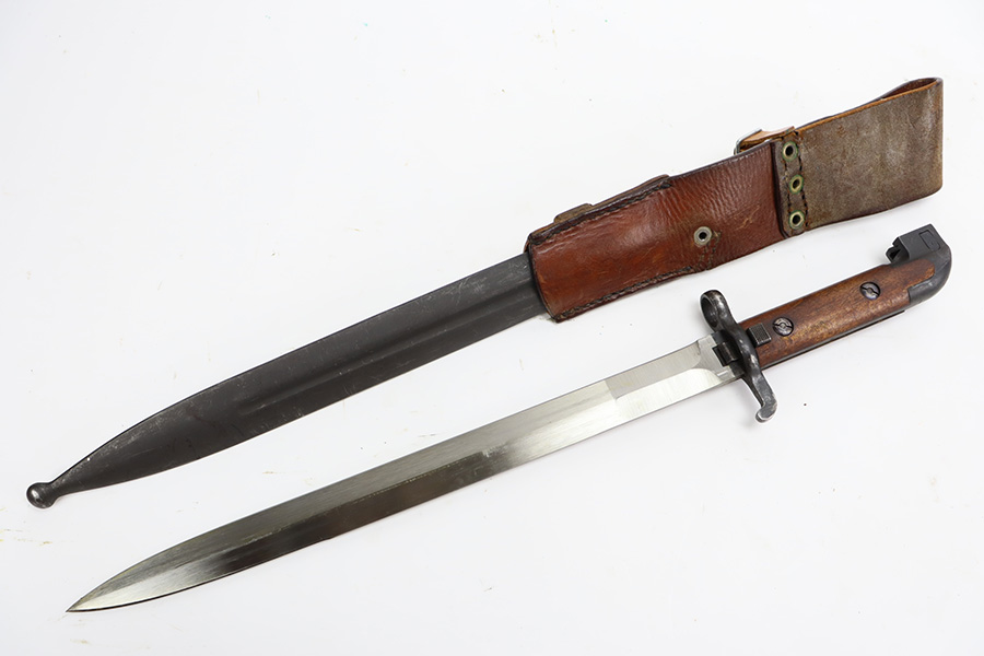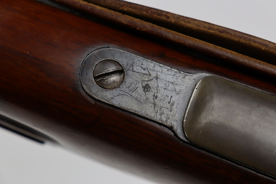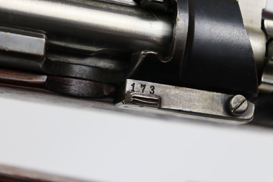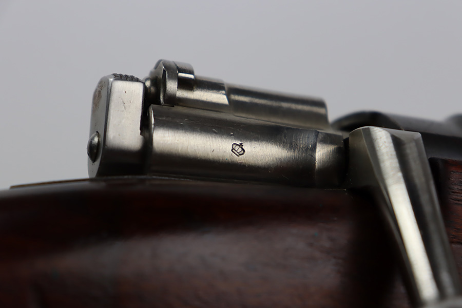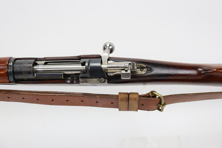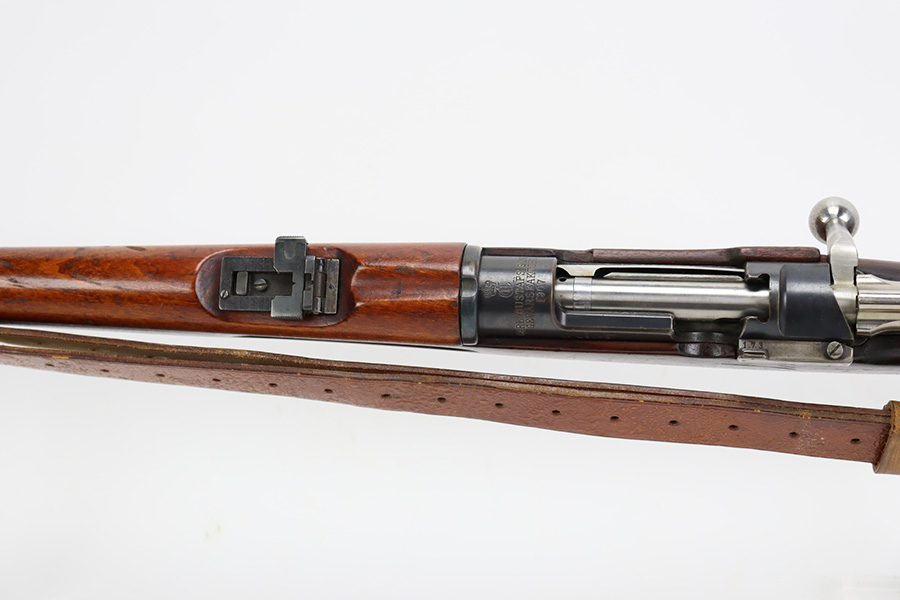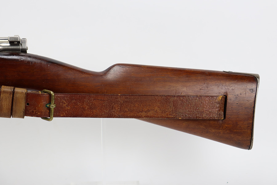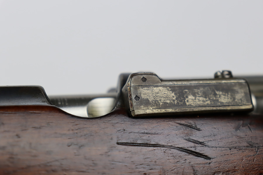 10/3/23 – This is an excellent example of a Swedish Carl Gustafs Model 1894/14 Carbine, manufactured in 1907. The rear sight and butt plate are mismatched. The gun comes with a period-correct bayonet, scabbard, leather frog, and leather sling. The bluing on the metal rates about 93-94% with general high edge wear and some thinning on the floor plate. Spotty oxidation on the butt plate. Excellent wood stock with a small wood repair against the right side of the receiver. The bore has good rifling, but there is very light pin-pricking throughout.