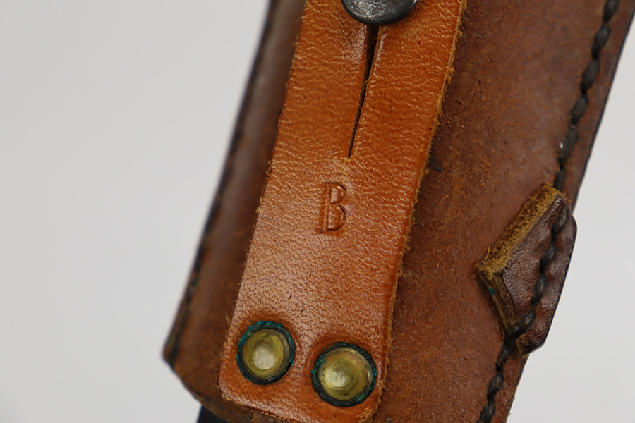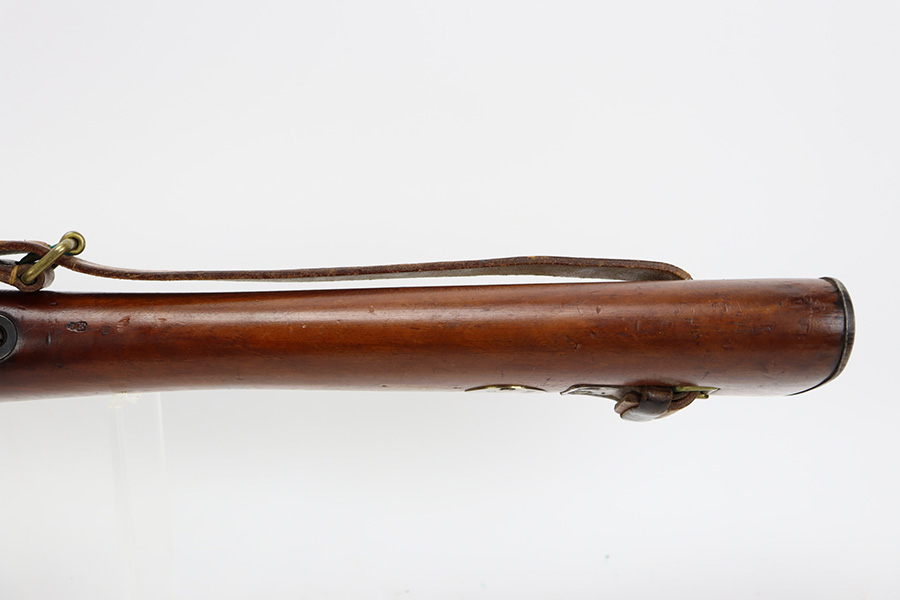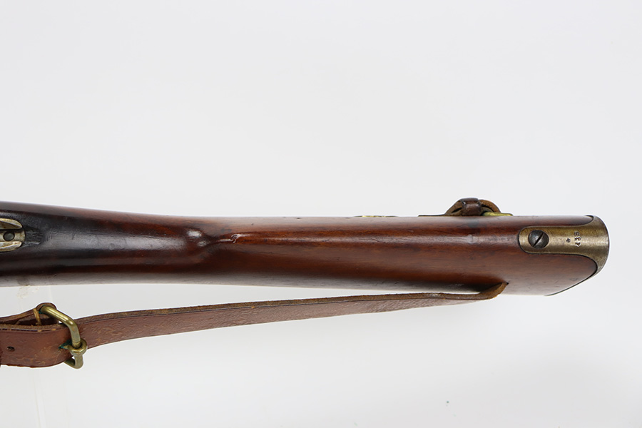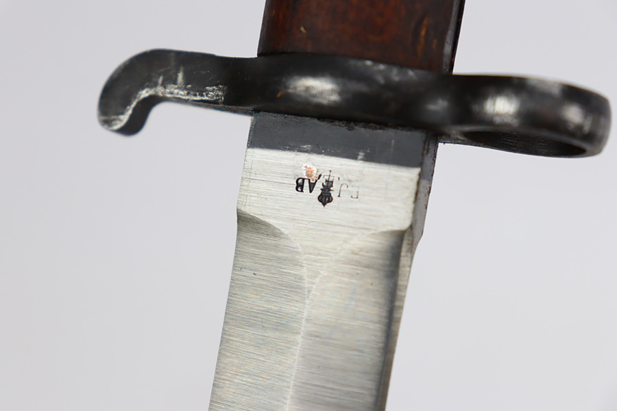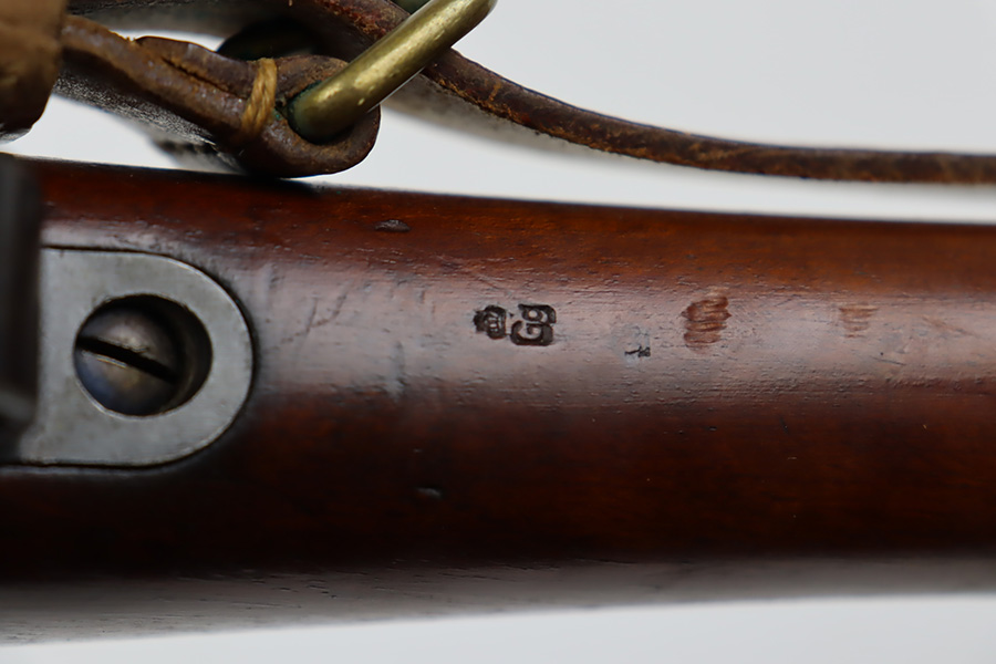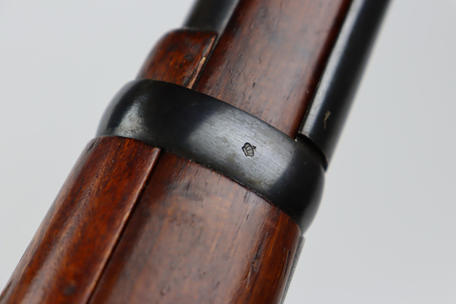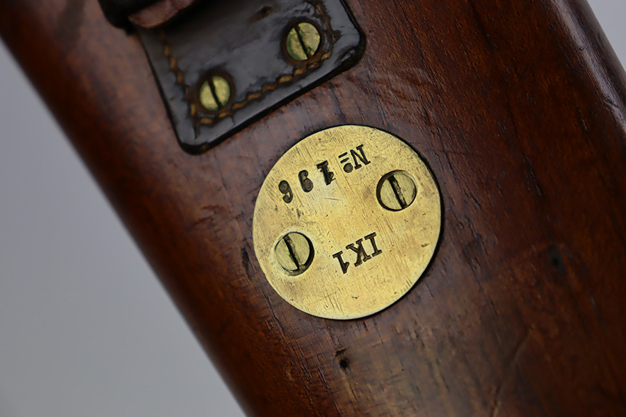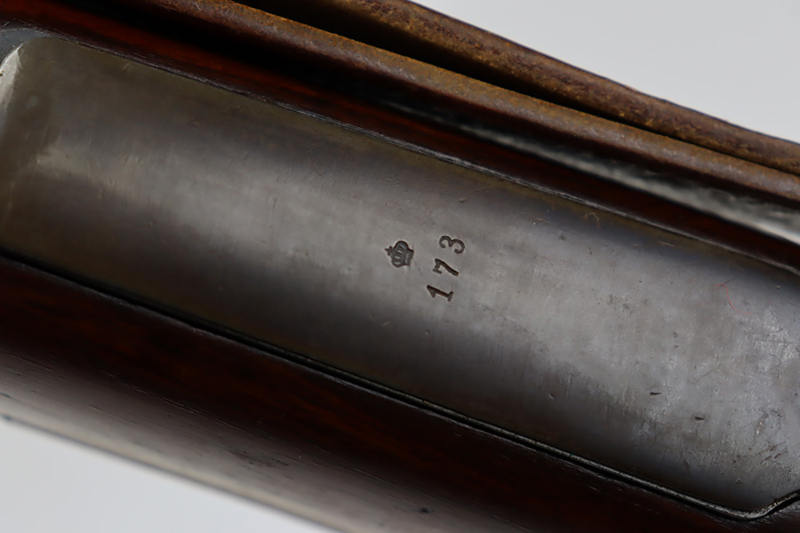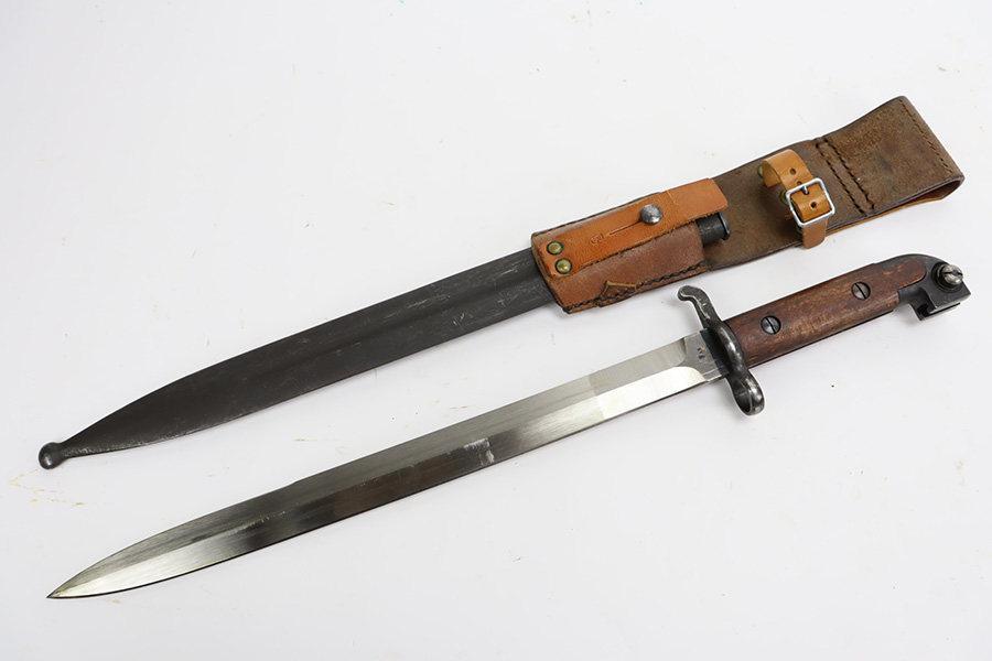10/3/23 – This is an excellent example of a Swedish Carl Gustafs Model 1894/14 Carbine, manufactured in 1907. The rear sight and butt plate are mismatched. The gun comes with a period-correct bayonet, scabbard, leather frog, and leather sling. The bluing on the metal rates about 93-94% with general high edge wear and some thinning on the floor plate. Spotty oxidation on the butt plate. Excellent wood stock with a small wood repair against the right side of the receiver. The bore has good rifling, but there is very light pin-pricking throughout.