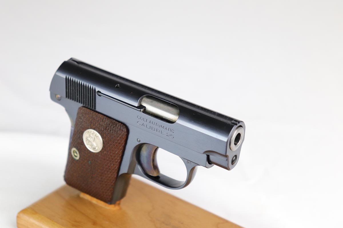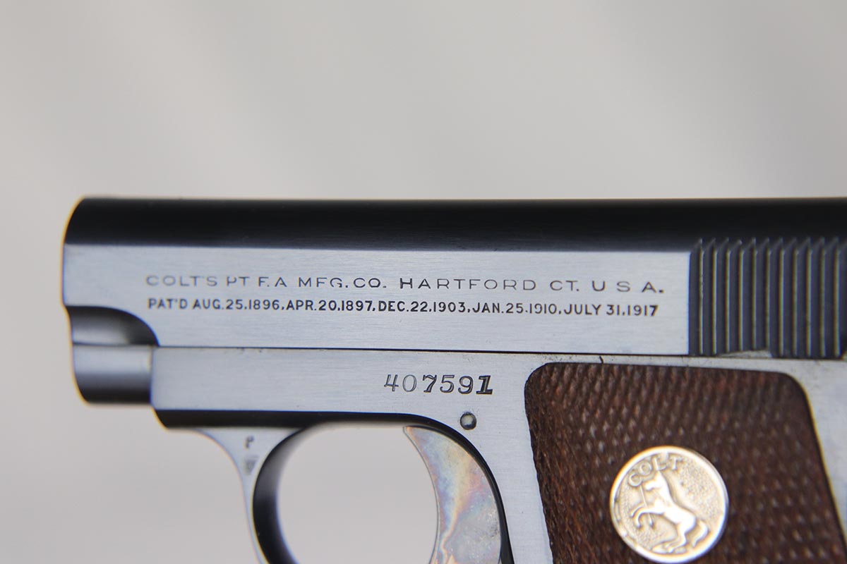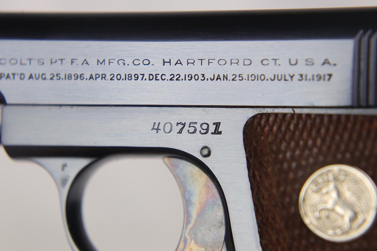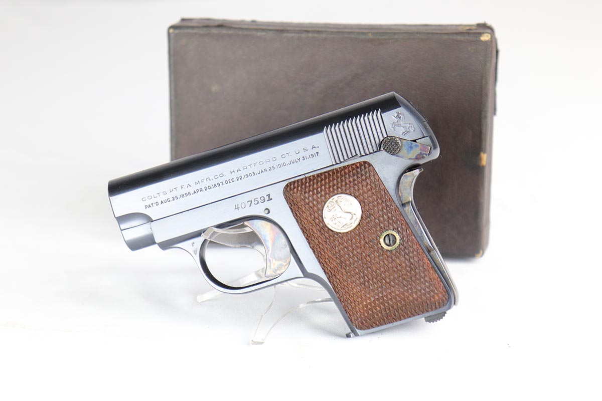 3/13/18 – This is a like new-in-box Colt model 1908 Pocket Pistol. The pistol is in superb condition with the original colt bluing and fire blued grip safety and trigger in minty condition. The grips are similarly mint with sharp edges and no issues. The original Colt box is not numbered to the gun, but has all original labels and is correct for this pistol – most likely is the original box the gun came in. The bore is similarly mint with no notable flaws. Guaranteed original.