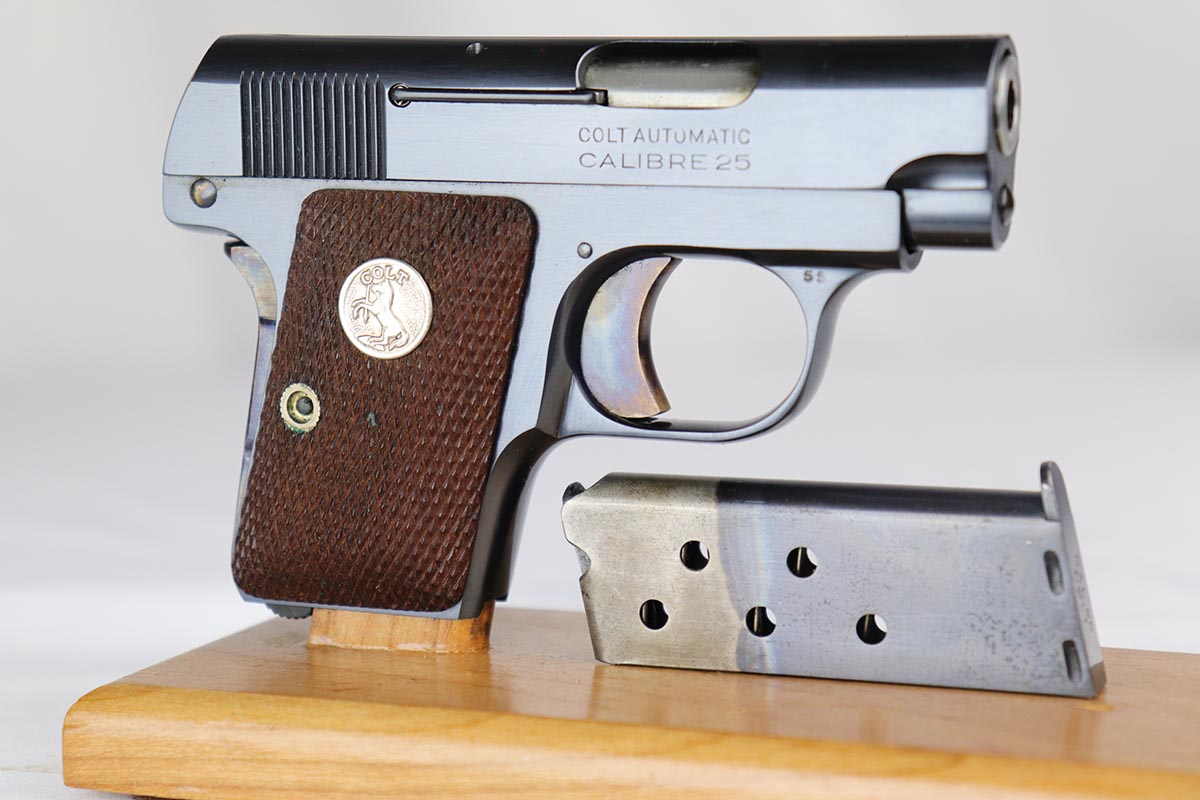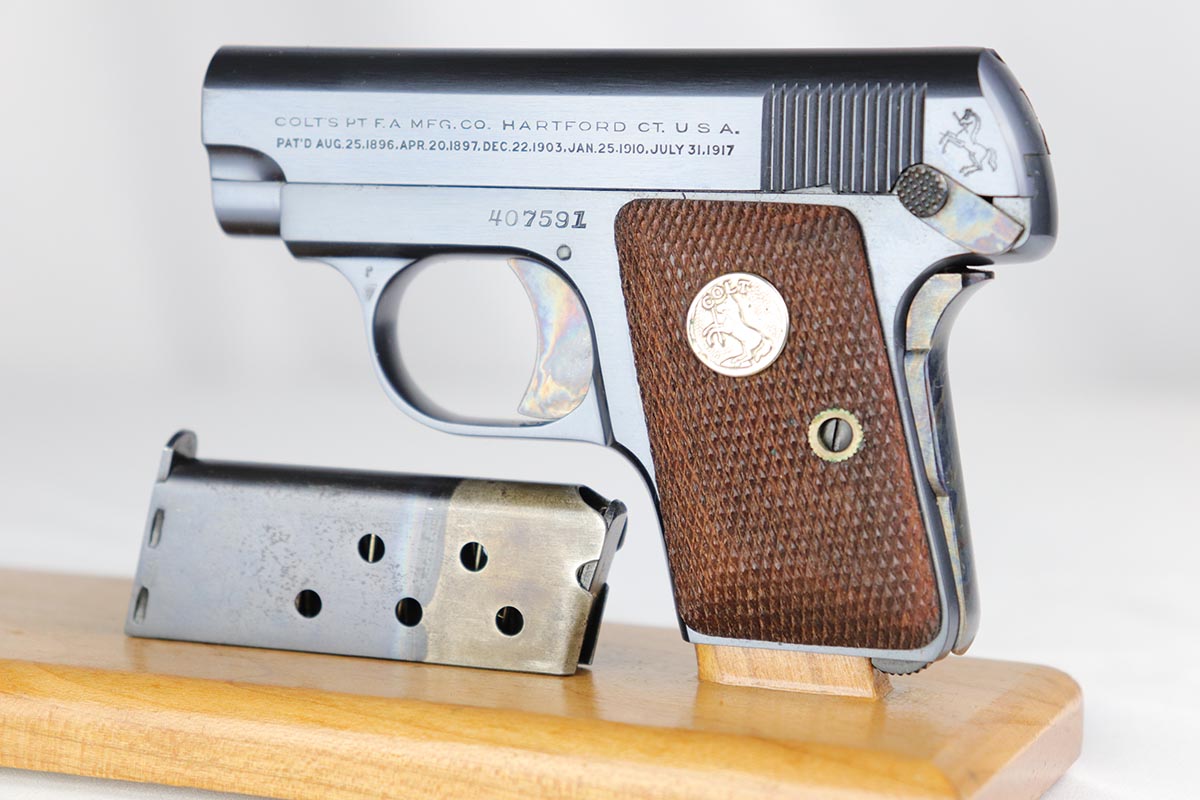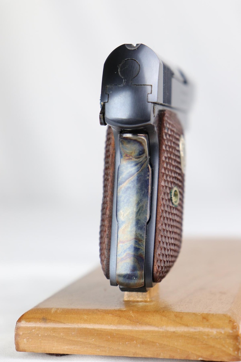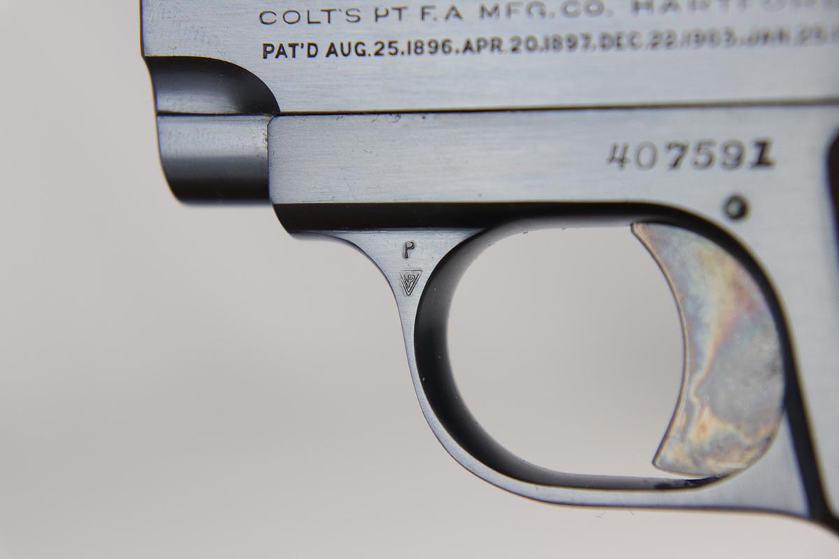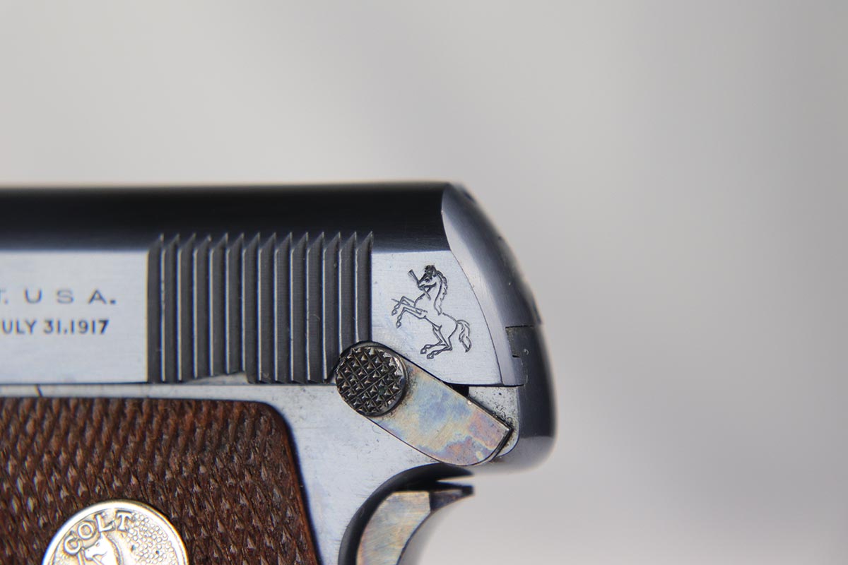 3/13/18 – This is a like new-in-box Colt model 1908 Pocket Pistol. The pistol is in superb condition with the original colt bluing and fire blued grip safety and trigger in minty condition. The grips are similarly mint with sharp edges and no issues. The original Colt box is not numbered to the gun, but has all original labels and is correct for this pistol – most likely is the original box the gun came in. The bore is similarly mint with no notable flaws. Guaranteed original.